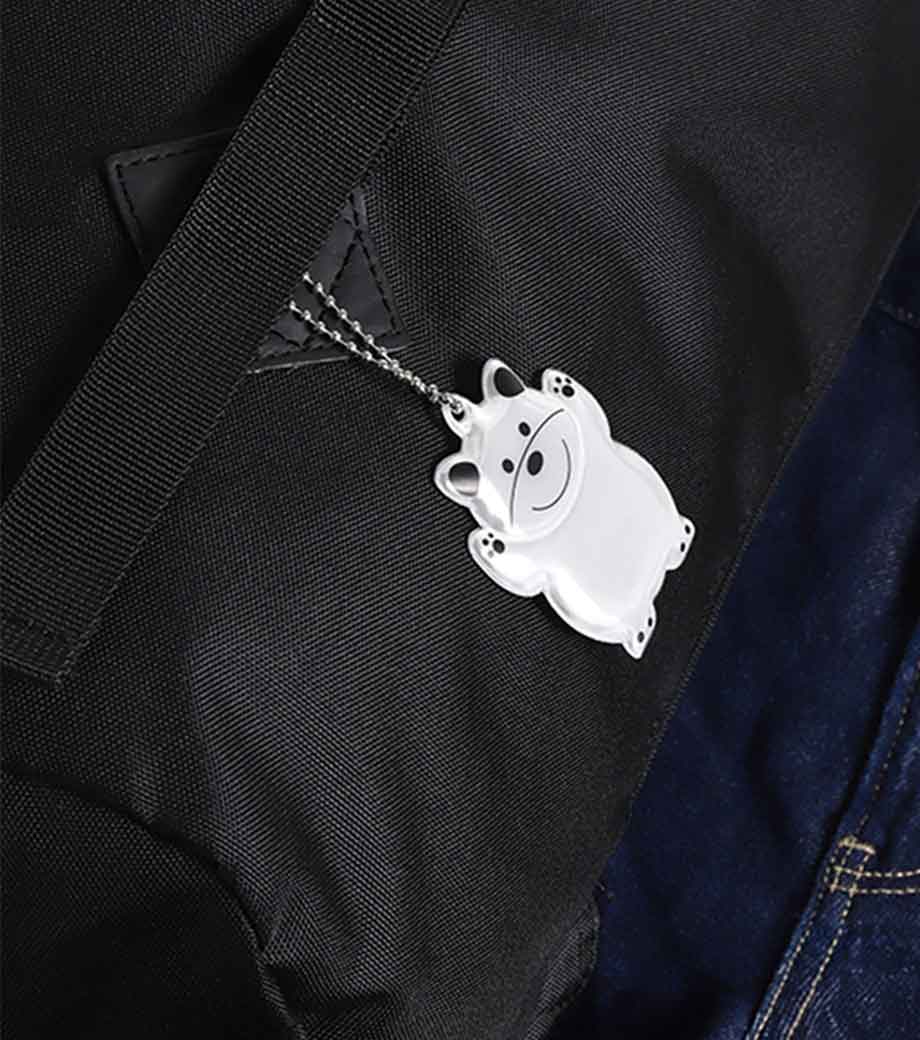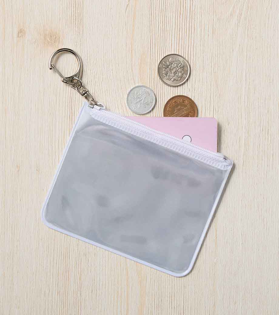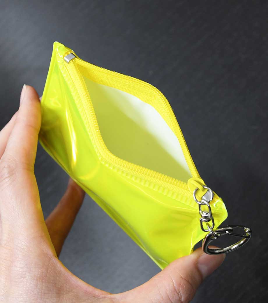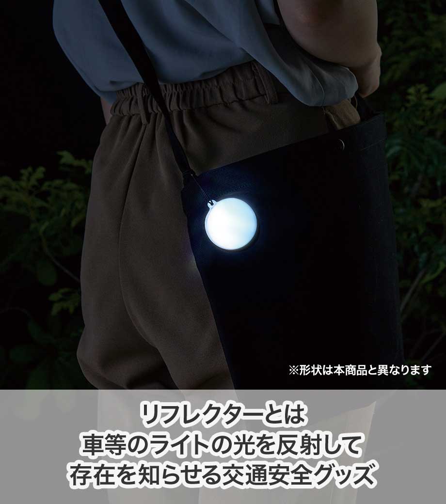 反射仕様のミニポーチ。車のヘッドライトや街灯の光を反射してキラキラ光り、歩行者の存在をアピールします。夜間や荒天時の外出時に交通安全グッズとして活躍します。小銭や鍵等のちょっとした小物の収納に便利なサイズ感。フック付きのキーホルダータイプなので、バッグやベルトループなど、さまざまな場所に簡単に取り付けられます。
