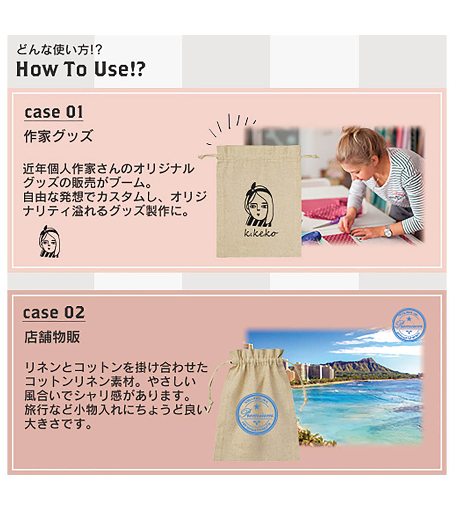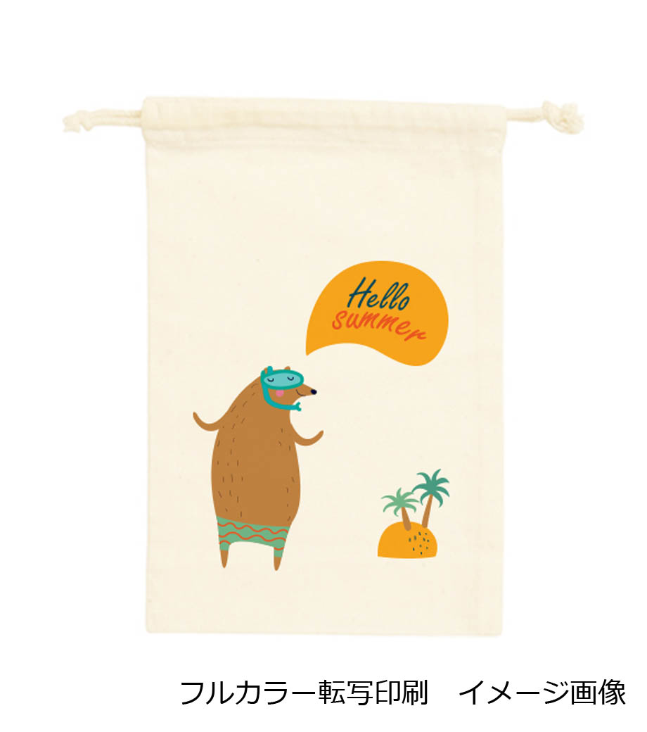 1色印刷・フルカラーの印刷ができるので、イラストやロゴをいれたかわいいオリジナル巾着が制作できます。周年記念やキャンペーンプレゼント用にショップの商品パッケージ・ギフト包装用にもおすすめです。カラフルな5色からお選びいただけ、小ロットでの注文も可能です。