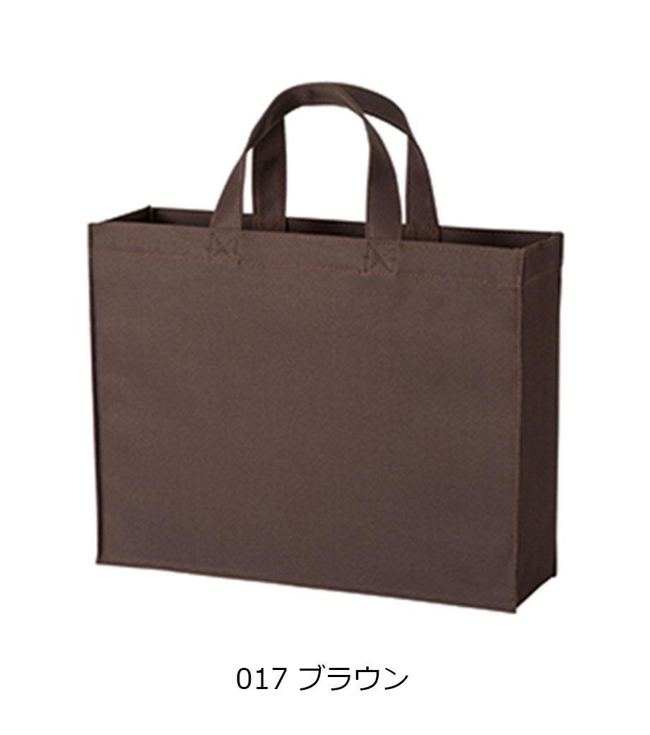 汚れや雨に強いポリエステル素材で作りました。おしゃれな色使いとシンプルなデザイン。底マチが四角いので大事な資料やカタログも折り曲げずに入ります。厚みがあるポリエステルなので自立するバッグ。荷物が出し入れしやすい横型トートは、ショッピングにもぴったりです。
