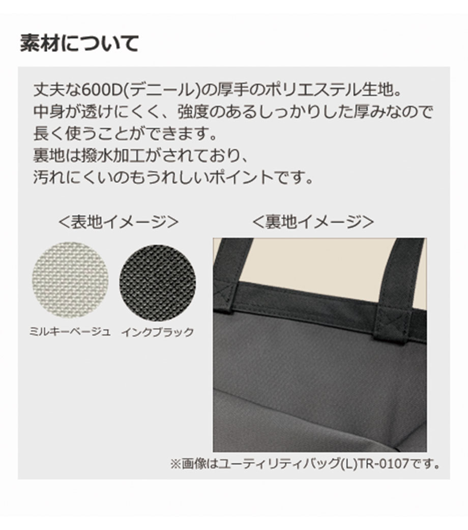 ユーティリティバッグ(M)ワイドは、名入れ部分が広く印刷ロゴが目立つ宣伝効果抜群のワイドトートです。いろいろな日常シーンでも気軽に持てる「ちょい持ち」サイズ。底マチが四角く自立タイプで、汚れや雨に強いポリエステル素材で作りました。