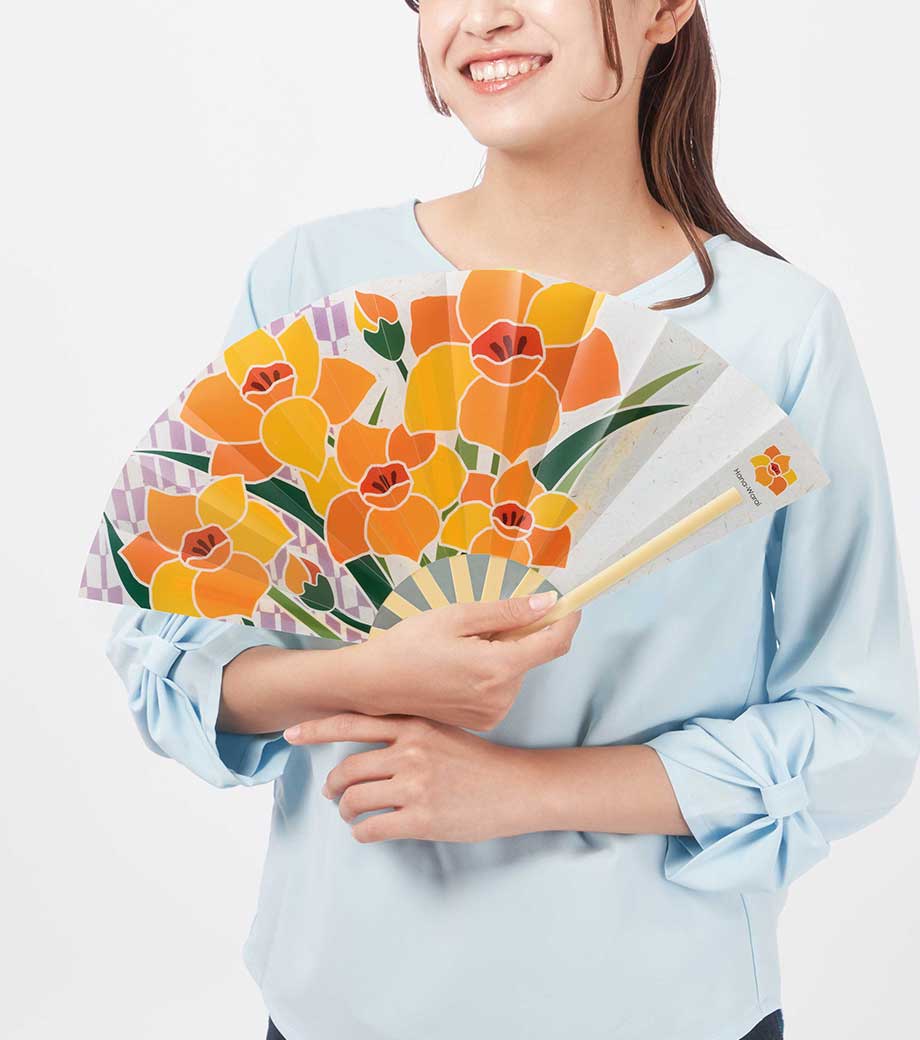 涼しげな和風花柄の椿・菊・花菖蒲・水仙の4種取混ぜでお届け。末広がりの形状が縁起の良い贈り物として人気の扇子。DMと一緒ポストインもできます。夏のイベントやキャンペーンにいかがでしょうか。
