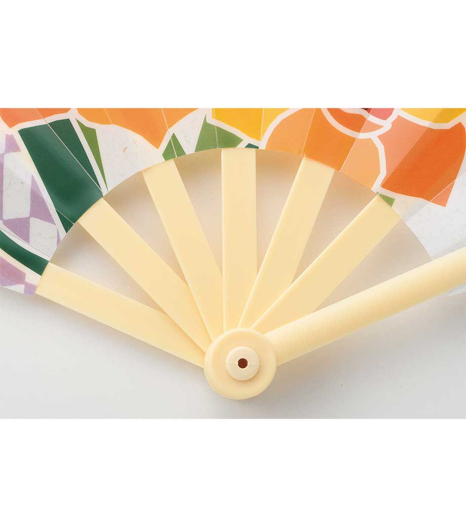 はなわらい 防滴扇子は水を弾くプラ素材を使用した大判サイズの扇子です。防滴仕様だから普段使いはもちろんビーチやプールでも安心。骨部分もPP素材を使用しているので、しなりがあり壊れにくく丈夫です。広い扇面で仰げば大風量!夏の暑さ対策にお勧めです。骨部分に1色のパッド印刷ができます。