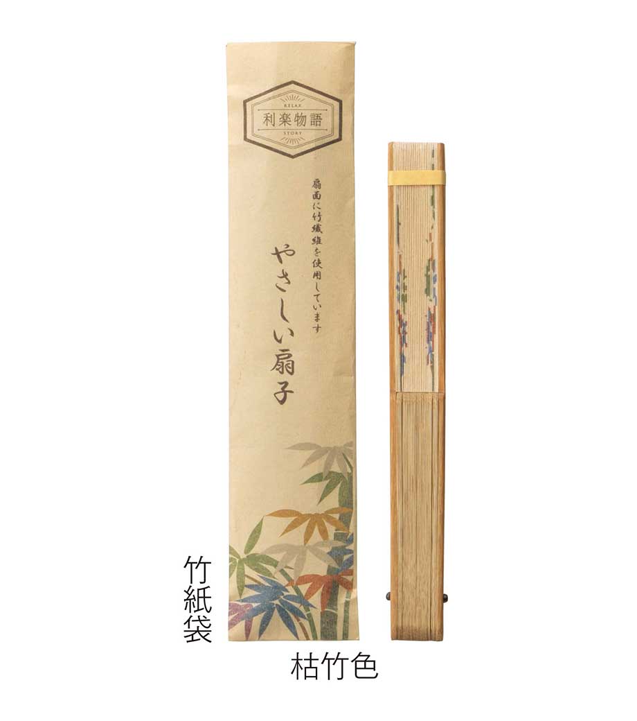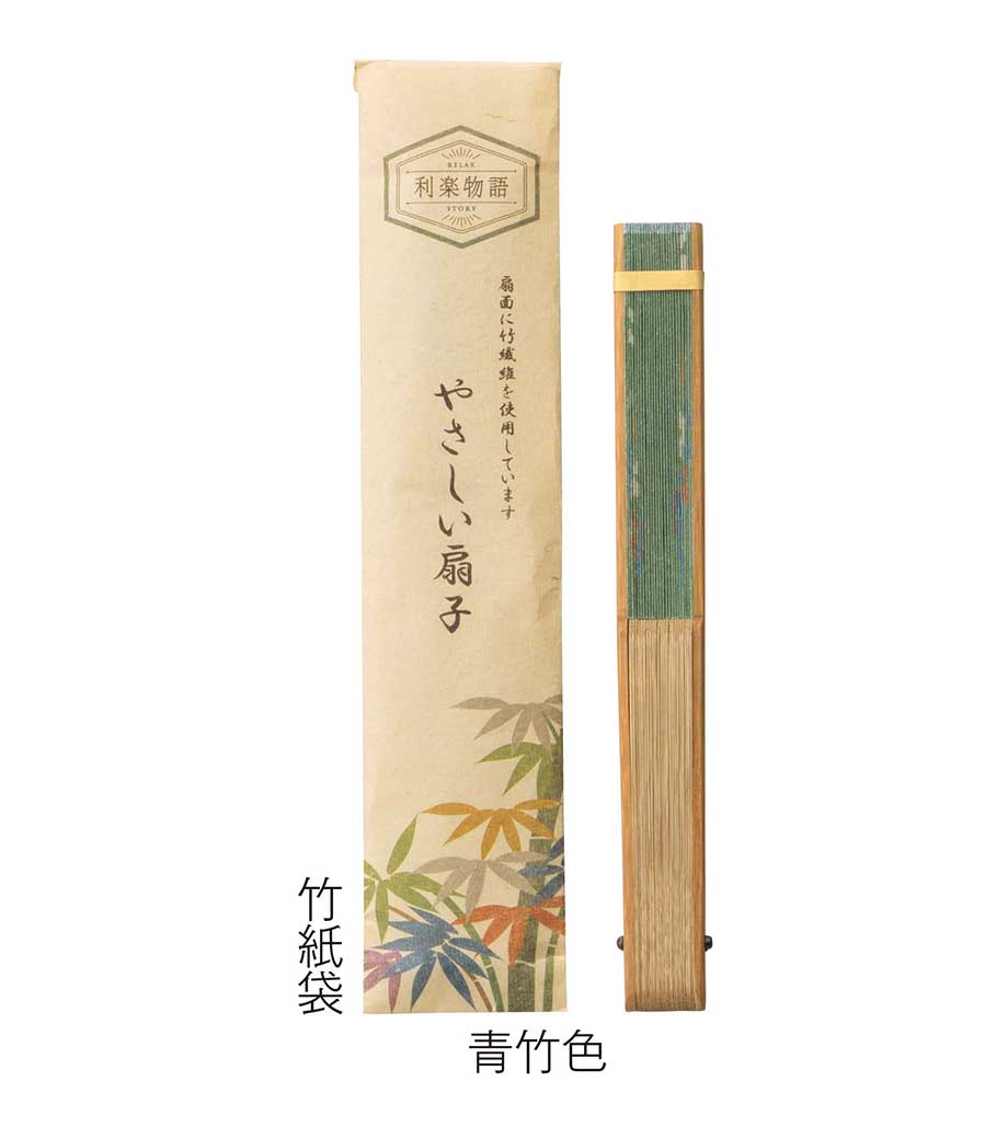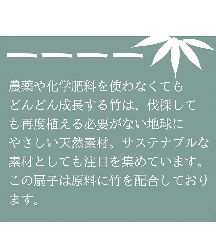 利楽物語 やさしい扇子1本は竹繊維配合のバンブーペーパーを使った扇子です。農薬を使わなくても成長する竹は、地球にやさしい天然素材。SDGs実現に向け、扇面・親骨・包装紙全てに使用しています。夏の定番である扇子は携帯にも便利。室内での暑さ対策はもちろん外出時の熱中症対策にもピッタリです。美しい竹柄とシックで涼感のある色合いで、世代・男女を問わずにオススメです。