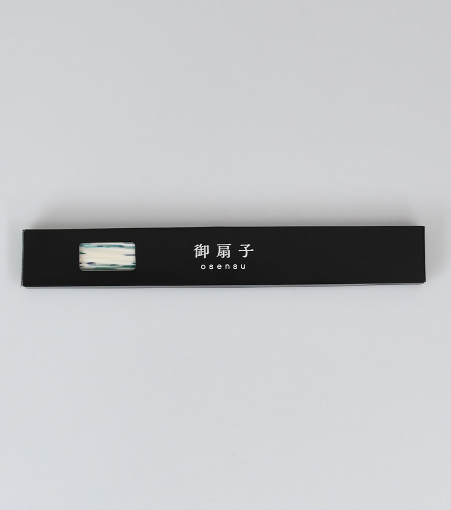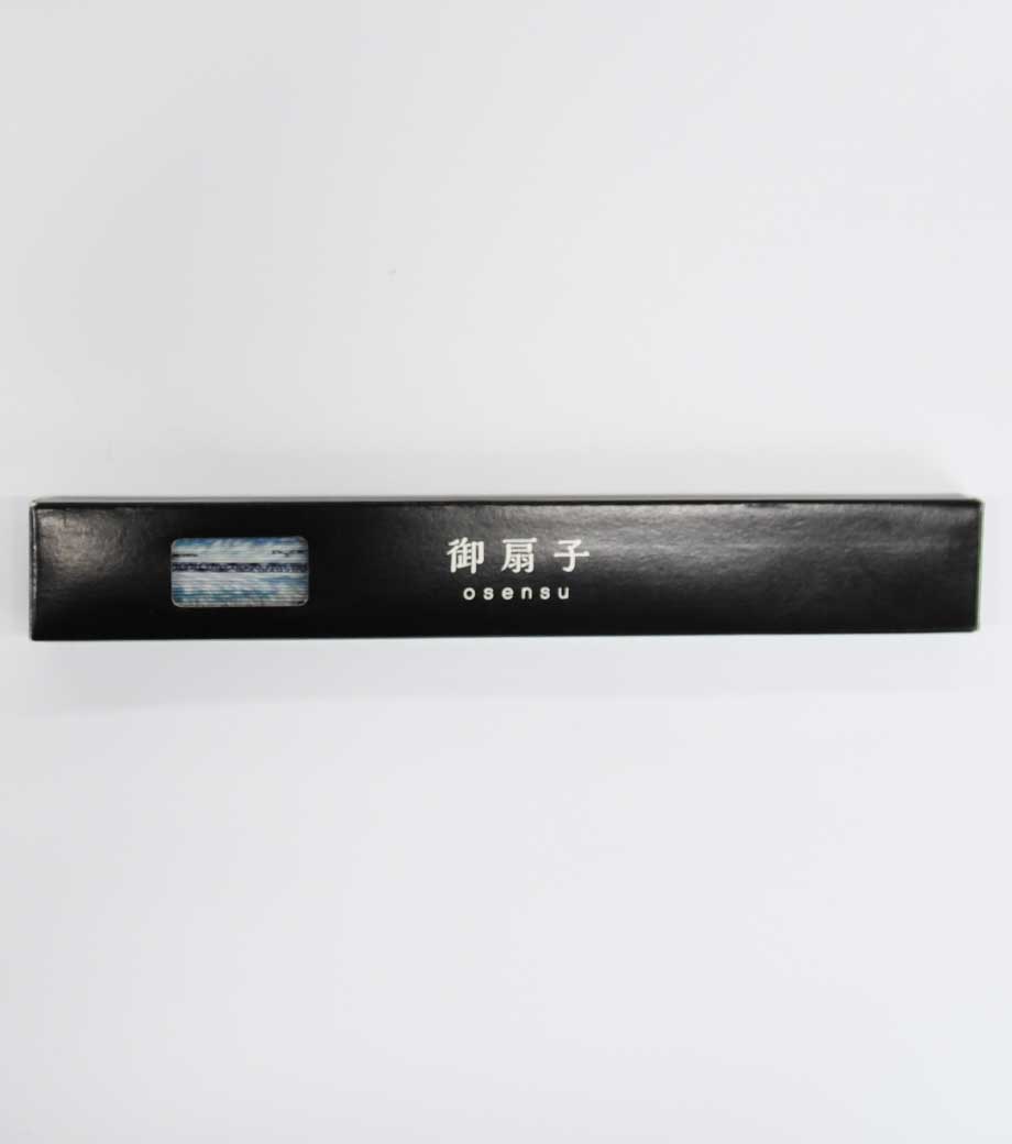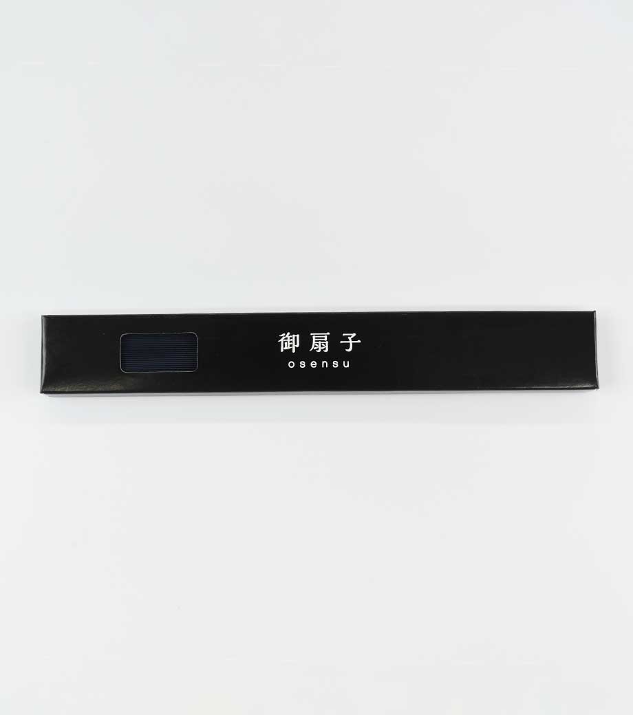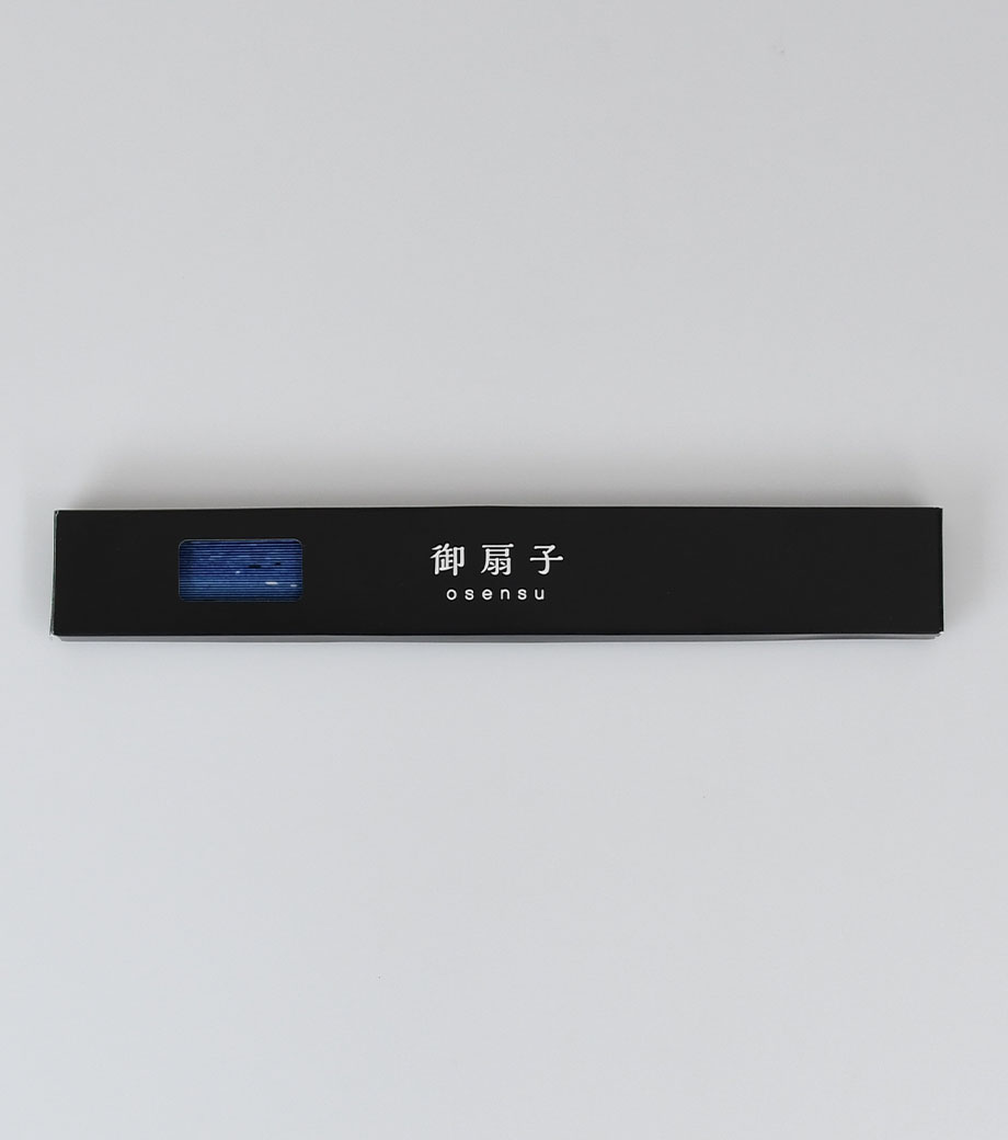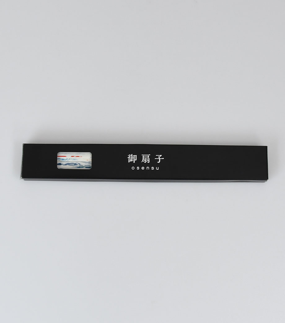 親骨にパッド印刷1色か、中骨にレーザー彫刻の名入れができます。そのまま贈答用として配れる、扇面の柄が見える窓付きの黒箱入りです。