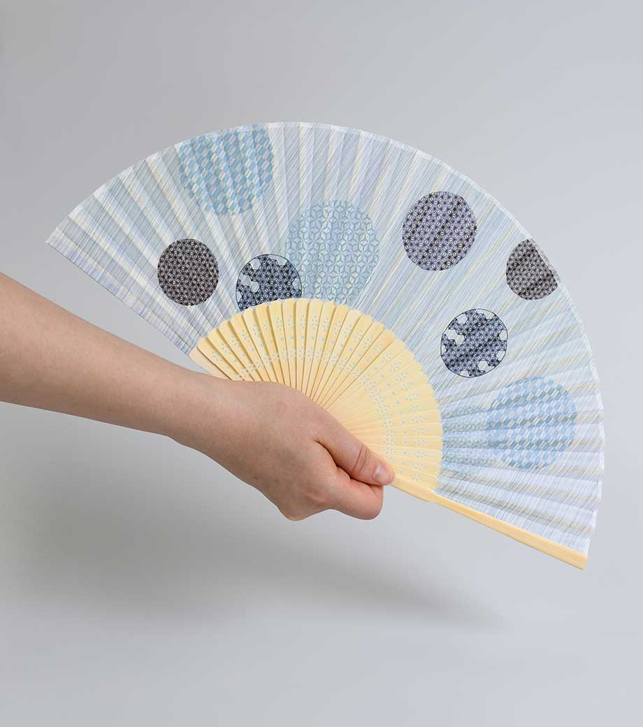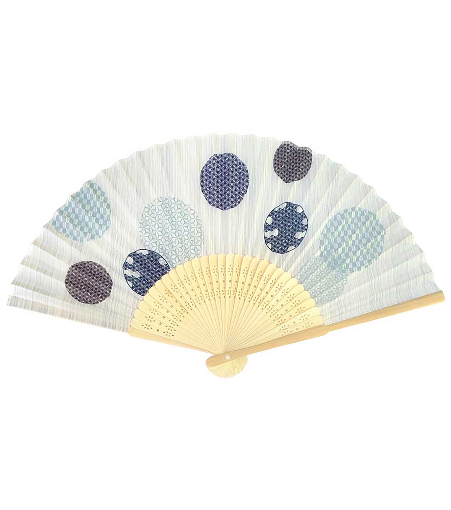 白竹扇子 てまりは、日本の伝統柄の矢絣や麻の葉文様のてまりが美しい扇子。骨組には清涼感のある白竹を使用し、淡い水色の扇面と合わせ見た目も涼やかです。男女問わず使用できる扇子は、展示会・イベントでの夏の定番ノベルティ。軽くかさばらず、電気を使わないエコアイテムなので、外国人向けの贈り物にも大変人気があります。
