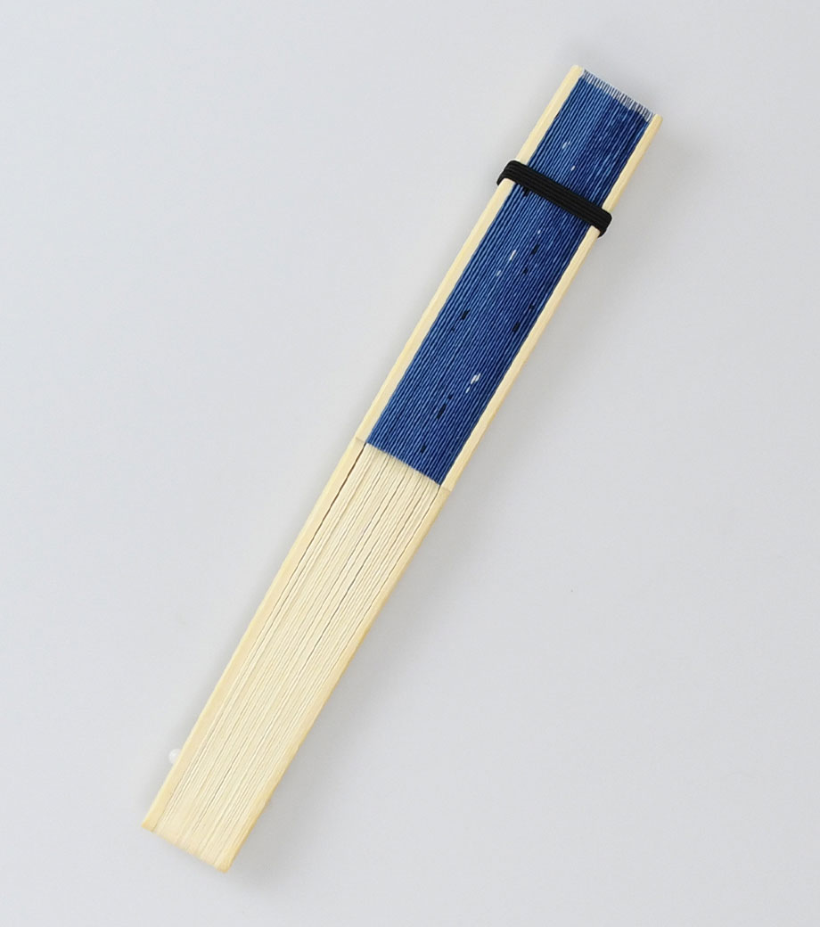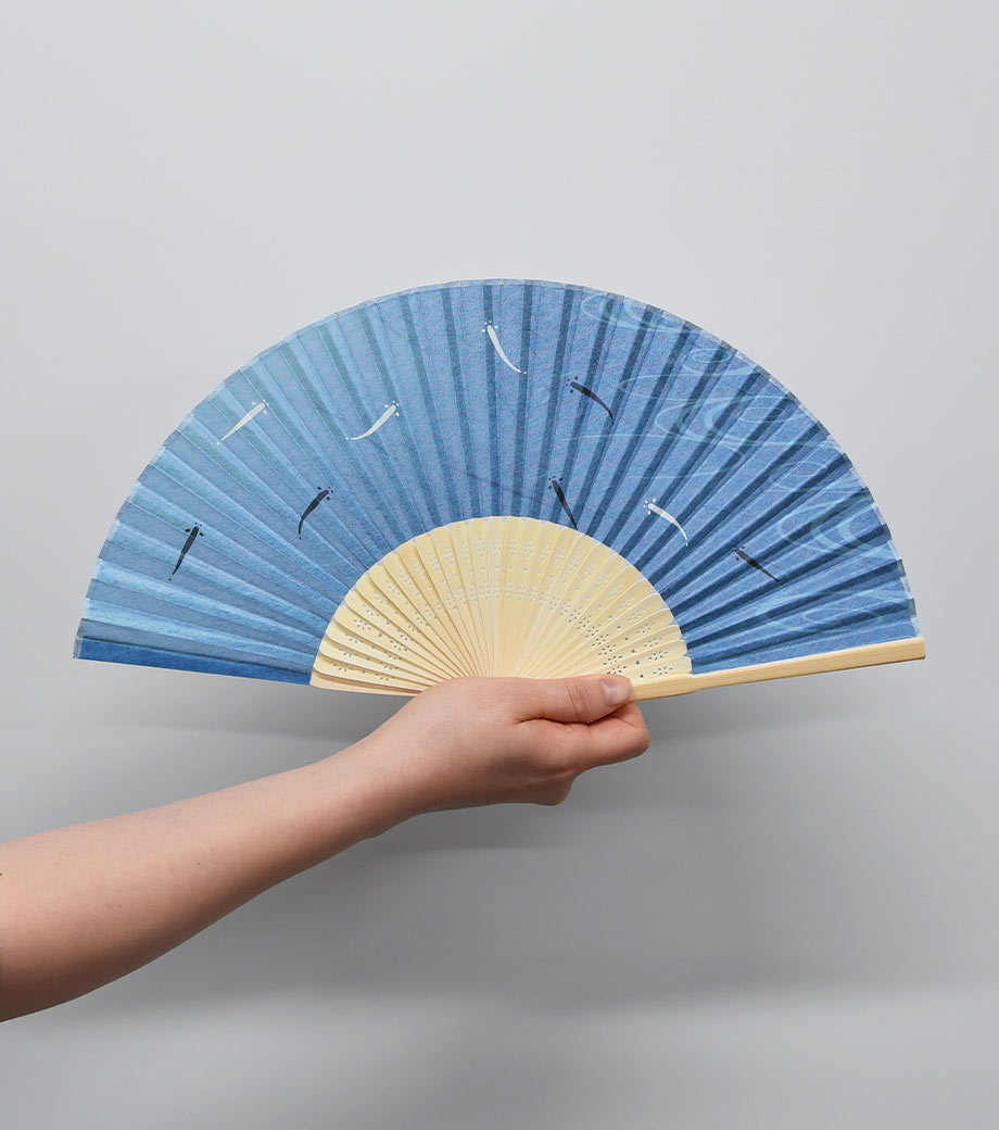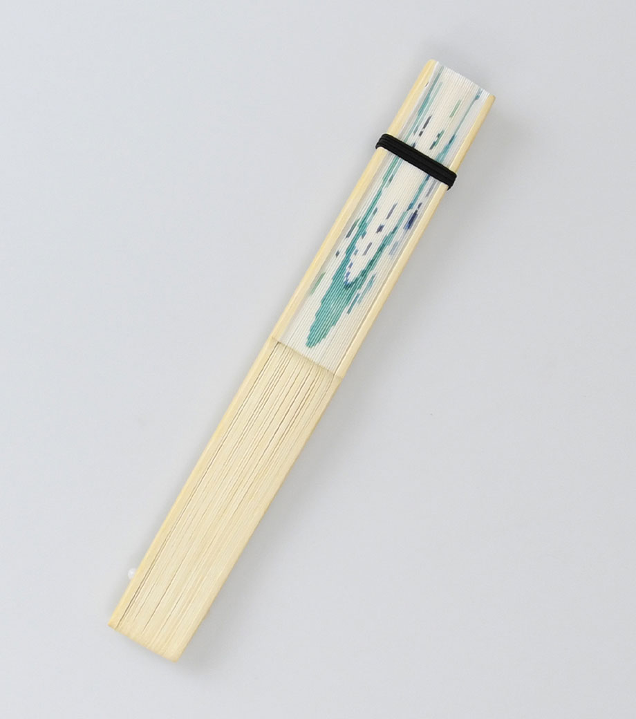 清流を泳ぐ鮎の姿を切り取ったような爽やかな扇子。骨組には清涼感のある白竹を使用し、青色の扇面と合わせ見た目も涼やかです。軽くてかさばらず、電気を使わないエコアイテム。ハンディファンのように稼働音もしないので、美術館や映画館でも周りに気を遣わず使用できます。
