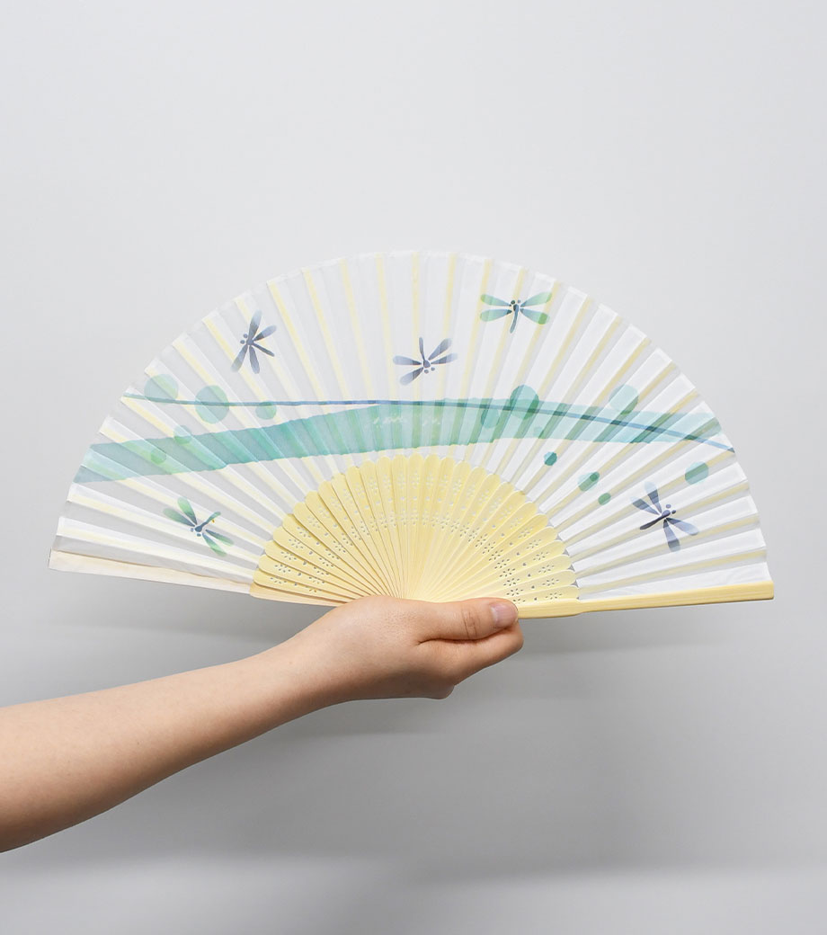 トンボは前にしか進まず退かないところから、勝利を呼ぶ「勝ち虫」として武士に好まれた柄。白地に淡い色柄でトンボが描かれ、男女共に使いやすいデザインです。折りたたんでバッグに入れられる扇子は、夏の暑さ対策として持ち歩くのにピッタリ!電池を使わないエコなクールアイテムです。