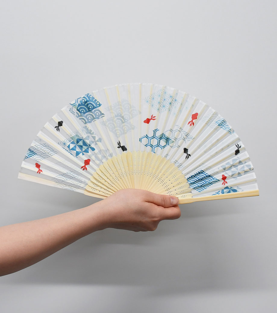 水中で泳ぐ赤と黒の金魚の姿を描いた愛らしい扇子。中国では金魚とお金が有り余る「金余」が同じ発音をすることから、金運の象徴、縁起物とされています。扇子は軽くかさばらず電気を使わないエコアイテム。外国人向けの贈り物にも人気です。