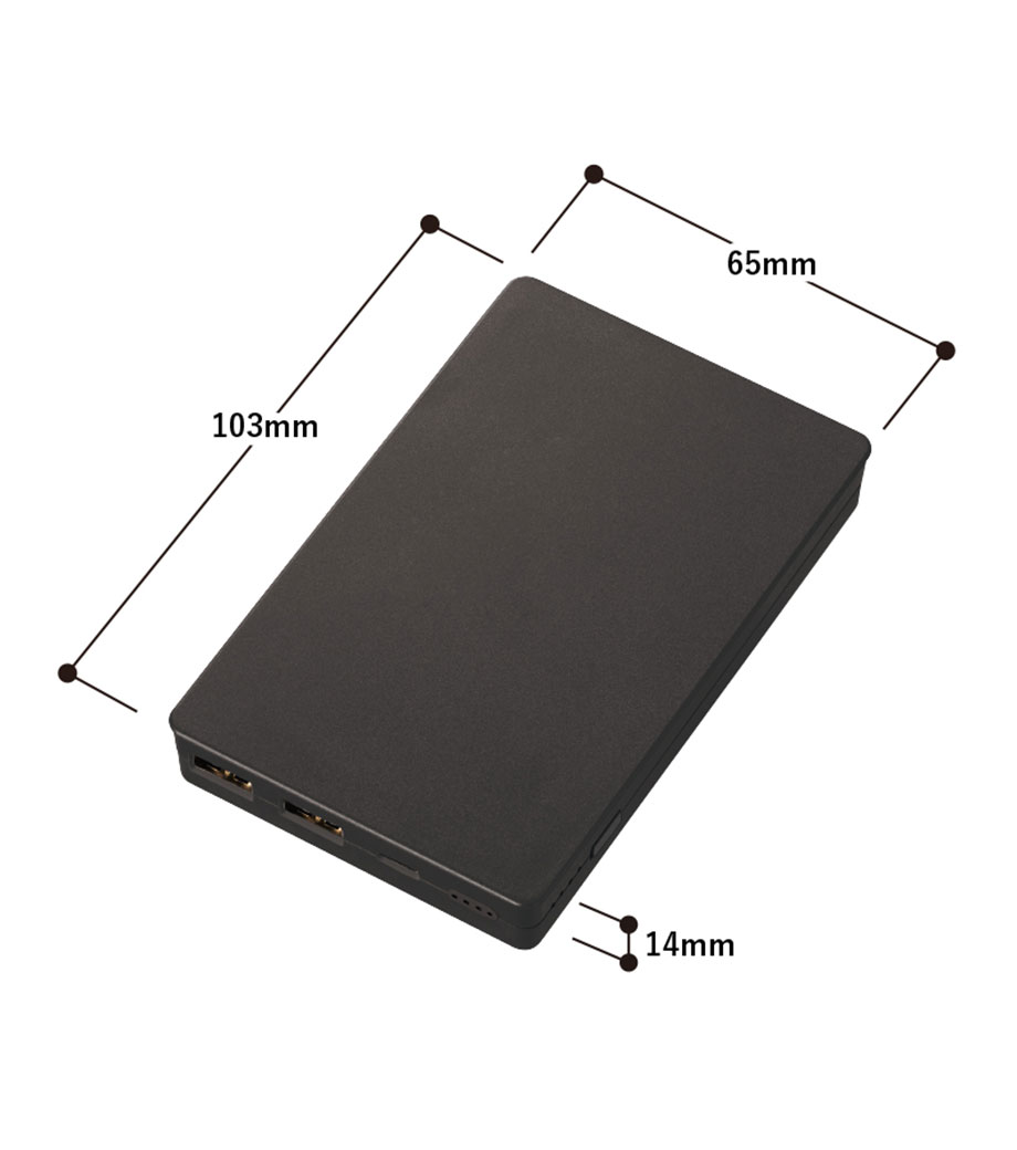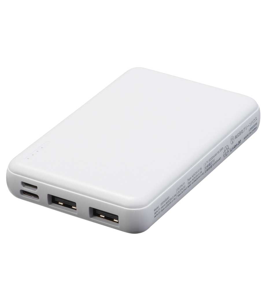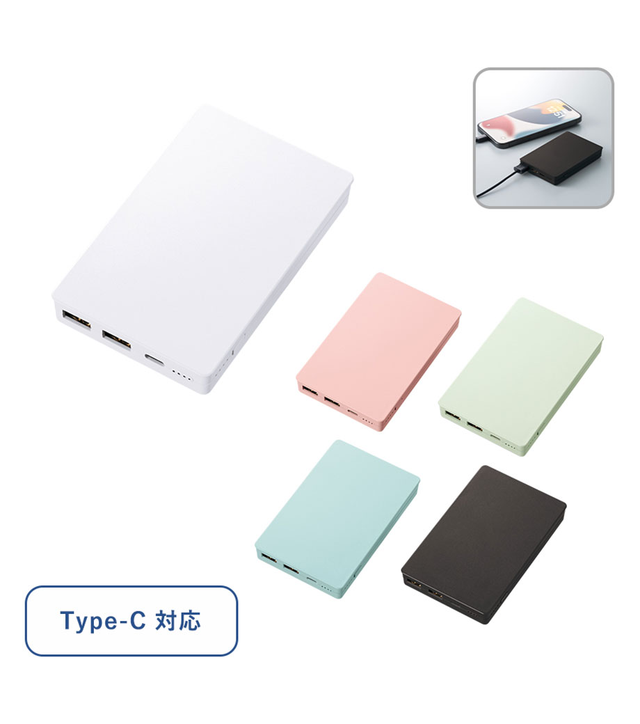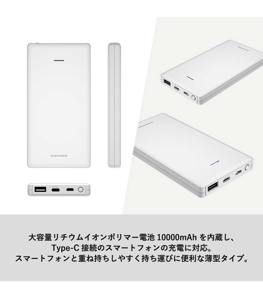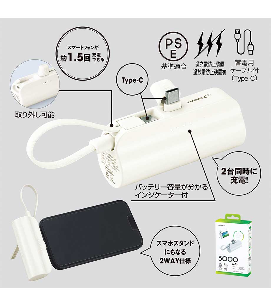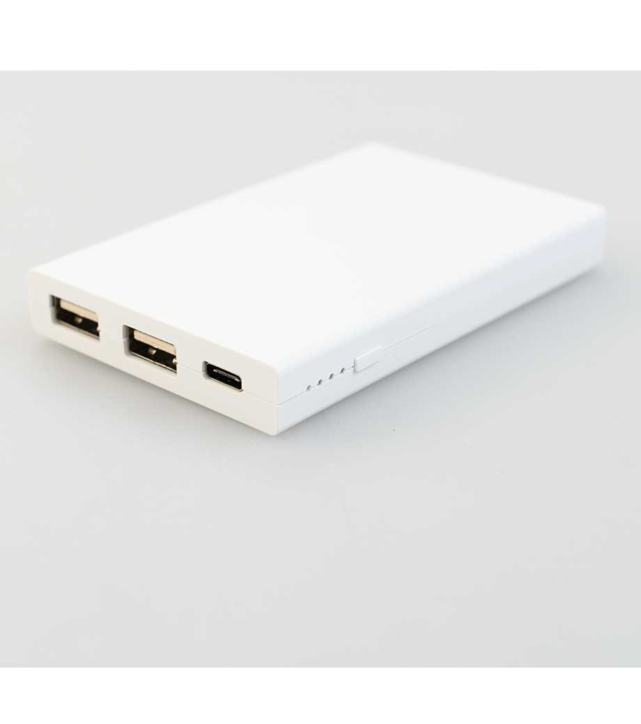 厚みわずか約13mm!世界最小クラスの急速充電対応モバイルバッテリーです。5000mAhながらも卵2個分ほどの軽さ。出力はType-Cが1ポート、Type-Aが2ポートあり3台同時充電可能。スマホ・イヤフォン・電子タバコなど複数の機器にお使いいただけます。高性能ICチップ搭載で、安心の過蓄電・過放電保護回路仕様。