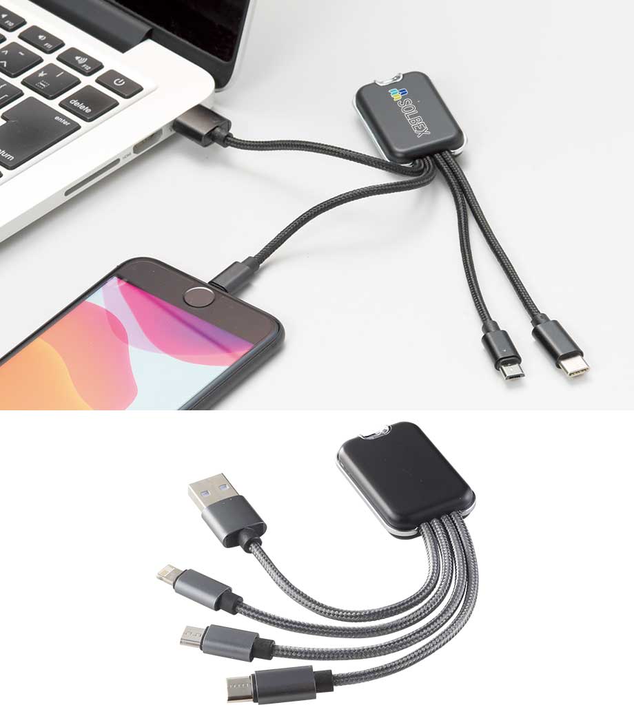 仕事や出張時にこれ1本持っていれば、スマートフォンやタブレットなどをパソコンから充電できます。複数のケーブルを持ち運ぶ必要がなくなって便利!カラビナ部分に1色印刷が可能。イベントや展示会で来場者の興味を引く、一味違ったノベルティが制作できます。