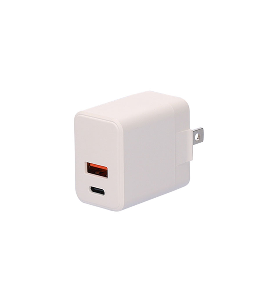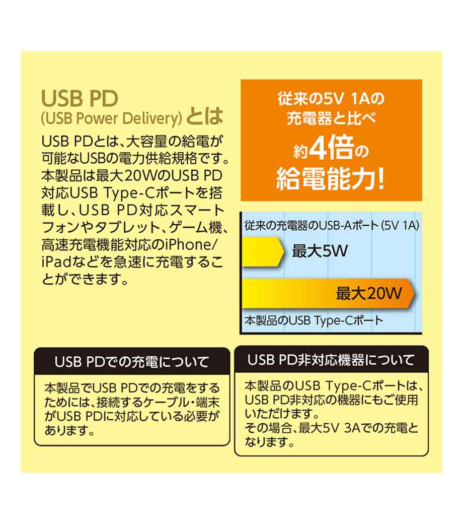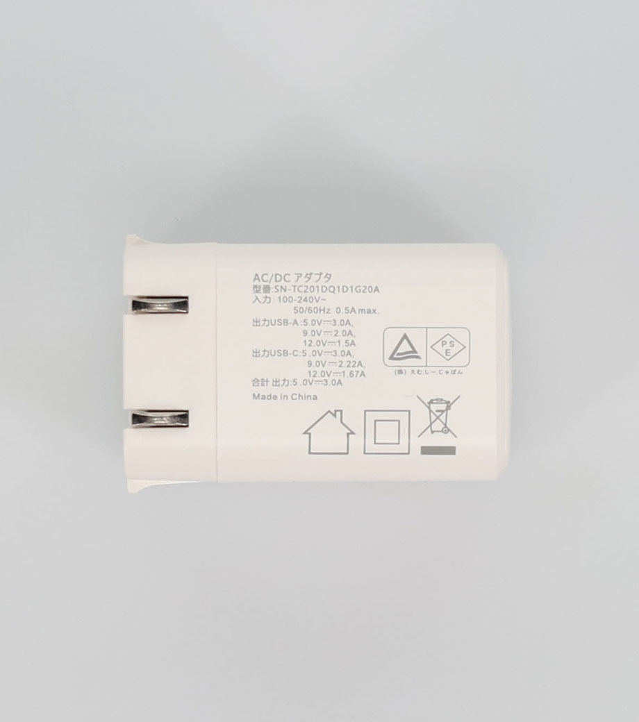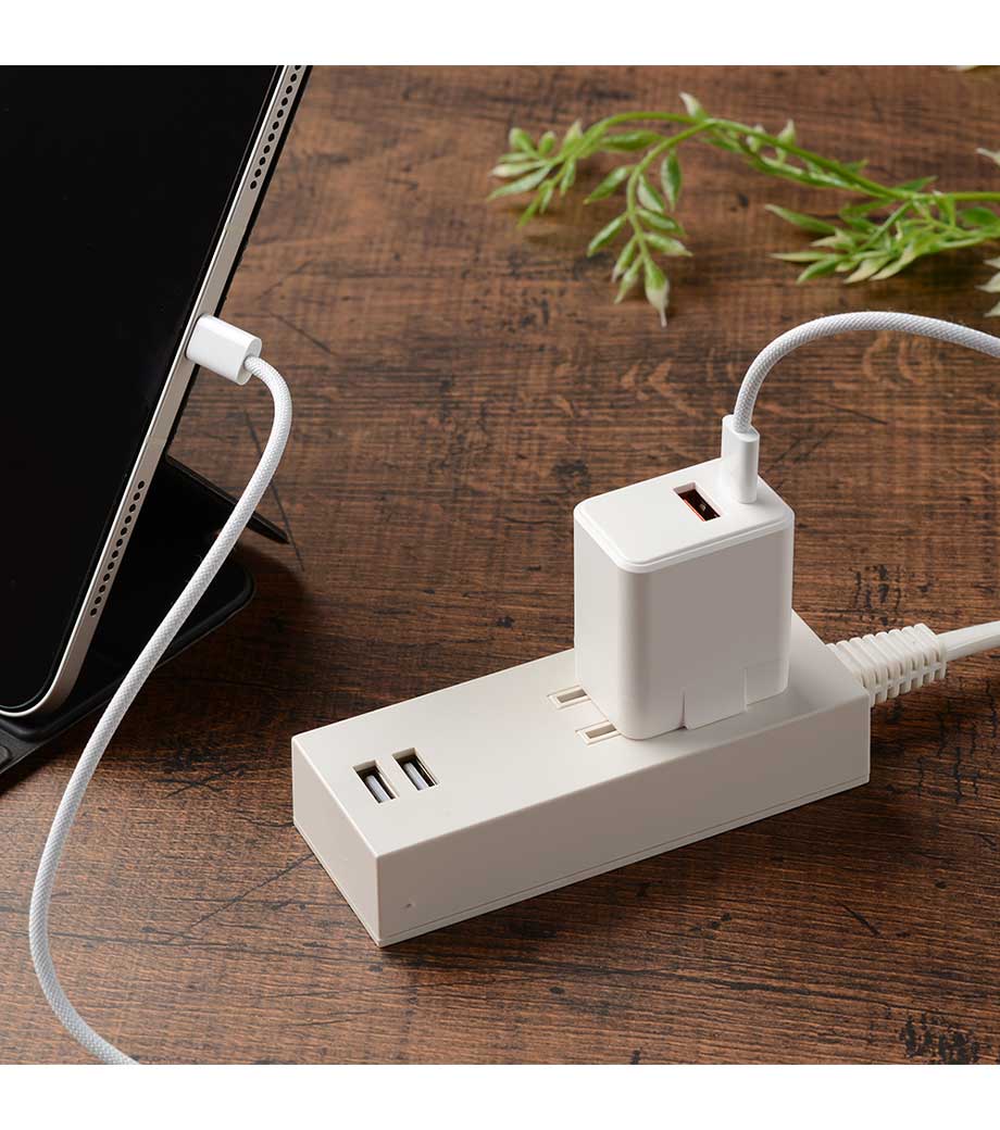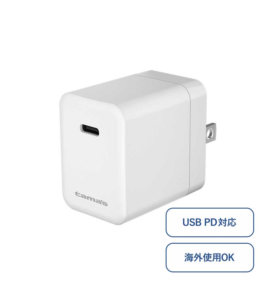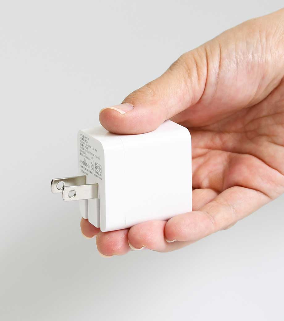 2台同時に急速充電ができるUSB-ACアダプタ。最大出力20Wでスマートフォンやタブレット、携帯ゲーム機の充電に最適です。Type-CポートはPD3.0対応、Type-AポートはQC3.0対応。折りたたみ式プラグで持ち運び便利です。