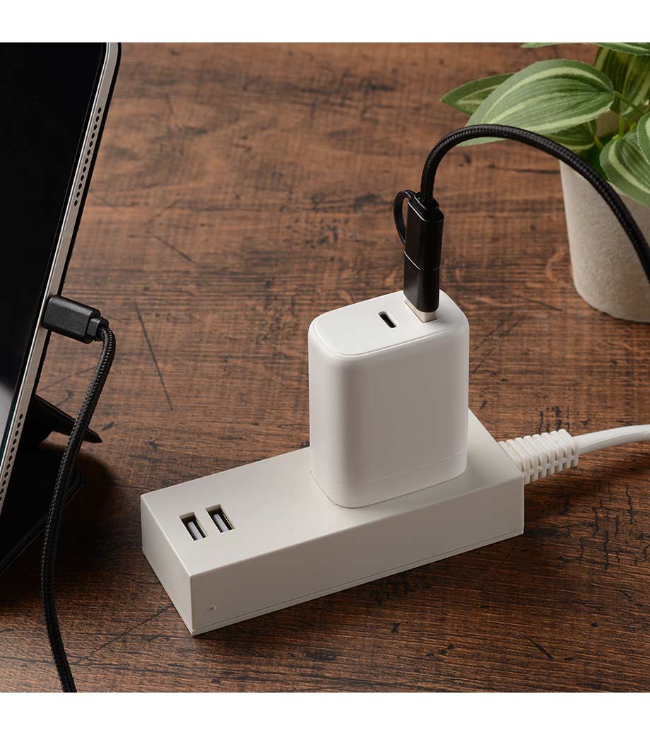 充電しながら動画視聴や連絡確認ができる、スマホスタンド付のチャージャーもご用意いたしました。スマホの置き場所が決まるとデスクもすっきり!