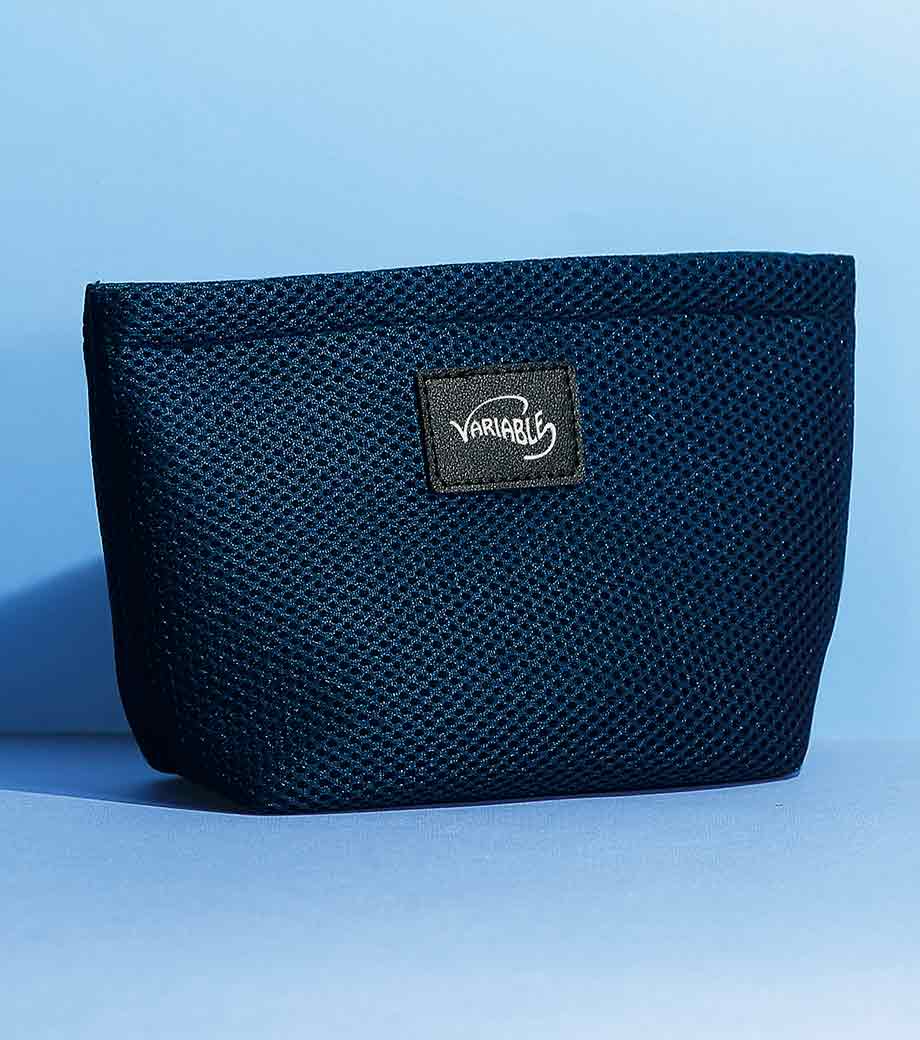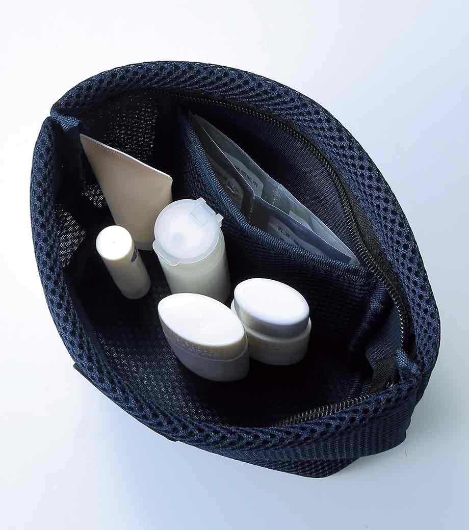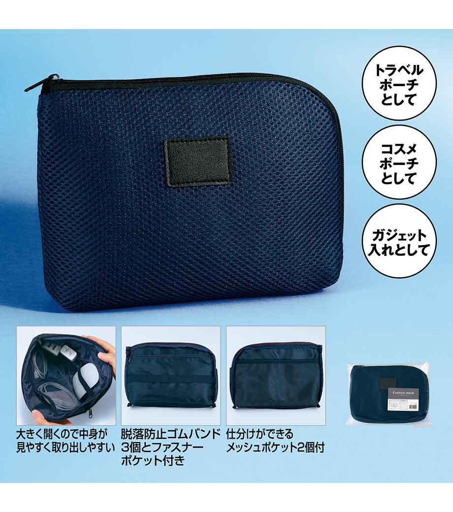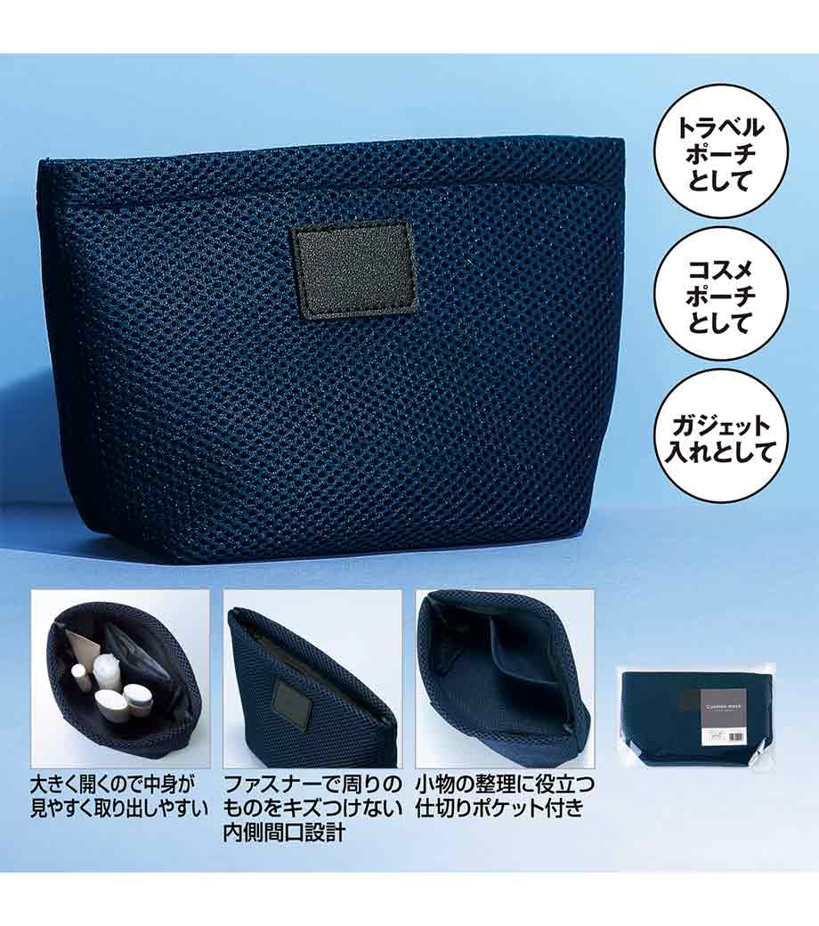 クッション性の高い肉厚なメッシュ生地を使用した、シンプルなマチ付きポーチです。コスメやガジェット類などこまごましたアイテムを収納でき、整理に便利な内ポケットが付いています。自立するので出し入れしやすいのも嬉しいポイント。ファスナーが間口の内側にあり、バッグに入れても他の荷物を傷つけにくいです。普段使いはもちろん旅行用ポーチにもおすすめ。