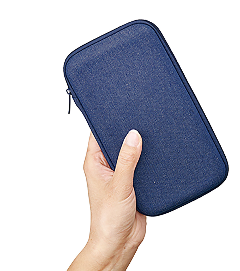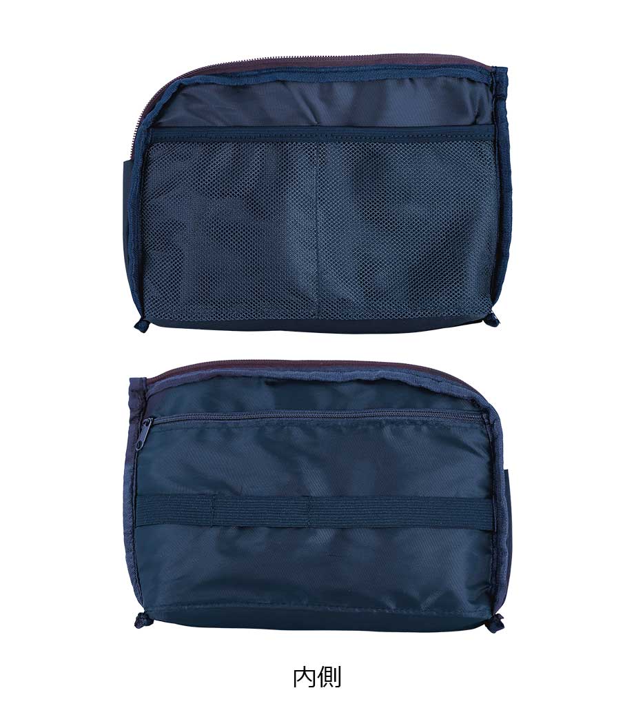 すっきり収納マルチポーチは、バッグの中で場所を取らない薄型でシンプルなデザイン。内側左はペンやコスメの分別にピッタリのゴムバンド、右は通帳サイズのポケットと中身が見えるメッシュポケット付きです。三面ファスナーでパカッと開き何が入っているか一目瞭然。イヤホンやSDカードのような小物もすぐ見つかります。ガジェットポーチや化粧ポーチなどアイデア次第で使い方が広がります。