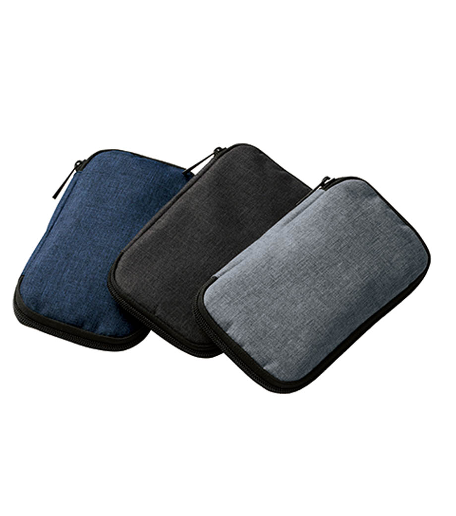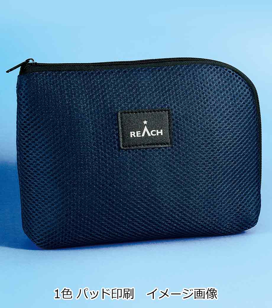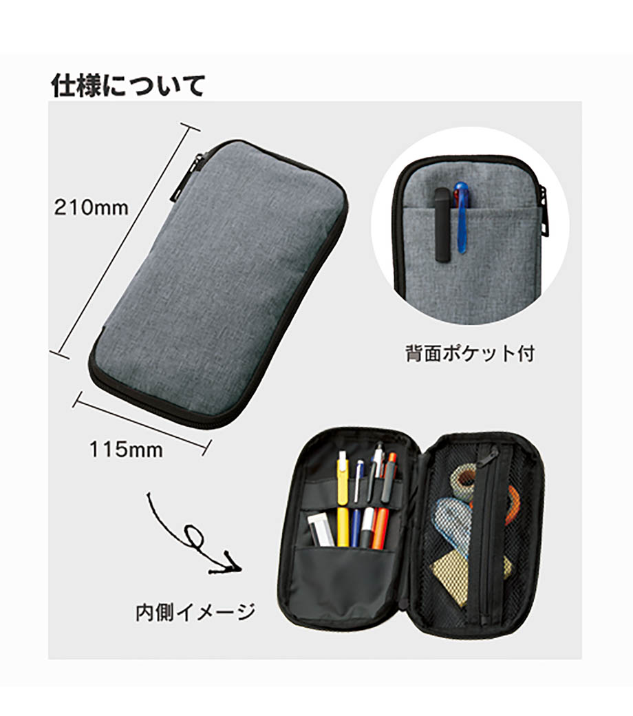 表面は霜降り調の杢調生地(メランジ)で、シンプルながらスタイリッシュ。男性向けのノベルティにも最適な、機能性とザインを両立した大人のアイテム。名入れロゴ印刷で、オリジナルポーチを製作できます。アパレルショップなどの販促品にも。