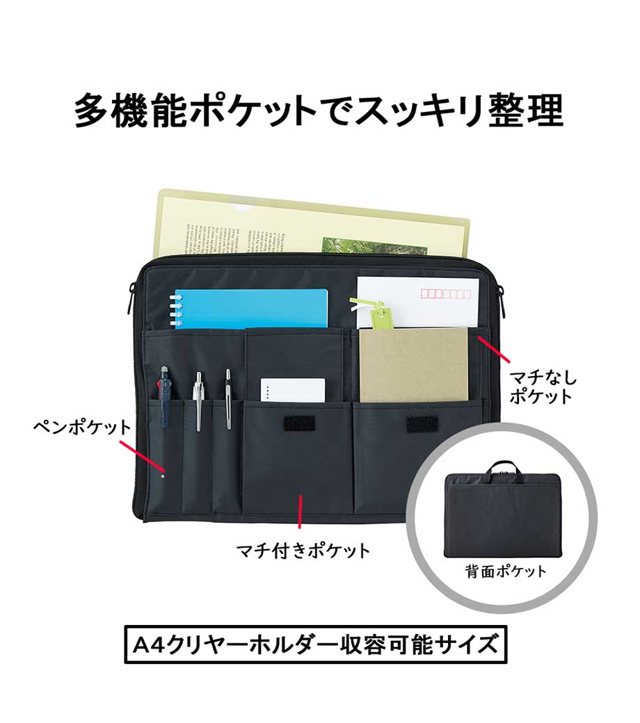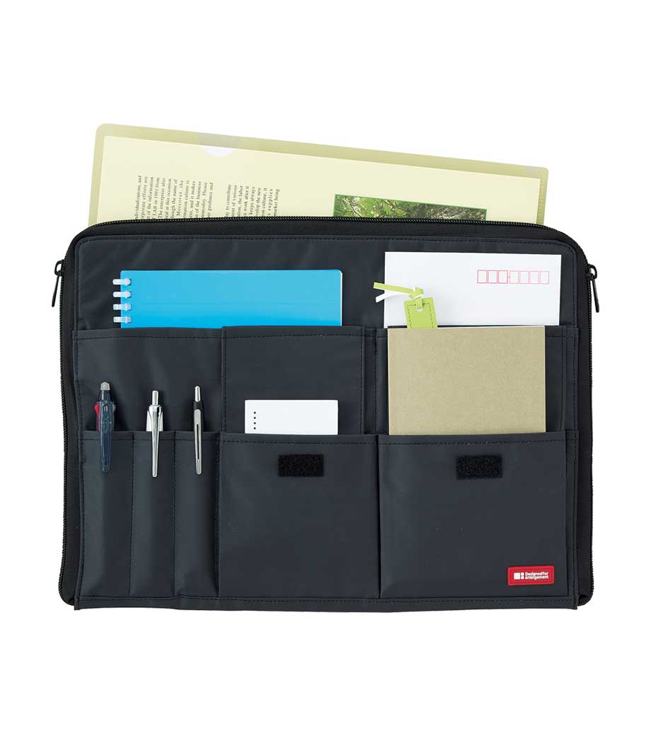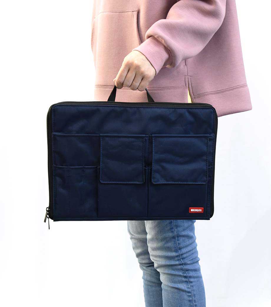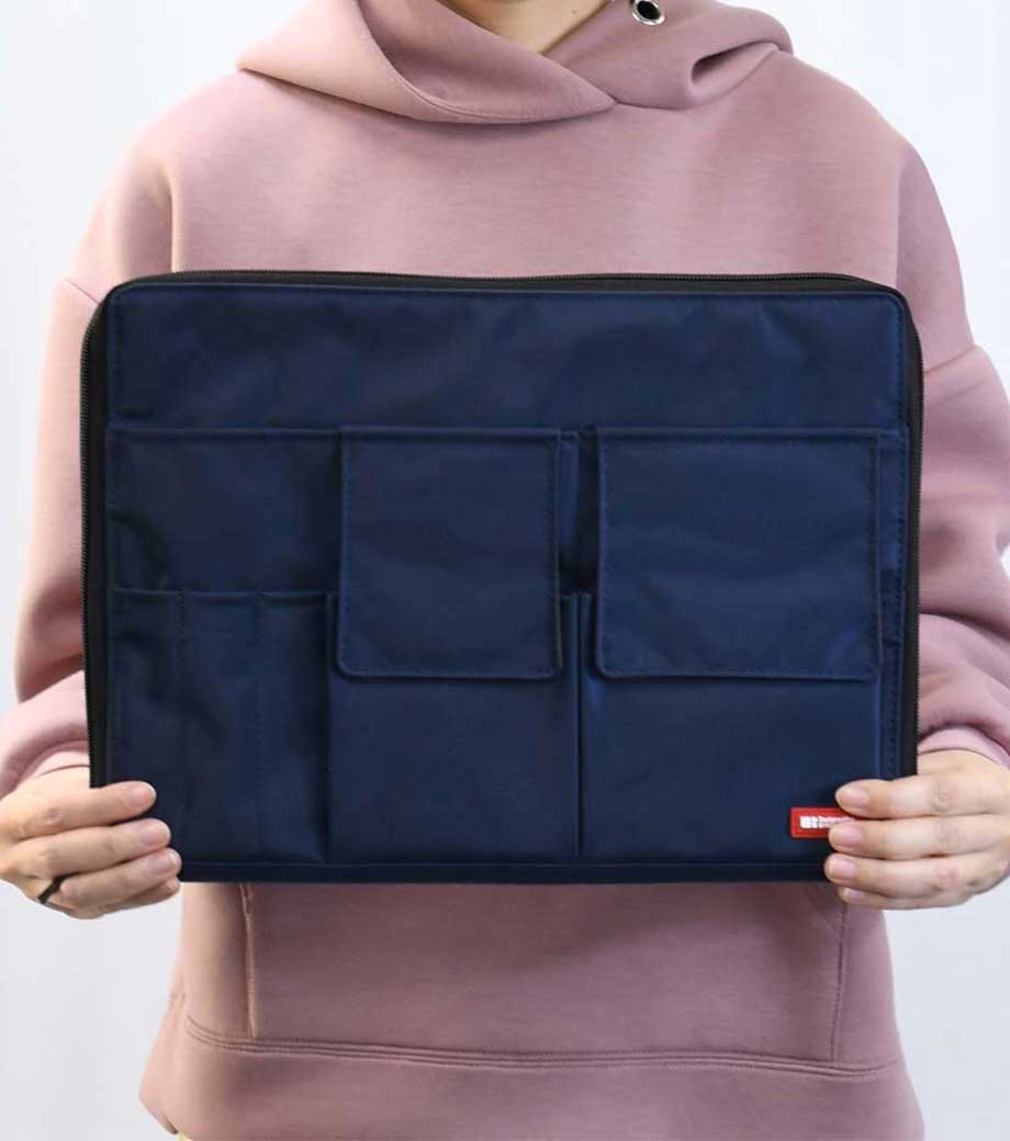 バッグ イン バッグは、タブレットPCケースとして使える収納バッグ。ポケット数が多く、通勤・通学時の鞄の中をスッキリ整理できます。バッグ内にはA4クリアファイルも収納可能です。薄型13インチ程度のタブレット端末・PCが入ります。表面にはペンやモバイルバッテリー、文庫本など小分けに収納できるポケット付き。フラットタイプなので鞄の中に入れてもかさばらず持ち運びに便利です。しっかりとハリのある素材で2mm厚のクッションが端末を保護してくれます。このバッグひとつ持ち出せばどこでも作業がはかどりますね。