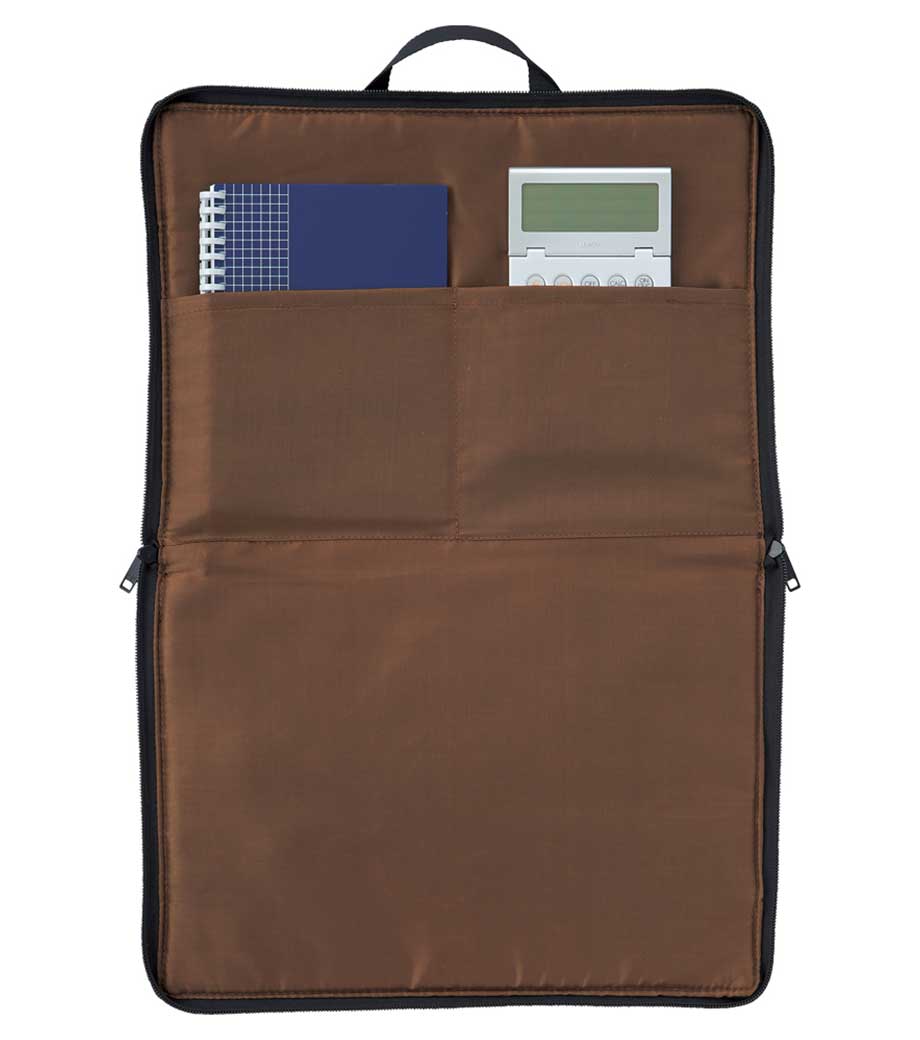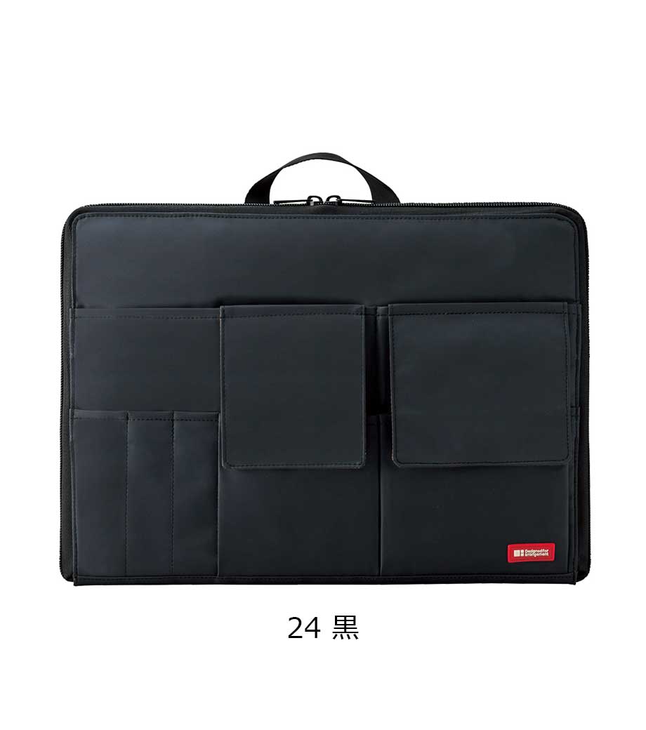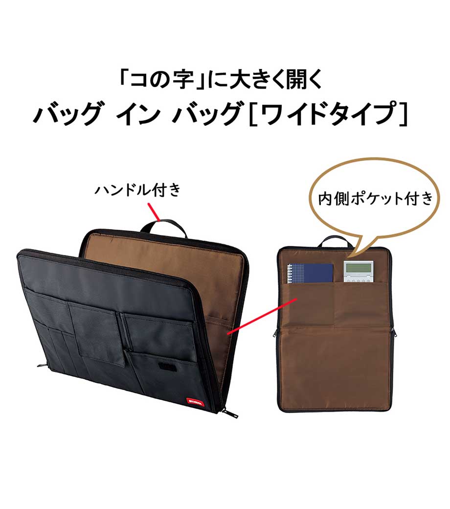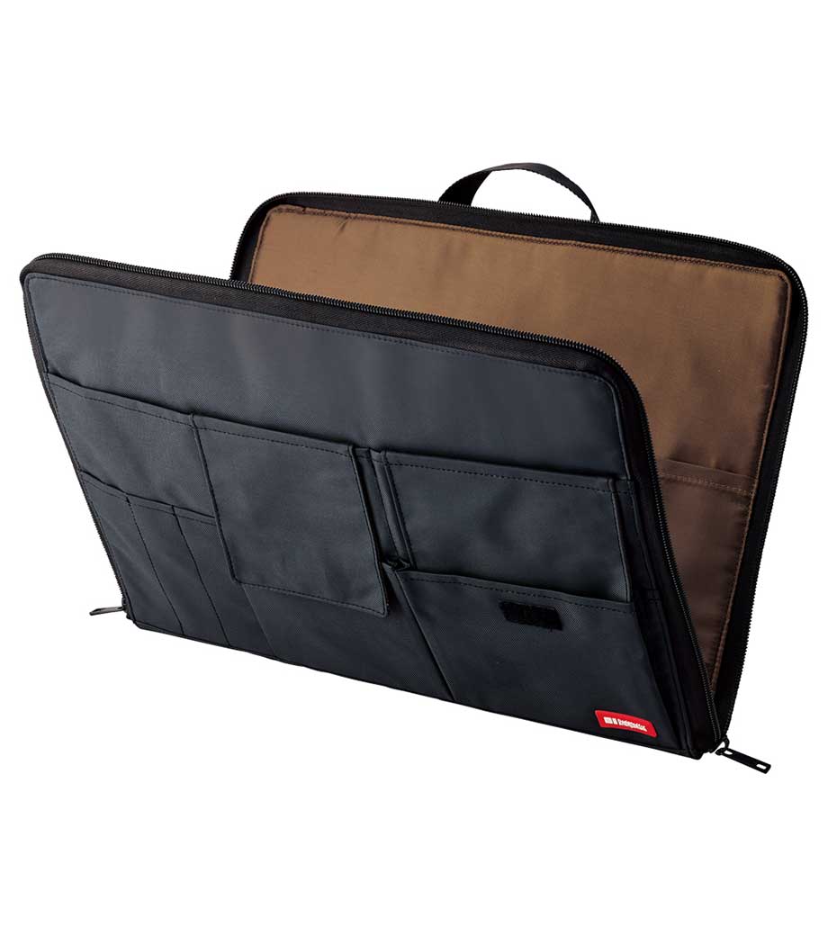 バッグ イン バッグは、タブレットPCケースとして使える収納バッグ。ポケット数が多く、通勤・通学時の鞄の中をスッキリ整理できます。バッグ内にはA4クリアファイルも収納可能です。薄型13インチ程度のタブレット端末・PCが入ります。表面にはペンやモバイルバッテリー、文庫本など小分けに収納できるポケット付き。フラットタイプなので鞄の中に入れてもかさばらず持ち運びに便利です。しっかりとハリのある素材で2mm厚のクッションが端末を保護してくれます。このバッグひとつ持ち出せばどこでも作業がはかどりますね。