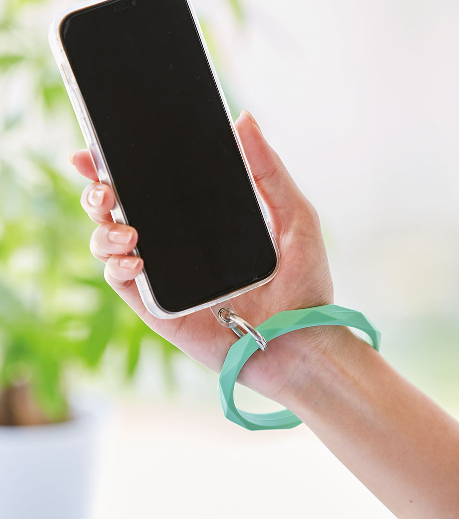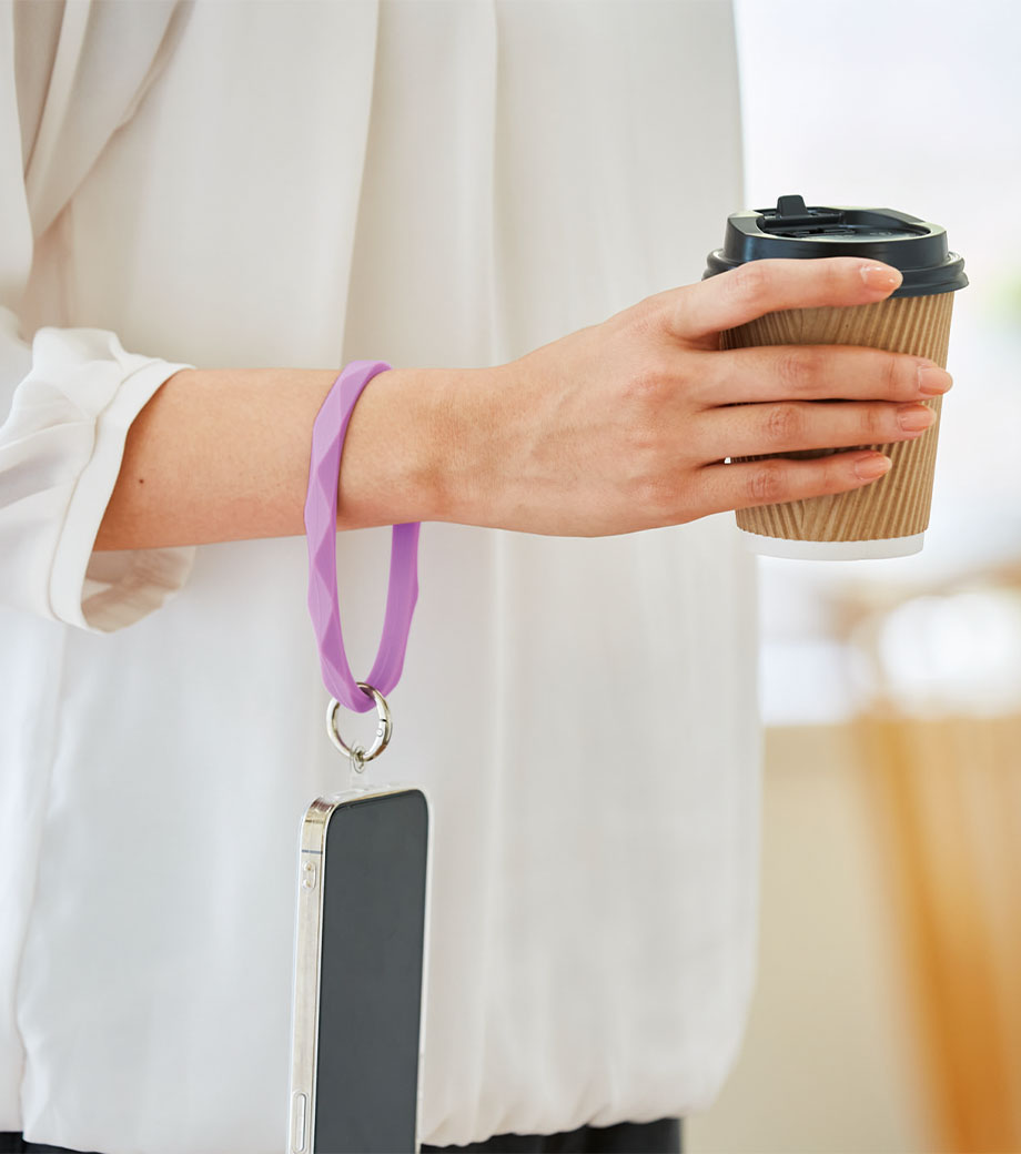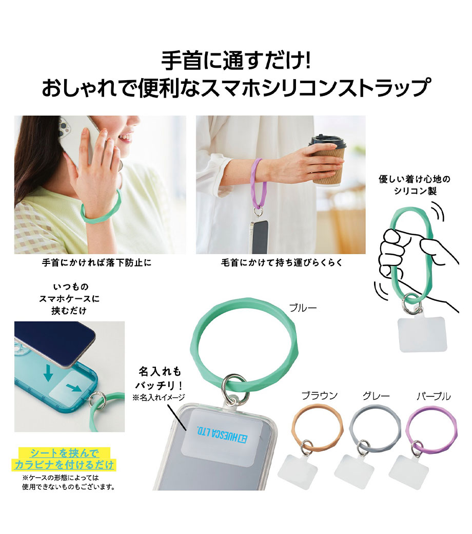 スマホケースの間に透明シート部分を挟むだけで簡単にストラップとして使えます。輪っか部分に手首をかければ、持ち運びが楽になり、落下防止にも効果的。柔らかく付け心地の良いシリコン製です。目立つストラップのおかげで、バッグの中で埋もれがちなスマホもすぐに見つかります。安価でばらまき配布に最適なうえ、トレンド感のあるノベルティとして人気です。