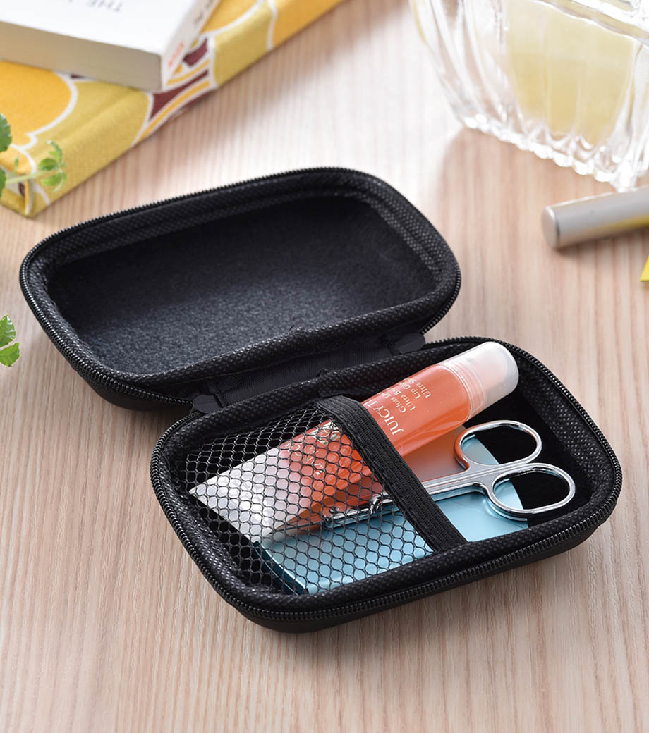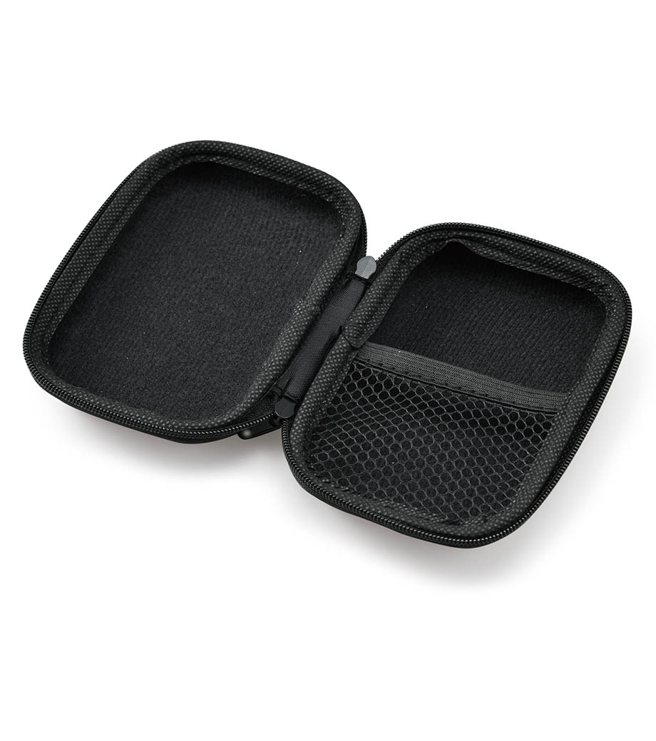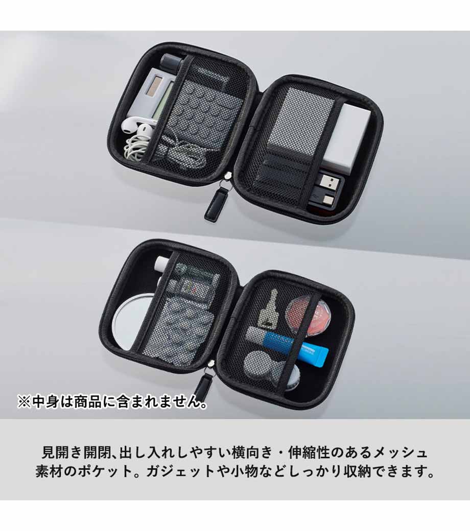 マルチハードケース(カラビナ付き)は小物の収納・持ち運びに便利なアイテム。片手に収まるぐらいのサイズ感です。ケースの内側、片面には中身を仕分けることができるメッシュポケットが付いています。イヤホンやコード類などを収納したり、ピルケースとしても使えますよ。