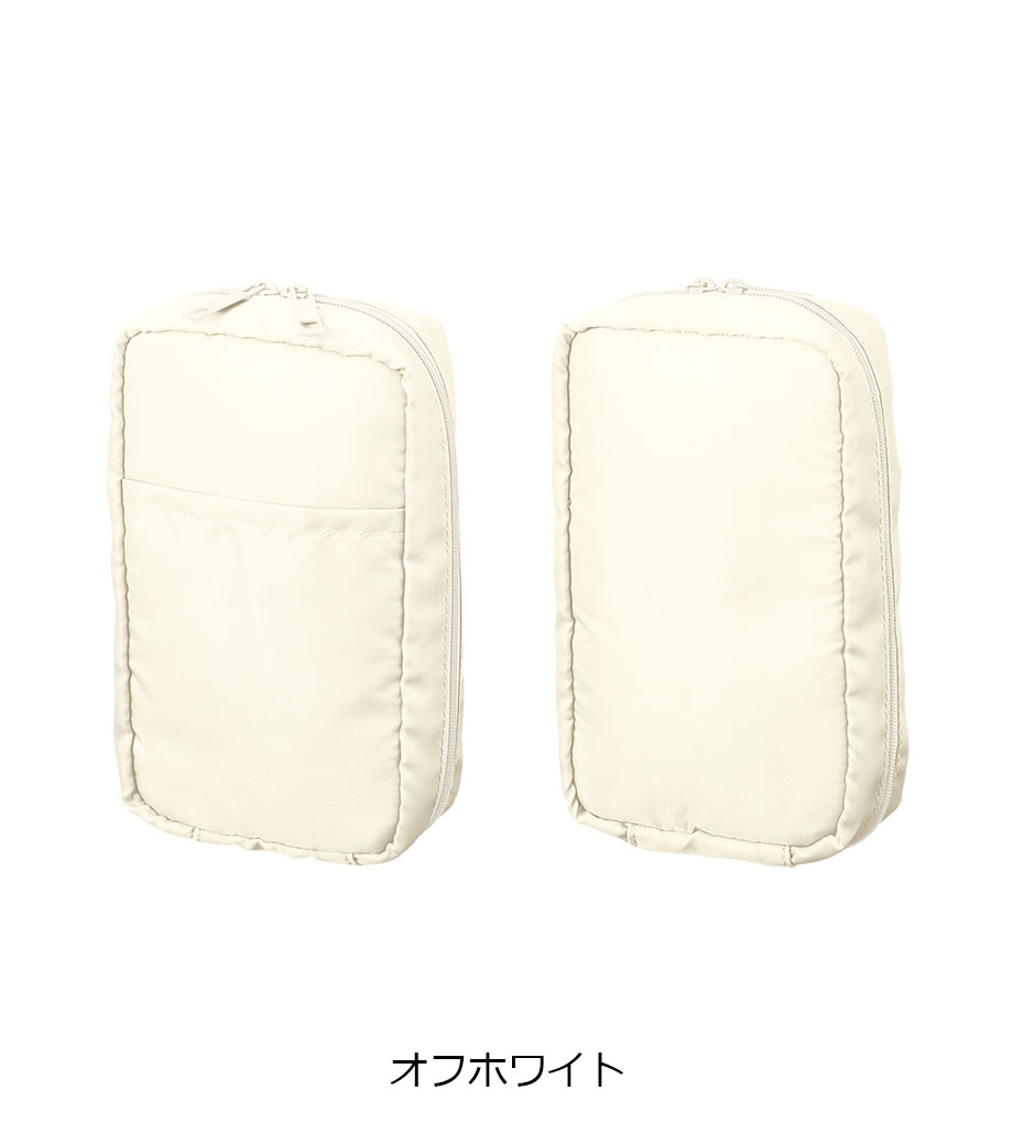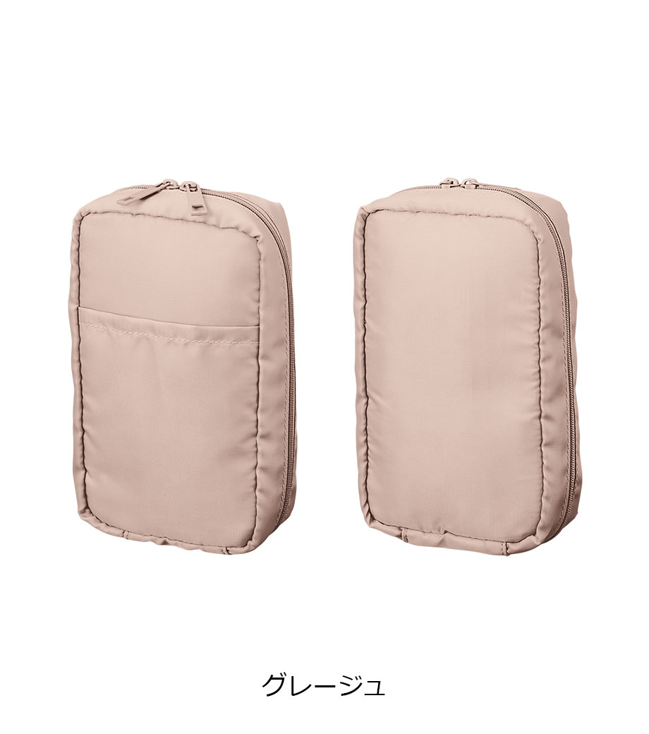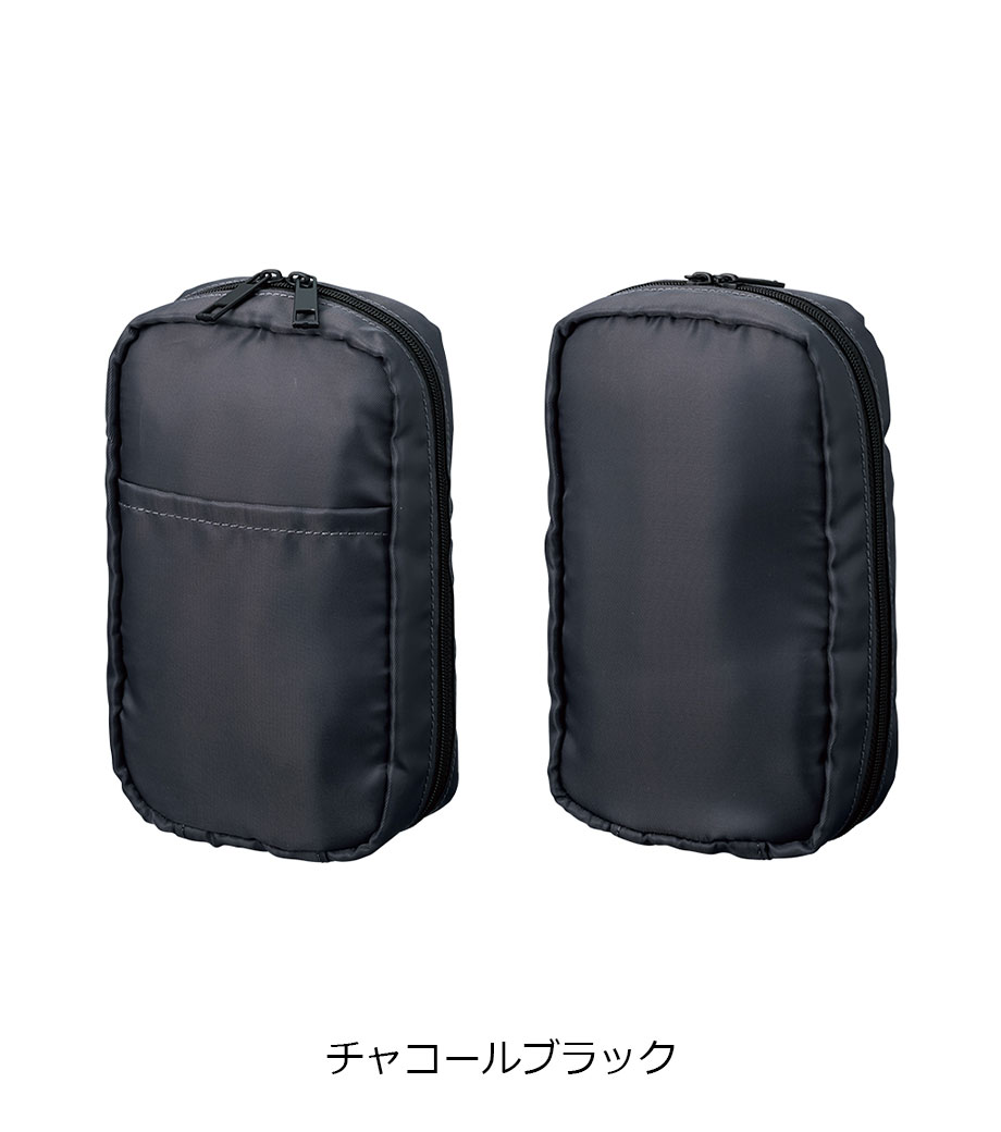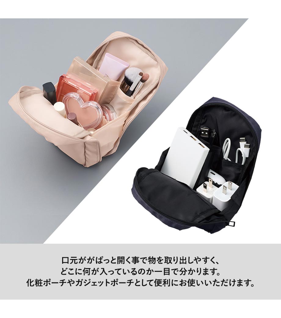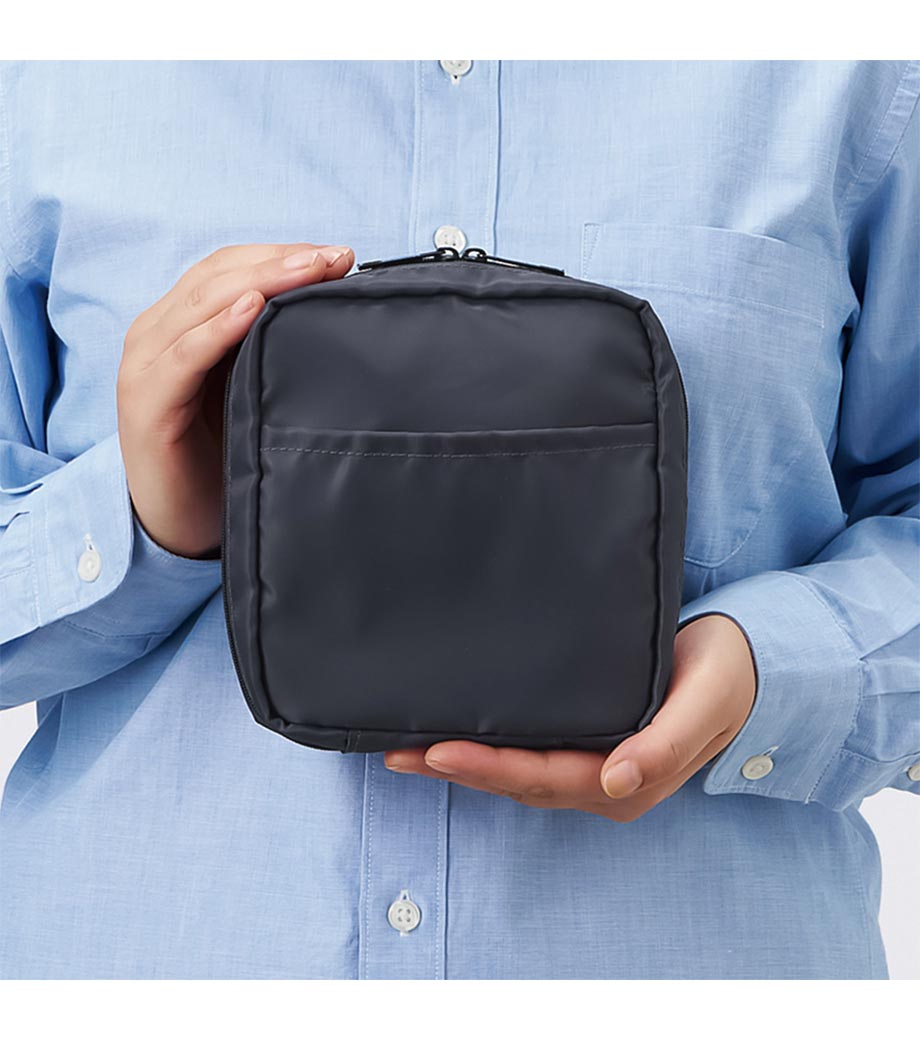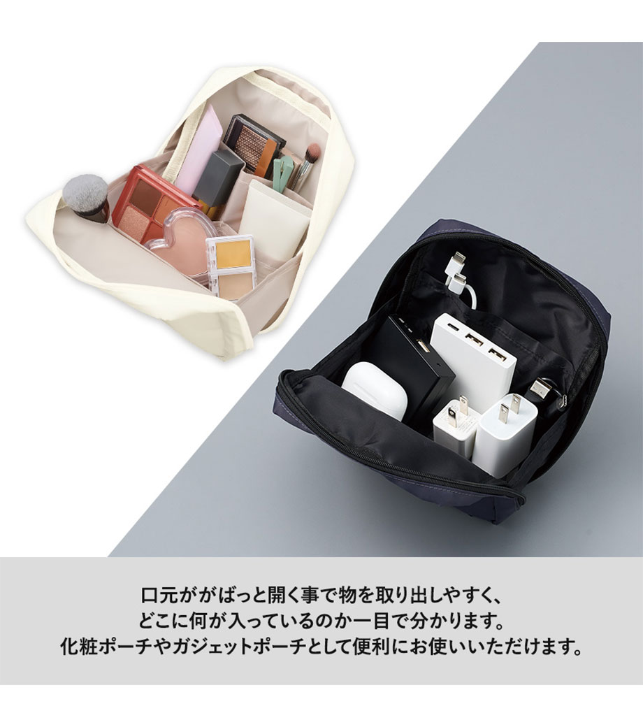 マイルドなカラー展開のしなやかなポリエステル素材のスクエア型ポーチ。内ポケットが6つ付いており、マチ付きでモバイルバッテリーやイヤホンなどガジェット類、コスメや文具もすっきり整理できます。口が大きく開き自立、物の出し入れもスムーズ。普段使いはもちろんトラベルにも最適です。