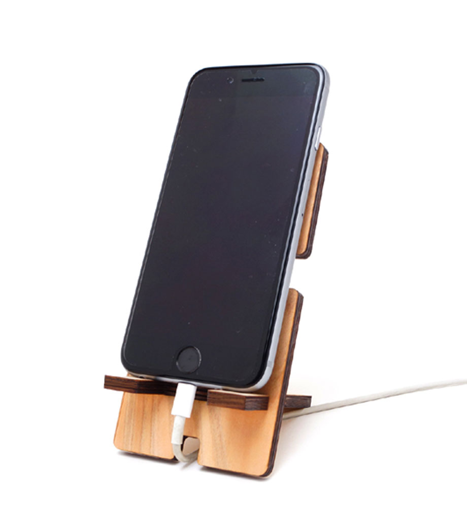 「ラバーウッドスピーカースタンドダブルホーン」は12mmの溝にスマートフォンを置いて充電しながら音楽を再生できるエコ素材のゴムの木を使ったスピーカースタンド。