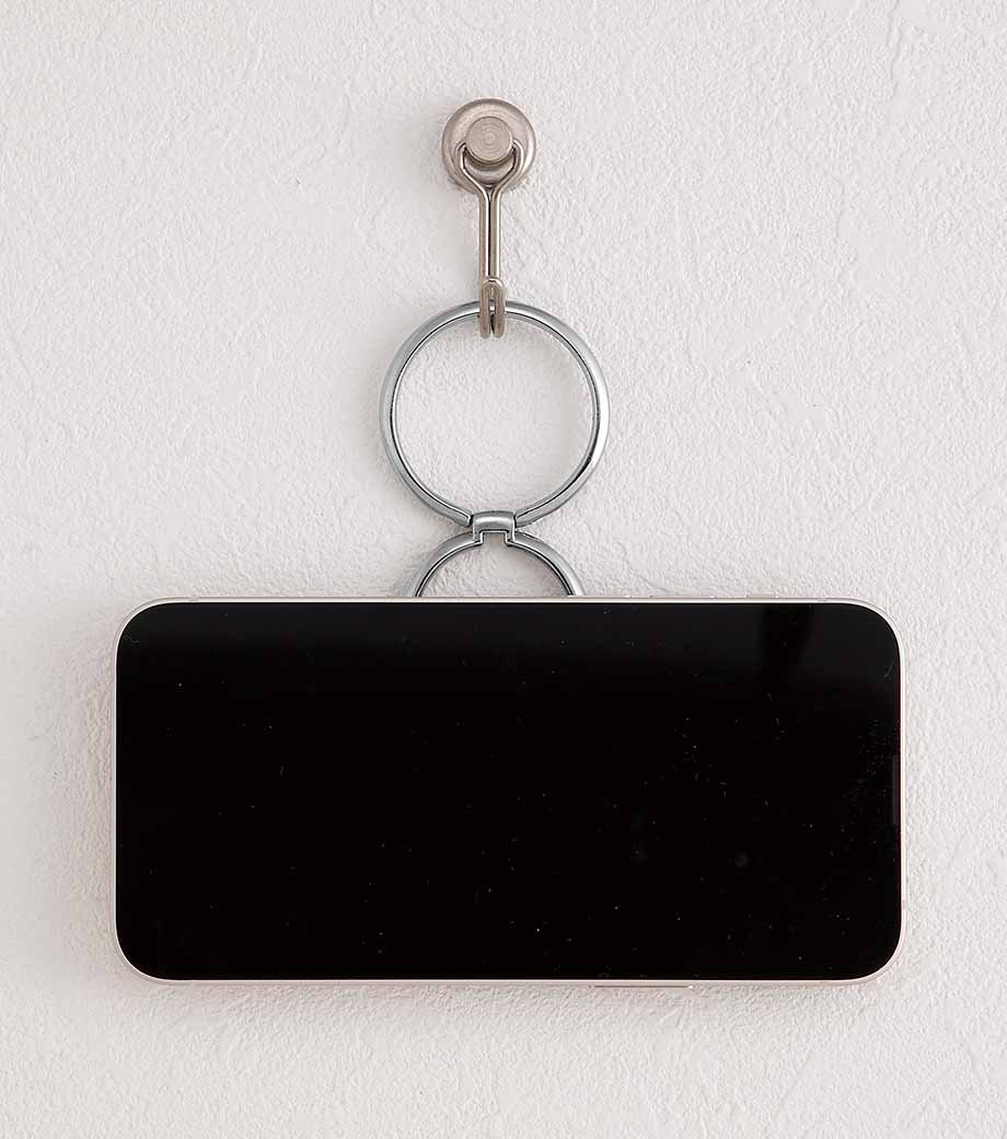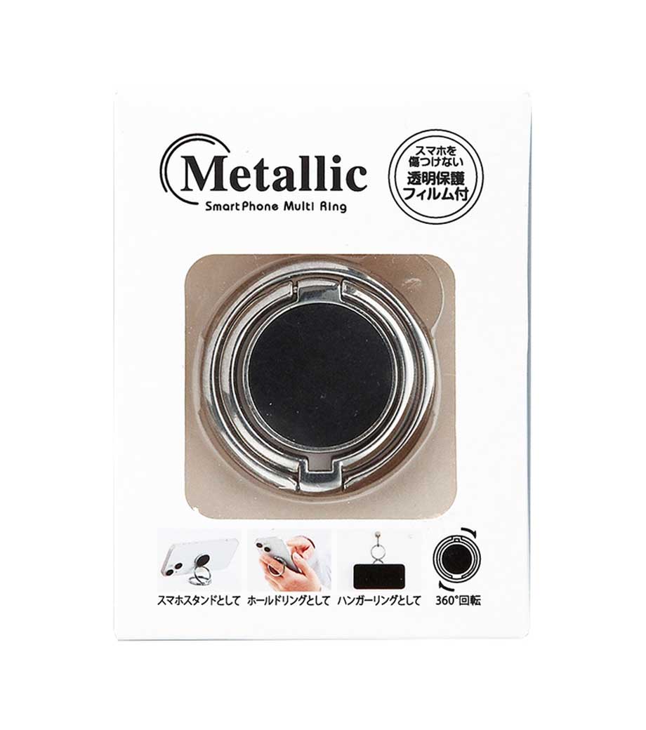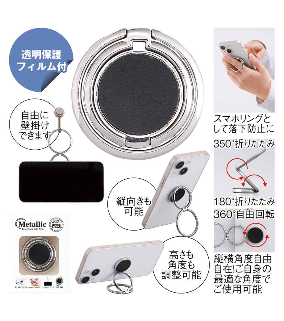 メタリックスマホマルチリングは手持ち・スタンド・壁掛けできる多機能スマホリング。2連のリングは自由な角度に変形できて、他のスマホスタンドでは難しい縦向き使用が可能です。2連リングは長さもあるので壁掛け使用もラクラク!動画視聴やキッチンでのレシピ閲覧に便利です。