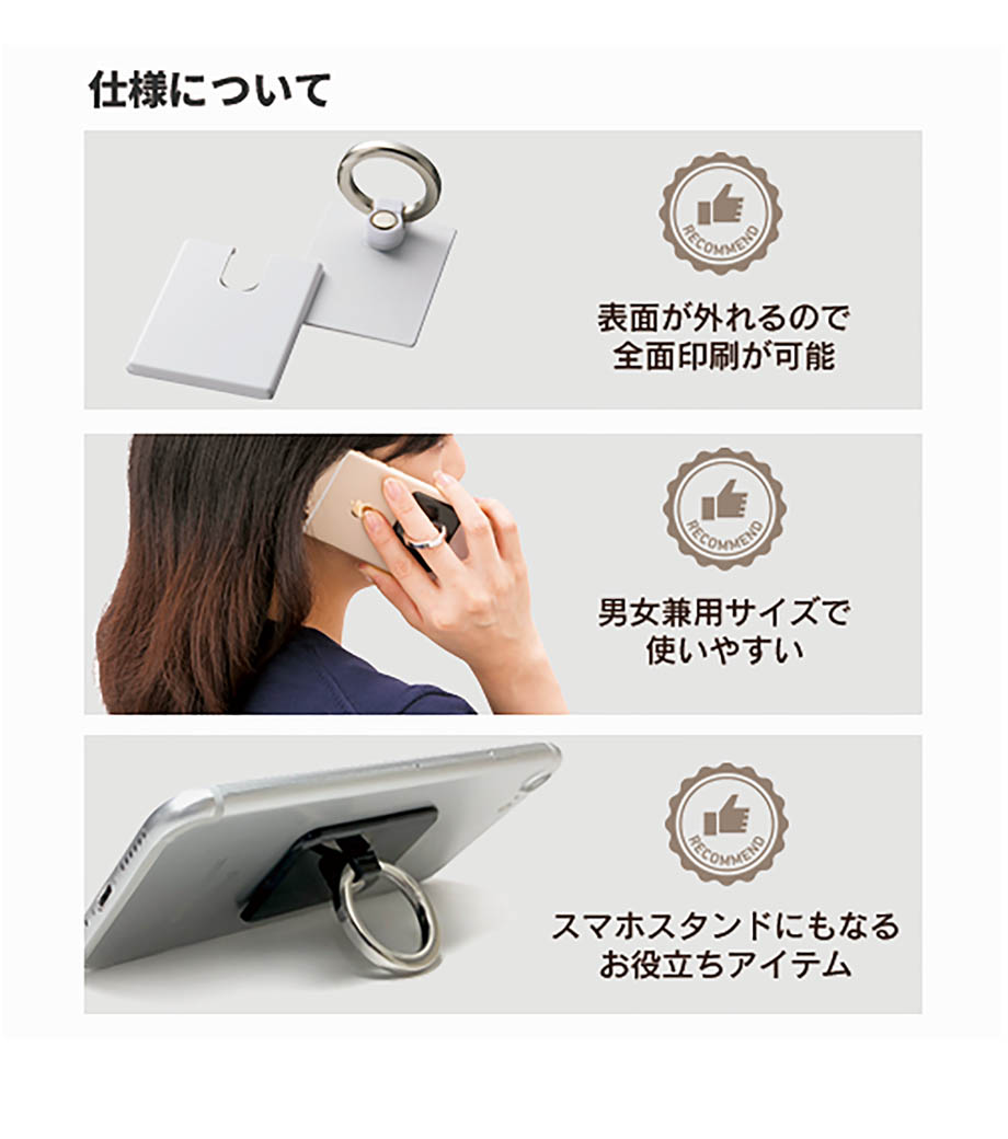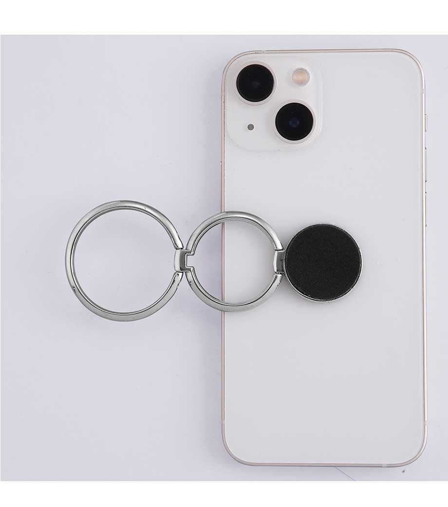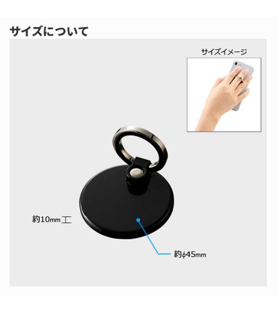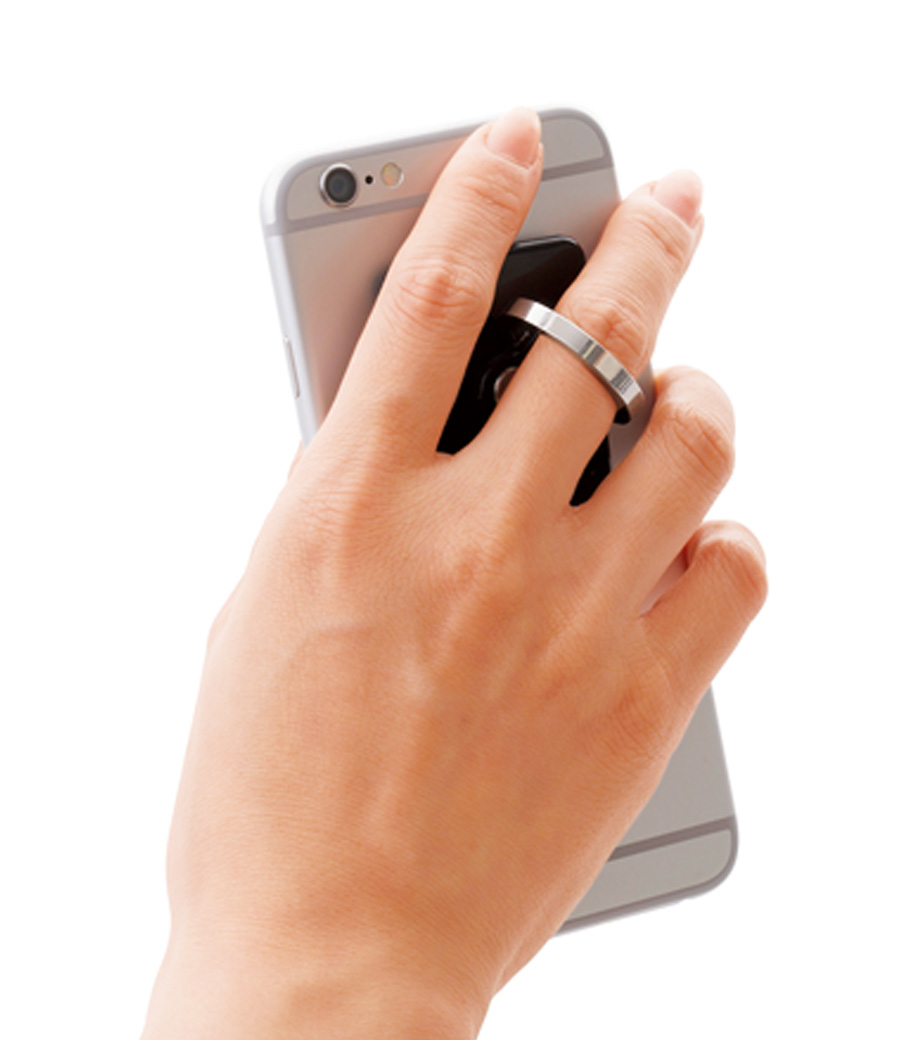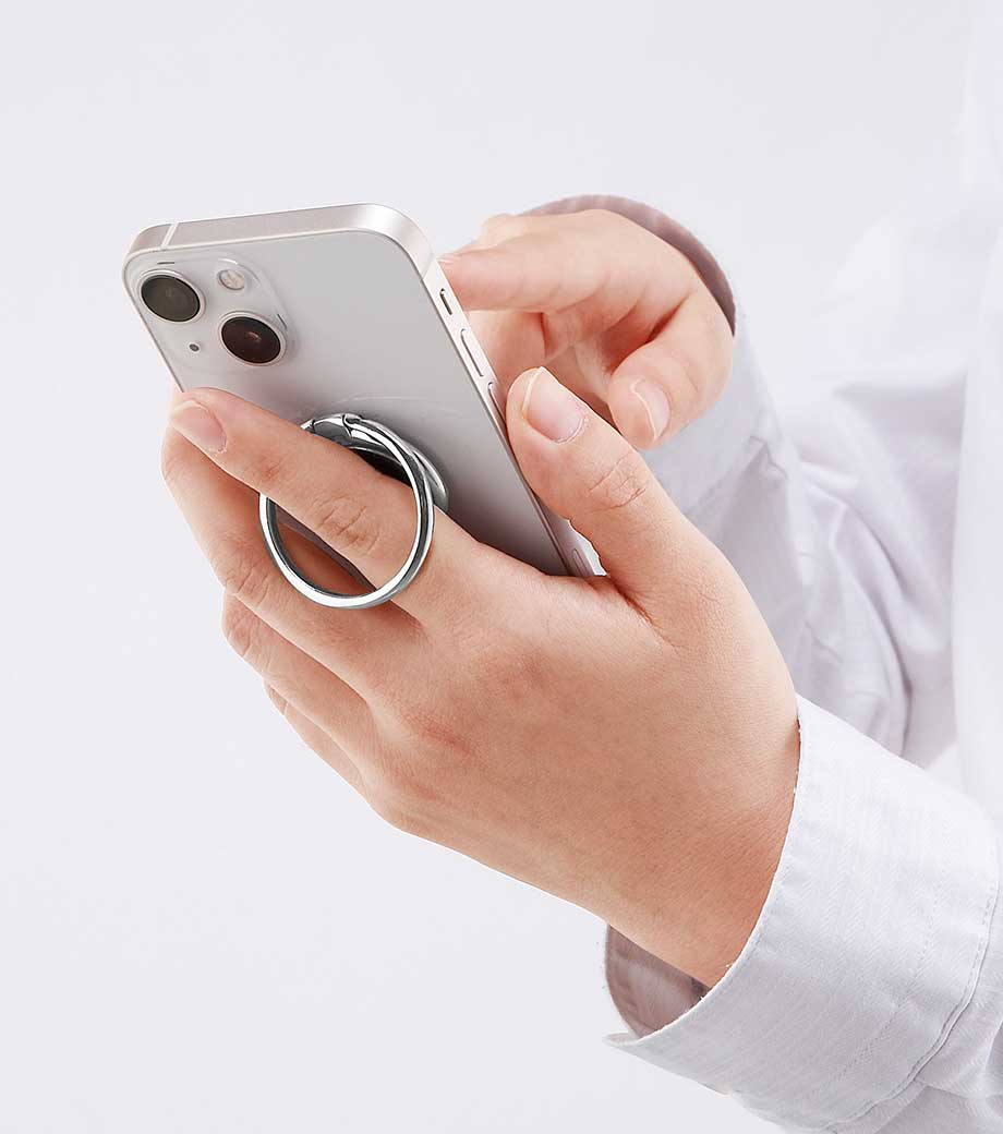 「モバイルリングホルダー」は、スマートフォン使用時に落下するのを防止するアイテムです。リングに指を通せば、通話時やスマホ使用時にうっかり落として液晶が割れてしまった!といった事故を防いでくれます。