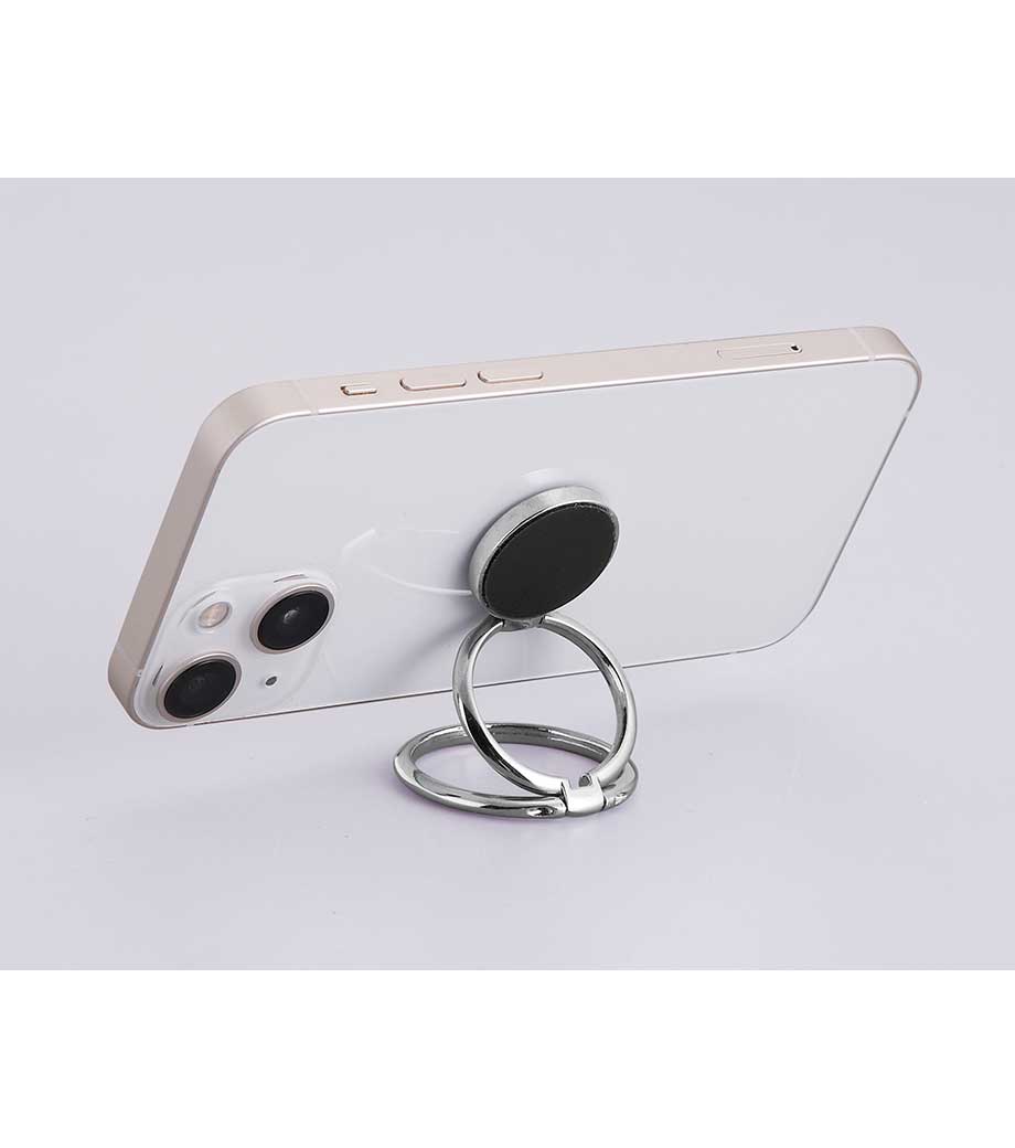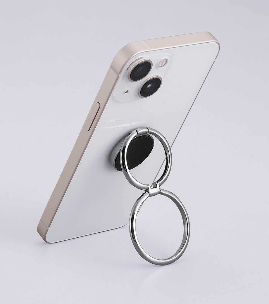 指を通して落下防止だけでなく、動画視聴時にはデスクにスマートフォンを立てるスタンドにもなる優れもの。シルバーのリングは360度回転するので、自分の使いやすい位置に調整できますよ。