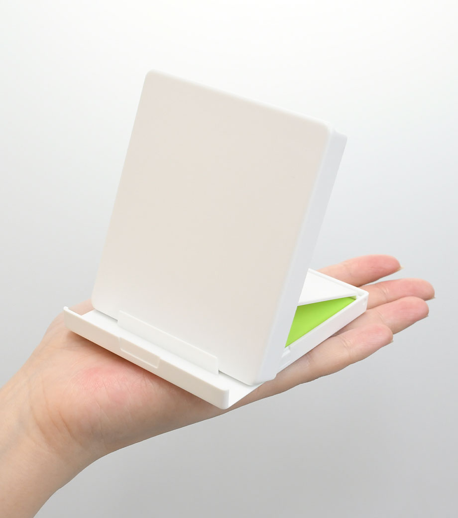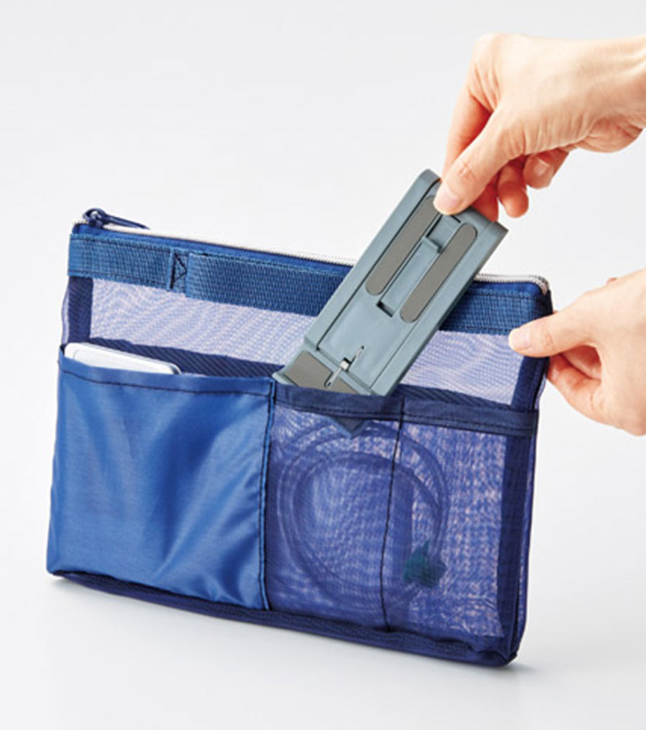スタンド面と台座裏面に滑り止めが付いているので、安定して使用できます。畳めば手のひらサイズとコンパクトに。バッグに入れて持ち運びができるので、ワーキングスペースや喫茶店で作業をしたい時にも便利です。