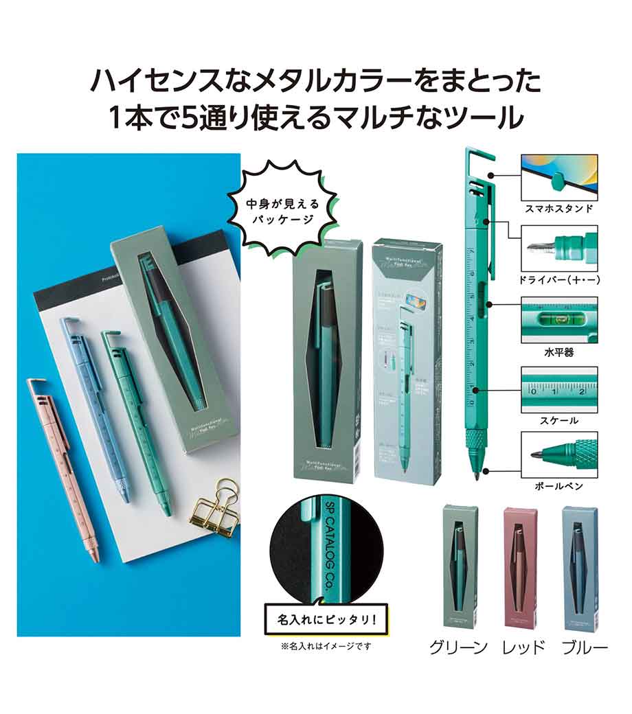 1本で5通り使える、あると便利な多機能ペンです。スマホスタンド、水平器、+-ドライバー、ボールペン、スケール(70mmまで)が一つになっています。軸に1色ロゴ印刷をして、建築関係・不動産関係の販促品やセミナー・イベントのプレゼントにもオススメ!カラフルなメタルカラーが目を引きます。ペンケースや胸ポケットに常備しておけば様々なシーンで活躍します。
