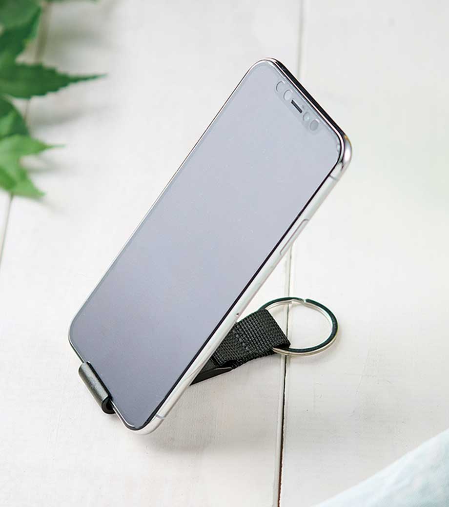 スマホスタンドにもなるバッグハンガーは、便利な2WAYキーホルダー。レストランやカフェで荷物の置き場に困った時、さっとテーブルに掛ければ即席の吊り下げフックに。床にバッグを置かなくてすむので衛生的。狭い店内でも快適です!