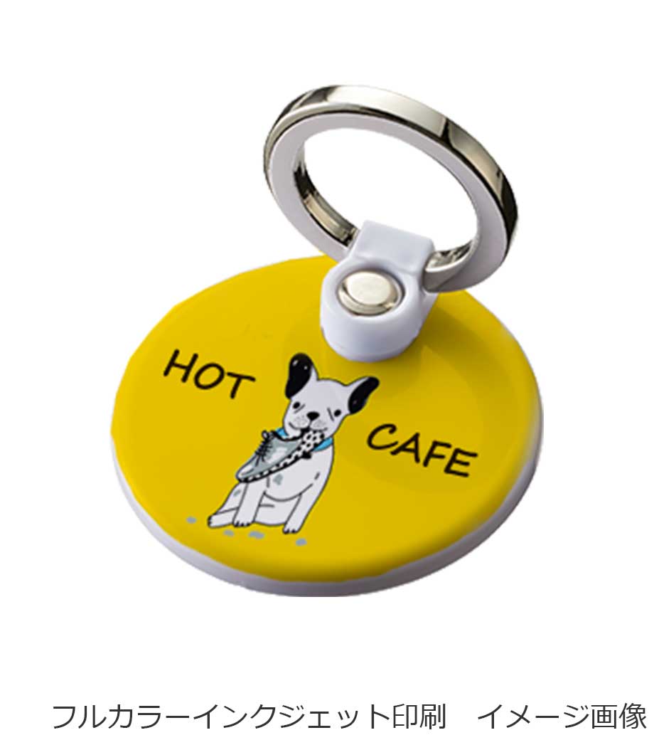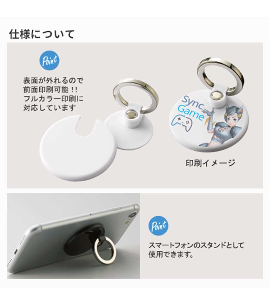 モバイルリングホルダー フルカラー対応 丸は、全面フルカラー印刷ができるモバイルリング。実用性の高いモバイルグッズは、企業のロゴやキャラクターを印刷すれば広告効果も絶大!