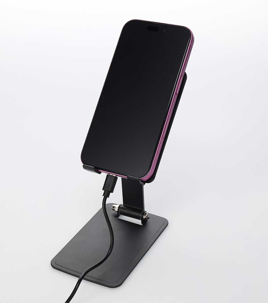 スマホでもタブレットでも使えるスタンド。ずっしり丈夫なスチール製です。土台底面と、デバイスを置く場所にそれぞれラバー製のすべり止め付き。充電しながら使える仕様なのも高ポイント。シンプルながらも機能性の高い商品です。スーツ姿でも使えるデザインで、オンオフ問わず使えます。