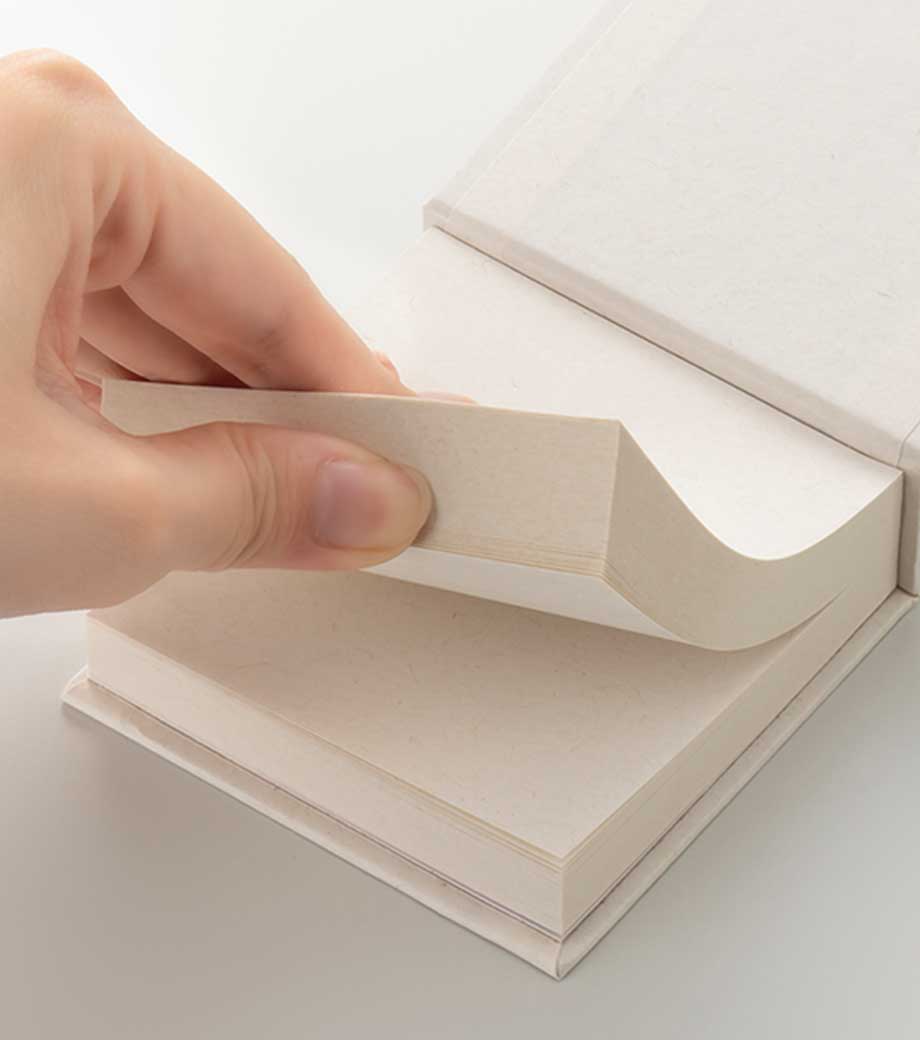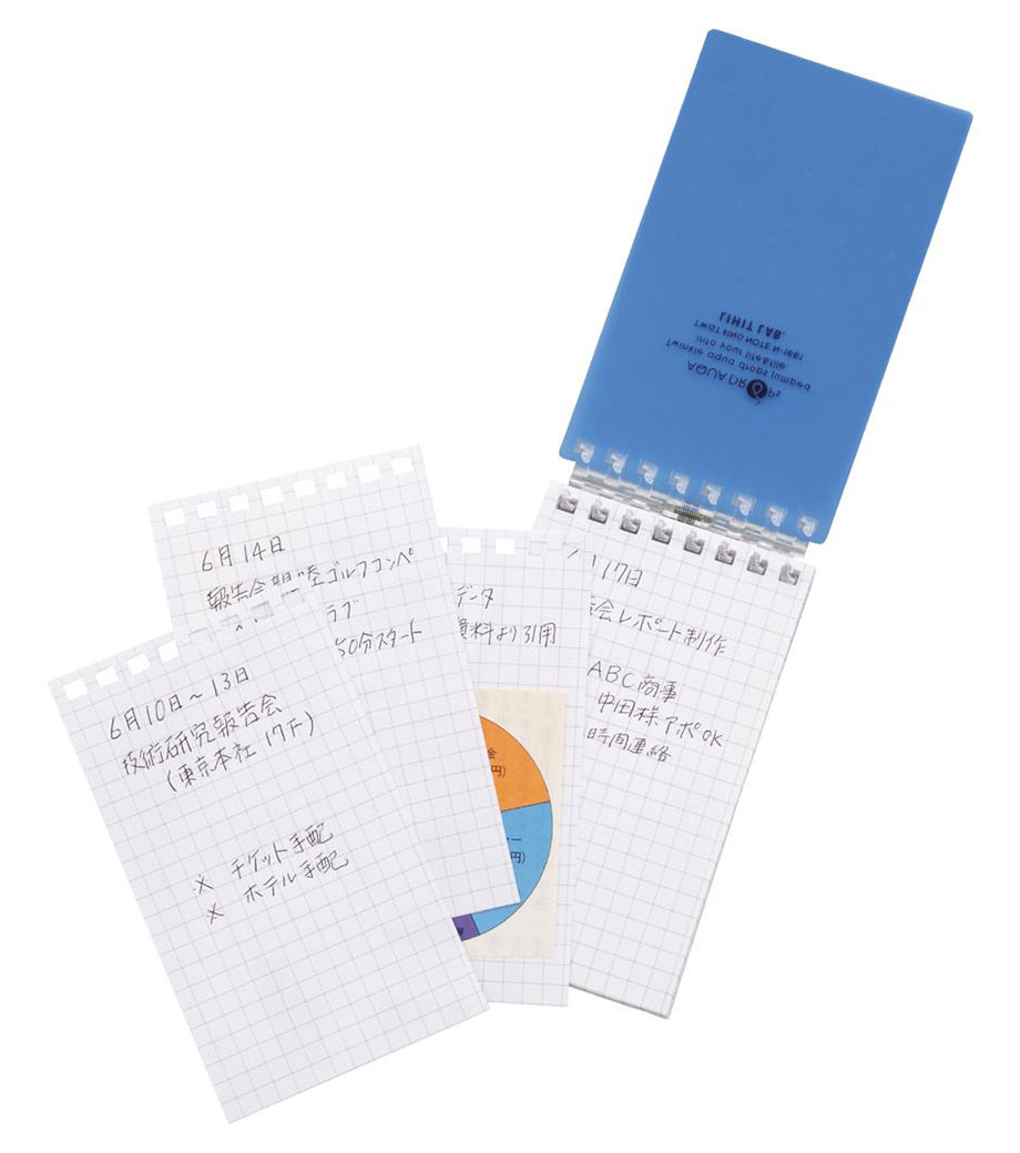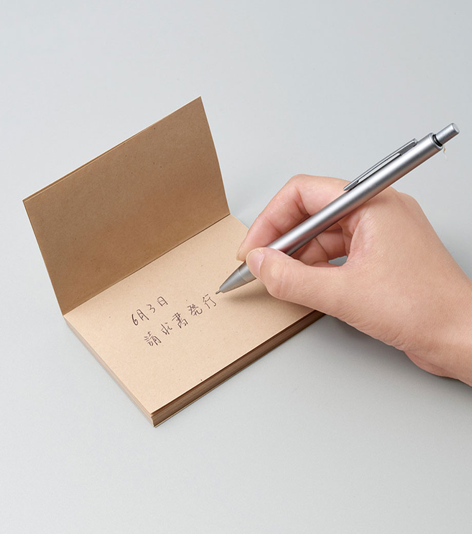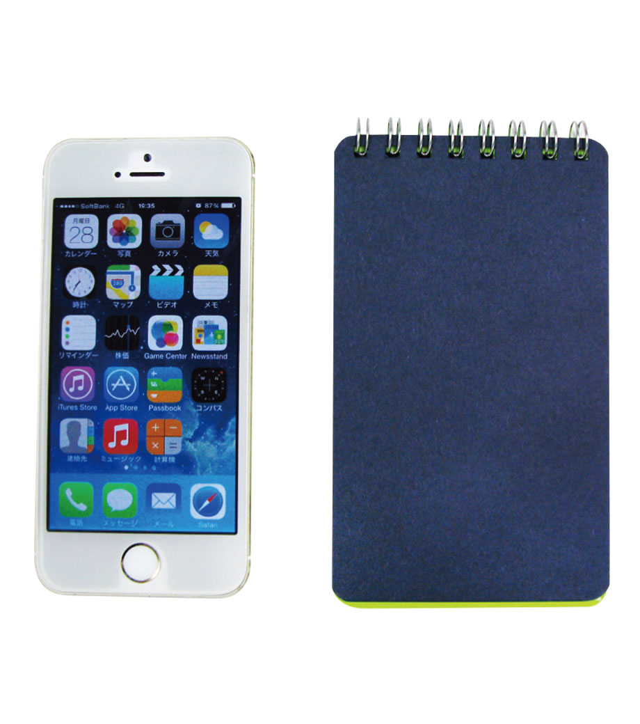 リサイクルA7メモパッドは、バックや背広の内ポケットなど、どこにでもスッと入るメモ帳です。メモ帳部分は使いやすい5mm方眼。文字だけでなく、地図や図表、イラストを書き込みやすく、ひらめいたアイデアなどをすぐに書き込めますね。1枚1枚「ピッ」と気持ちよくはがせるので、誰かにメモを渡すときにも便利。必ず持ち歩くスマホでもメモは取れますが、書くことで脳内の情報を整理し、そこからさらにアイデアが生まれるのもアナログならではです。