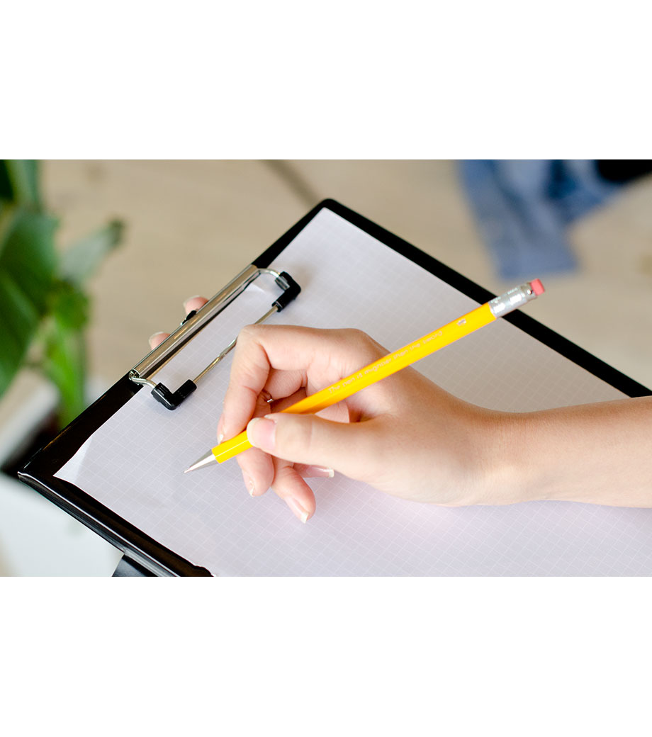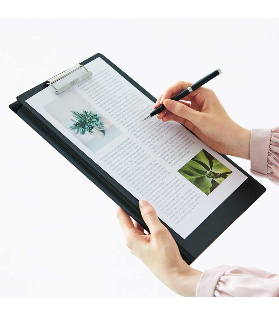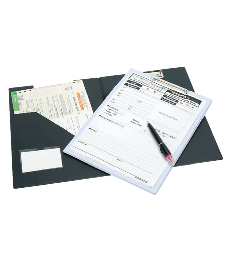 バインダー表面に1色で名入れ可能。印刷範囲が大きいので、ロゴや企業名がしっかり目立ちます。医療施設や薬局での問診・予診用、企業のアンケート記入用の下敷きにオススメです。