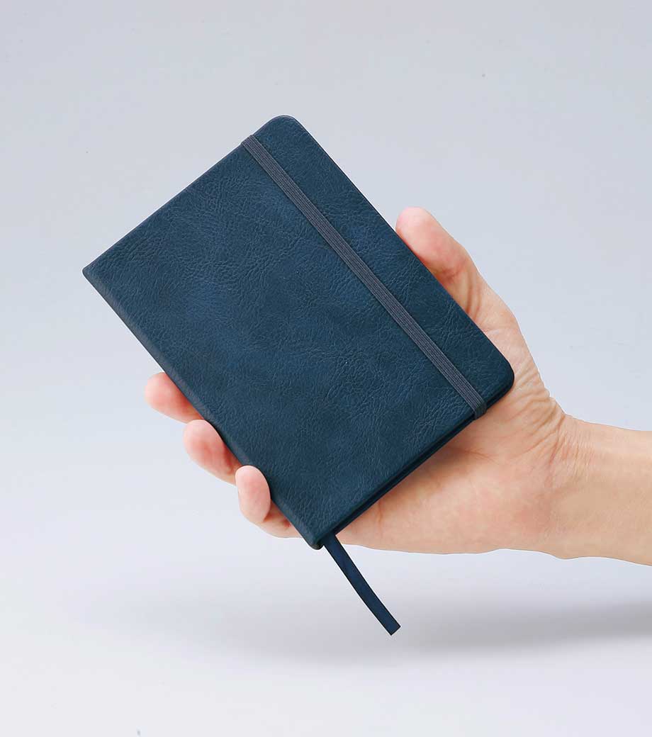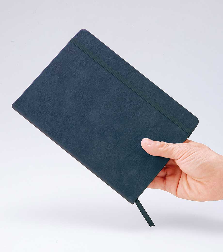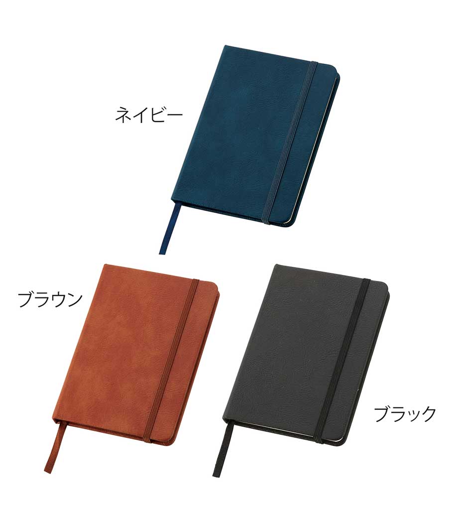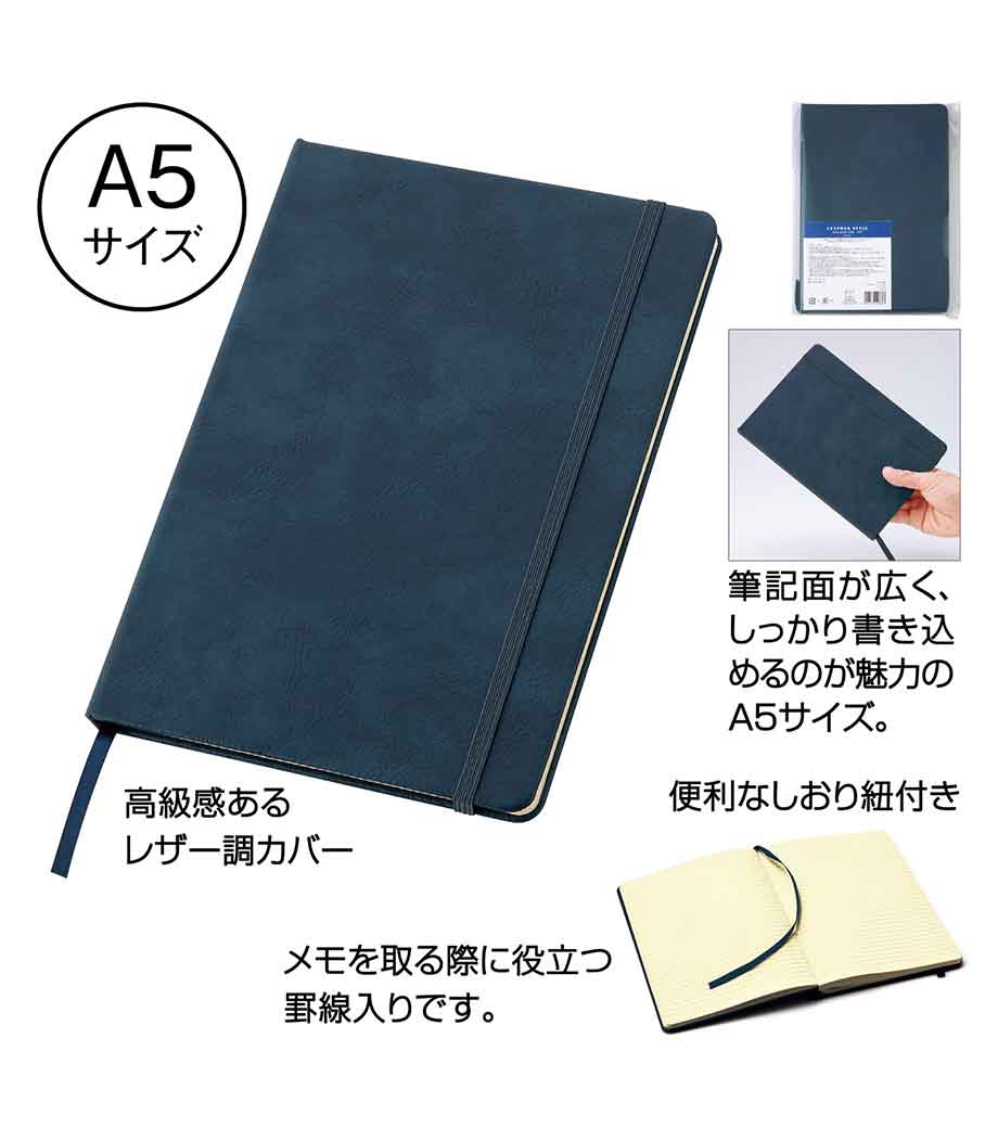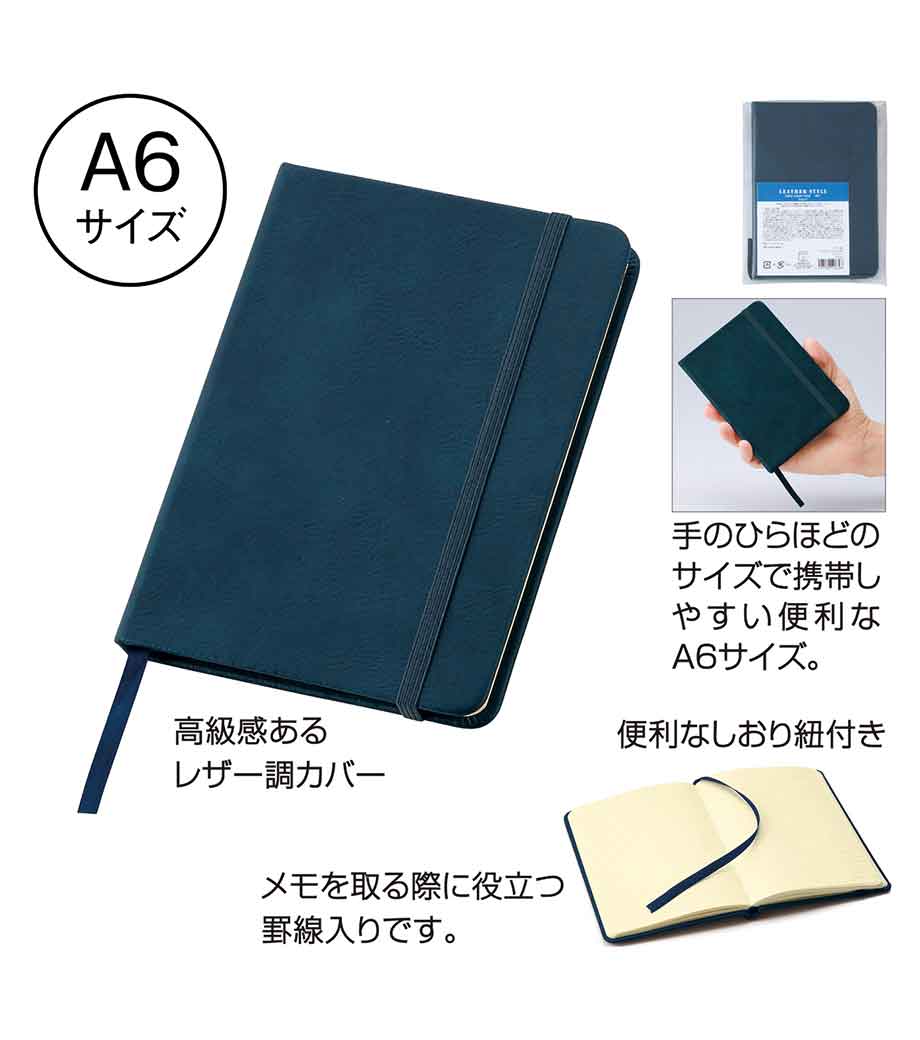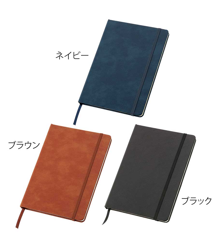 レザー調・ハードカバーノート(A5)は、普段使いに嬉しいサイズ感の横罫ノート。落ち着いたカラーとレザー調のカバーで、お手頃価格ながらも高級感抜群です。表紙を抑えてくれるゴムバンドや、目的のページが開きやすいしおり紐付き。機能性とデザイン性を兼ね備えた、ポストイン可能なノベルティです。