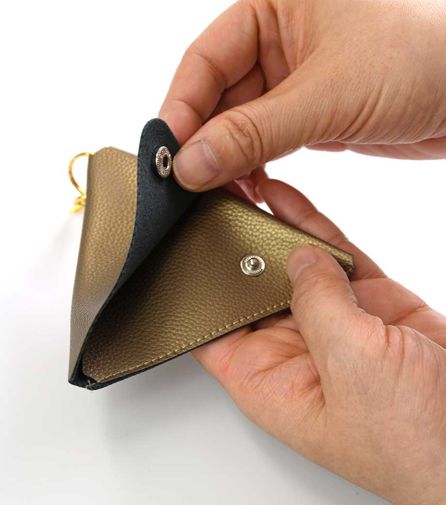メタリア キーホルダーポーチは、小銭や鍵など、ちょっとした小物を収納できるキーホルダー付きポーチ。名入れは1色印刷が可能です。