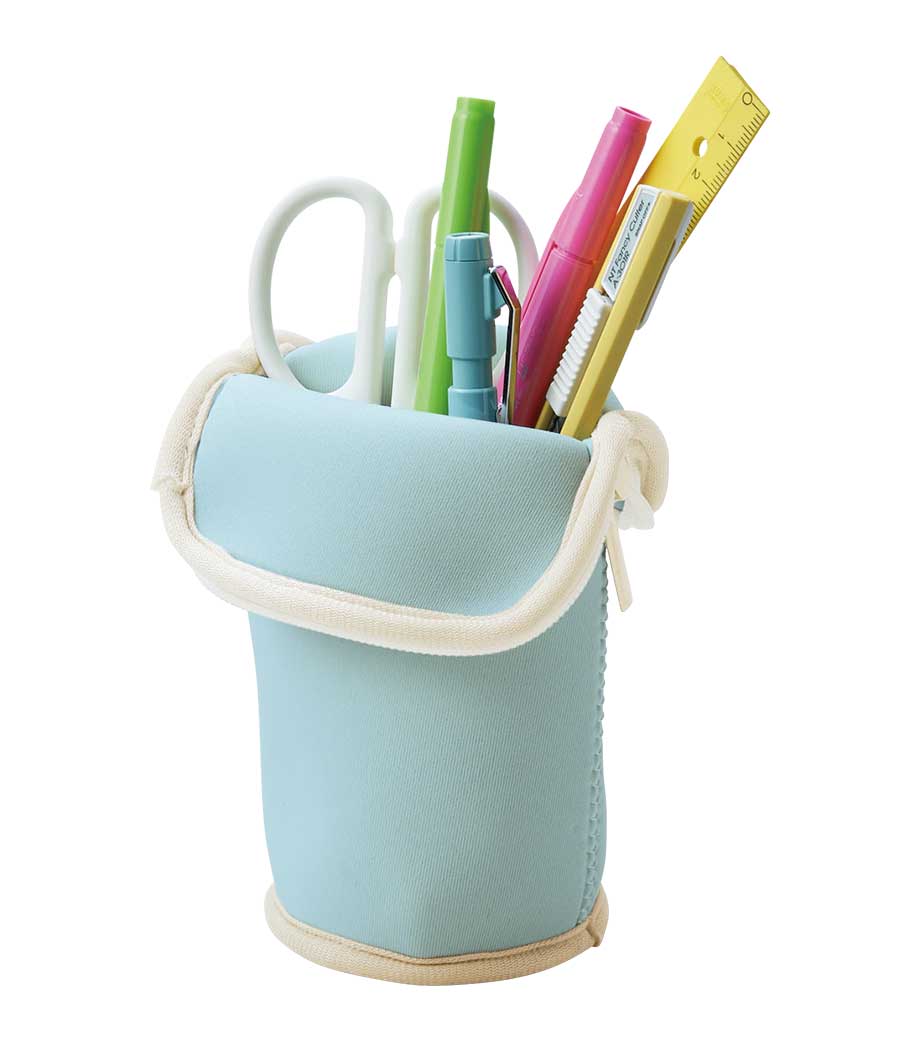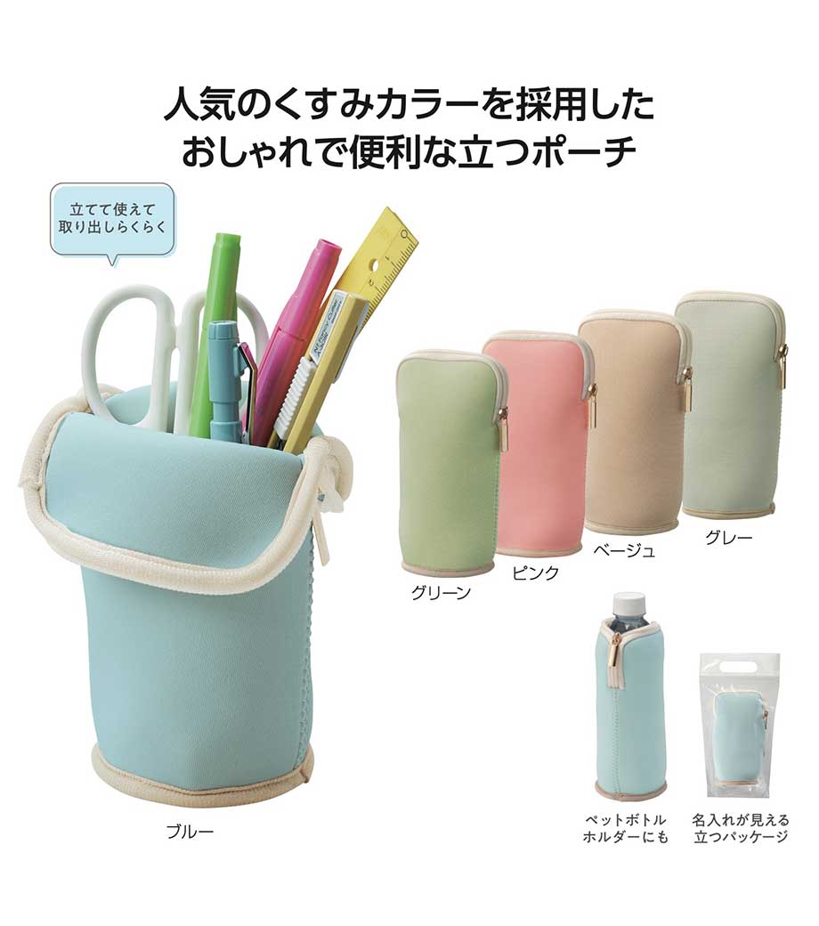ペンケースや化粧ポーチなどマルチに使える、人気のくすみカラーポーチ。机の上で自立するので、作業スペースを広く確保することができます。ファスナー部分を折り返せば、取りたいものが見つけやすく出し入れもスムーズです。クッション性のあるイソプレンゴム素材。電子機器などの保護ケースやペットボトルホルダーにも使えます。