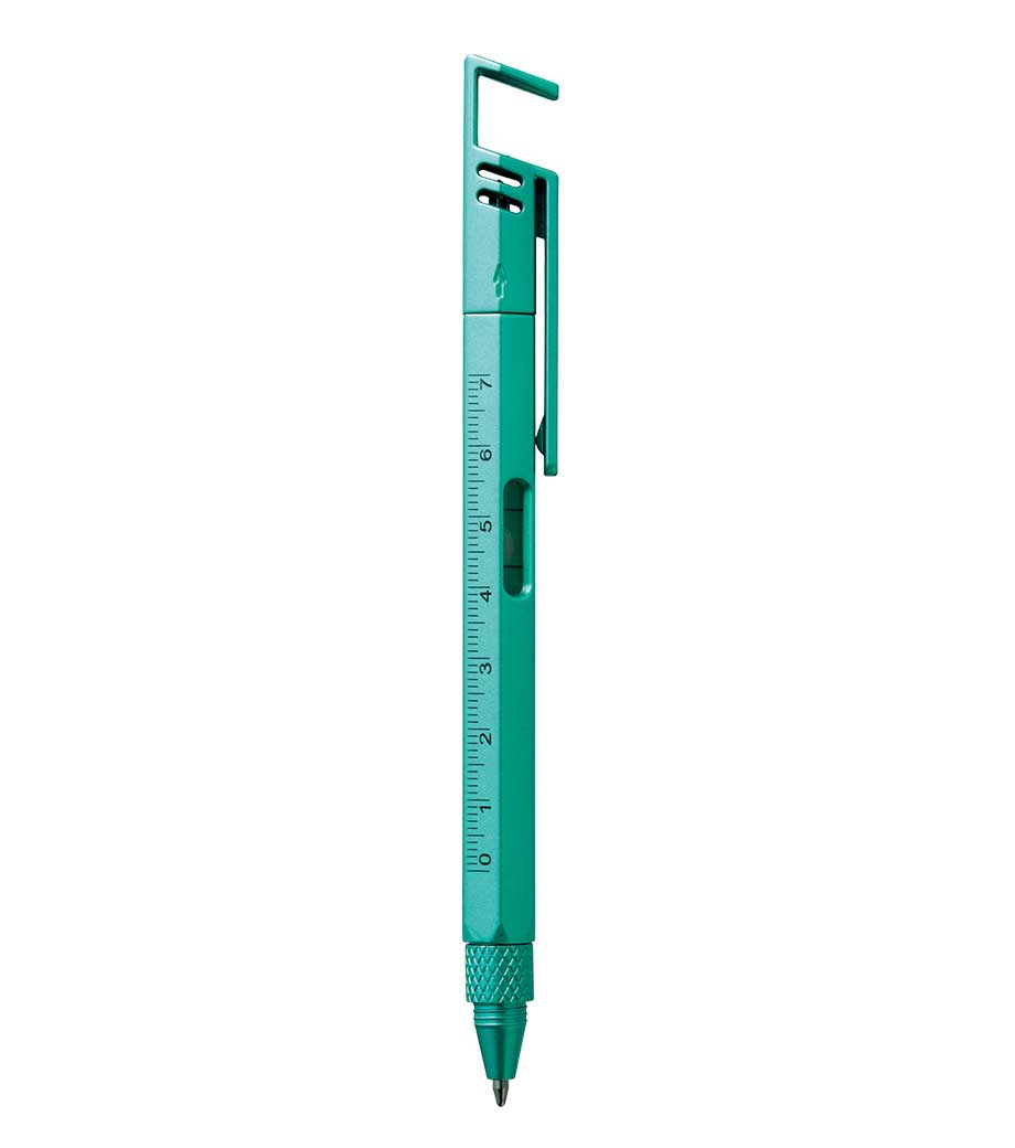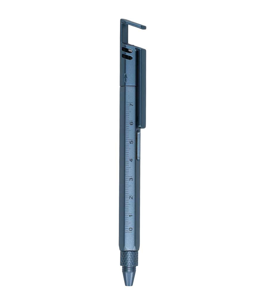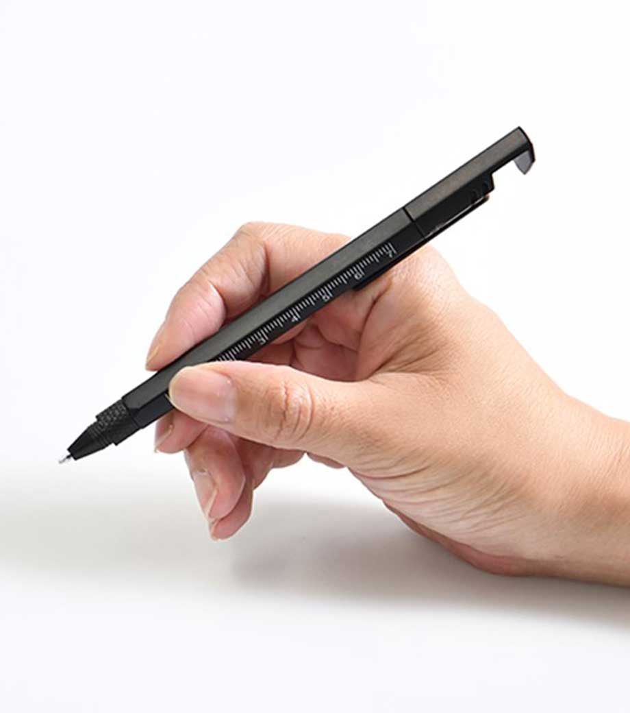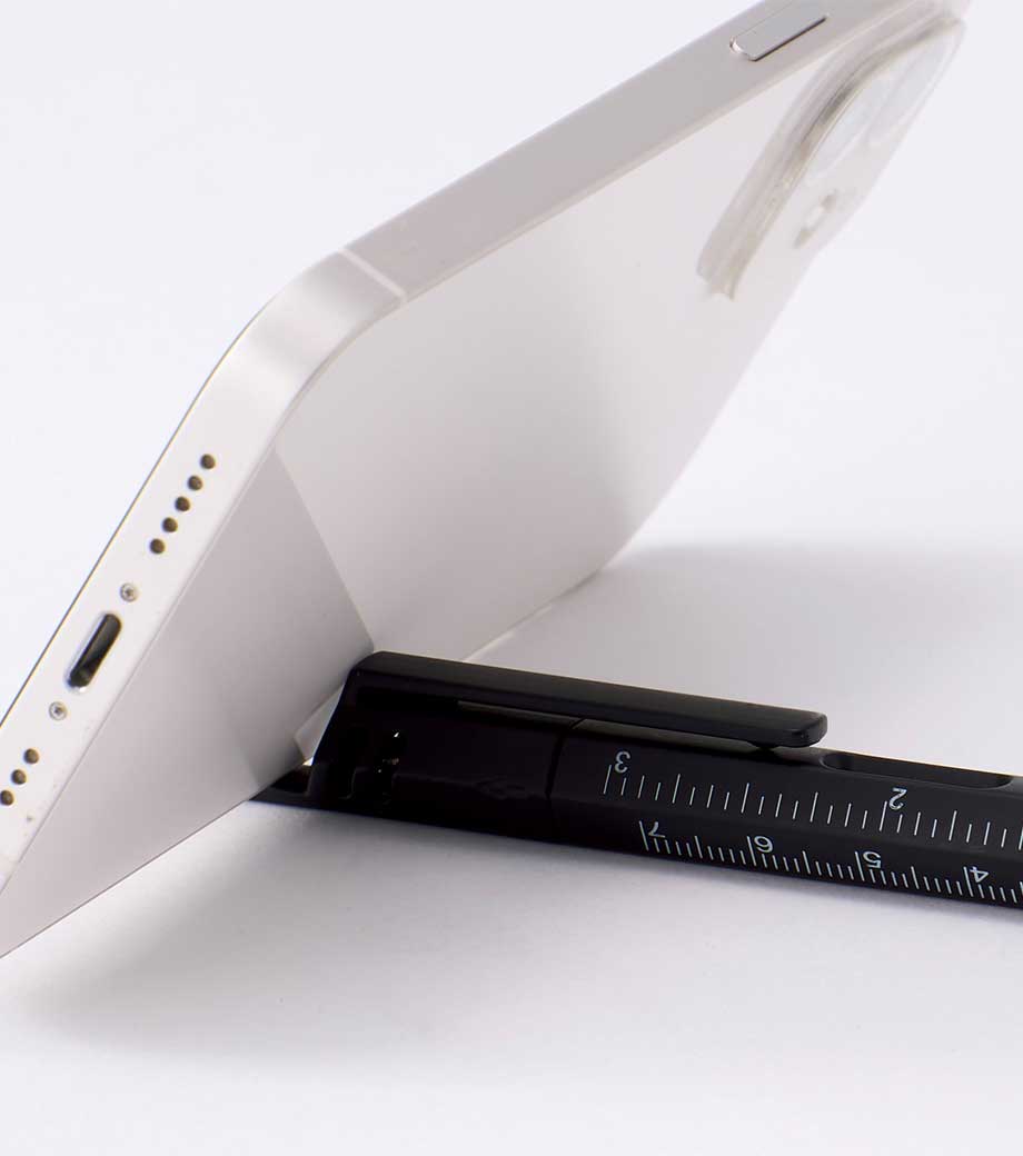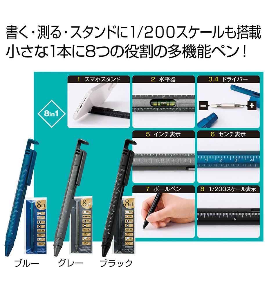 あると便利な多機能ペン。スマホスタンド、水平器、+-ドライバー、ボールペン、インチ・センチ・1/200表示の3種のスケールが一つになっています。