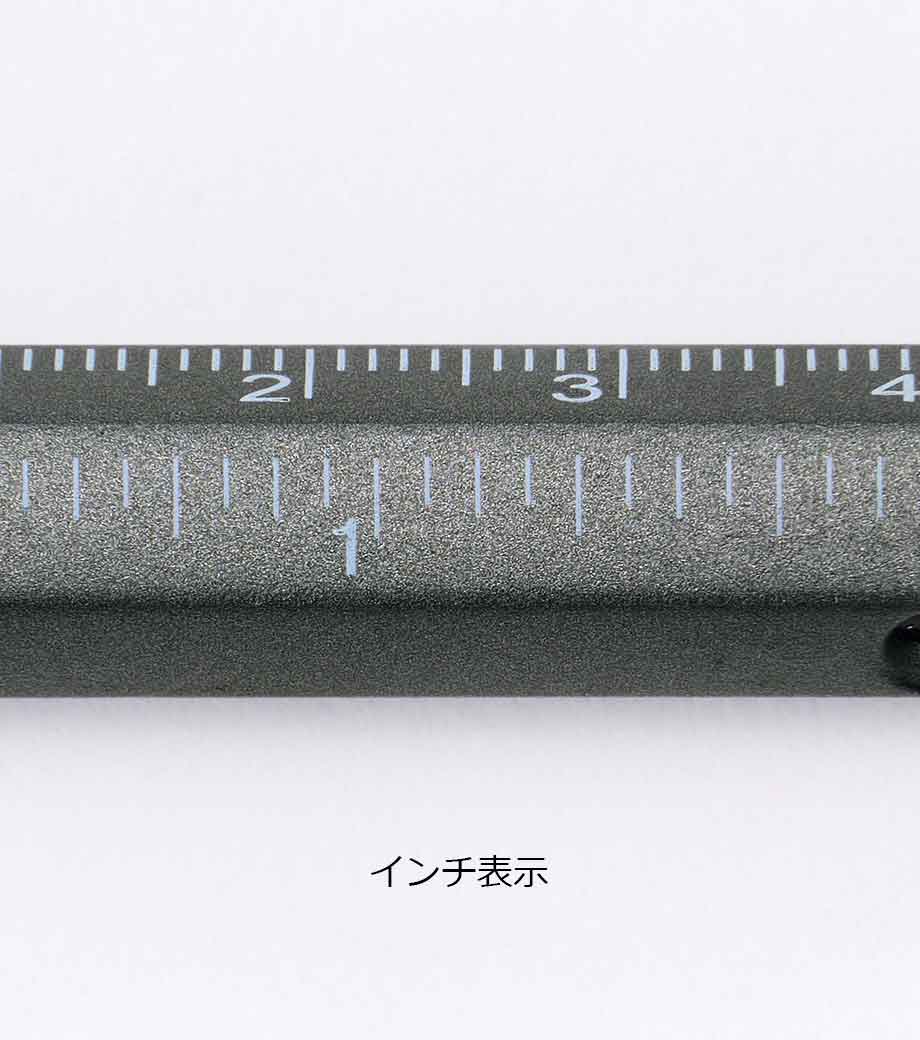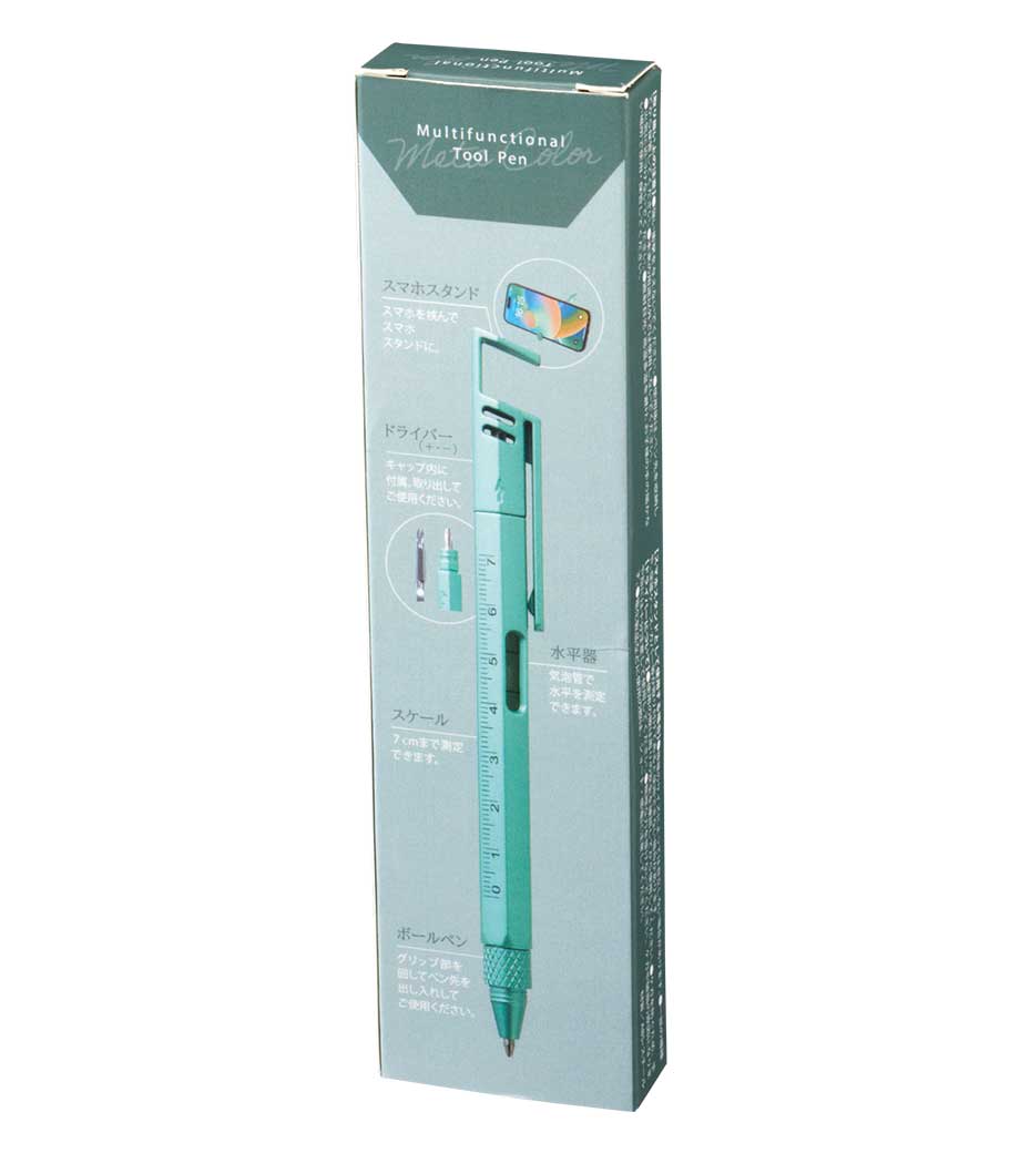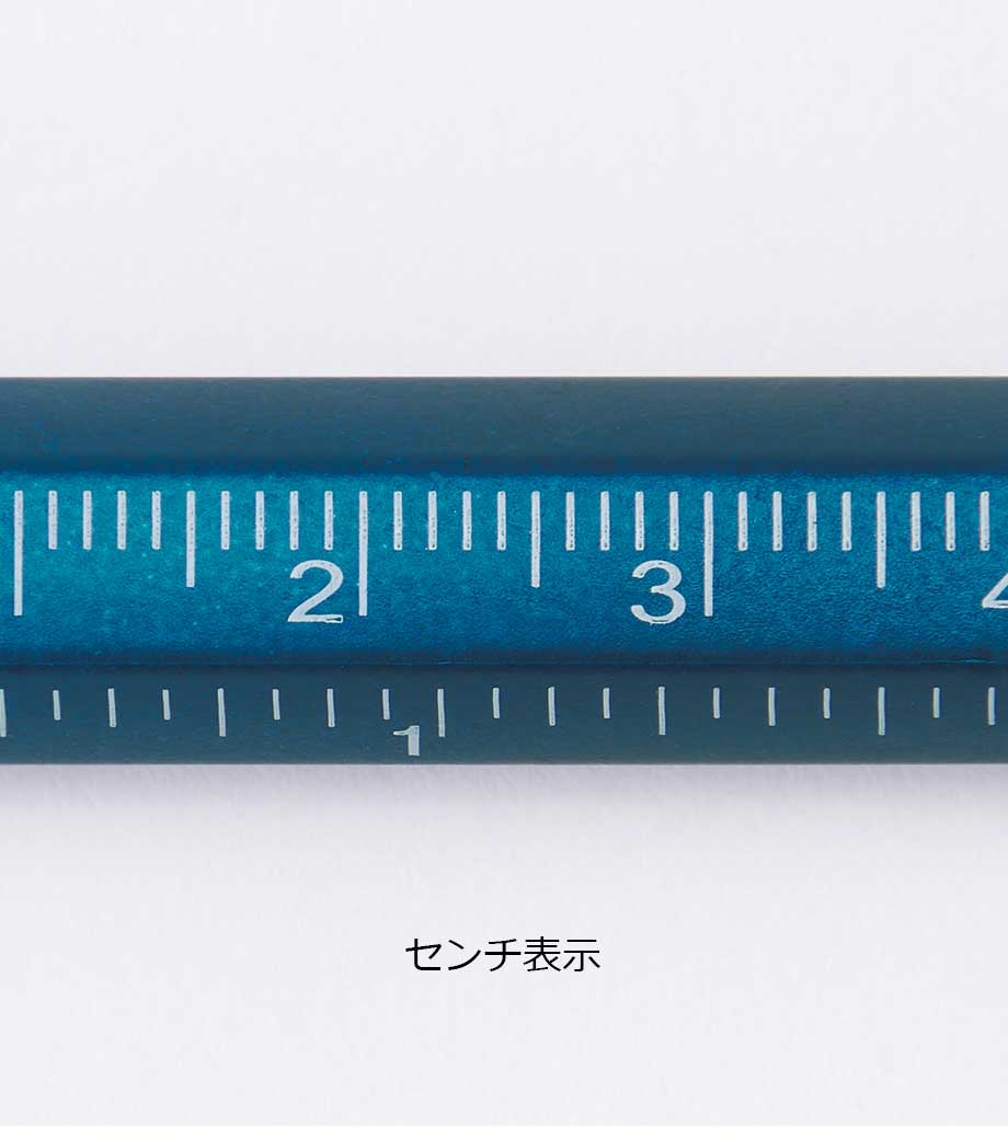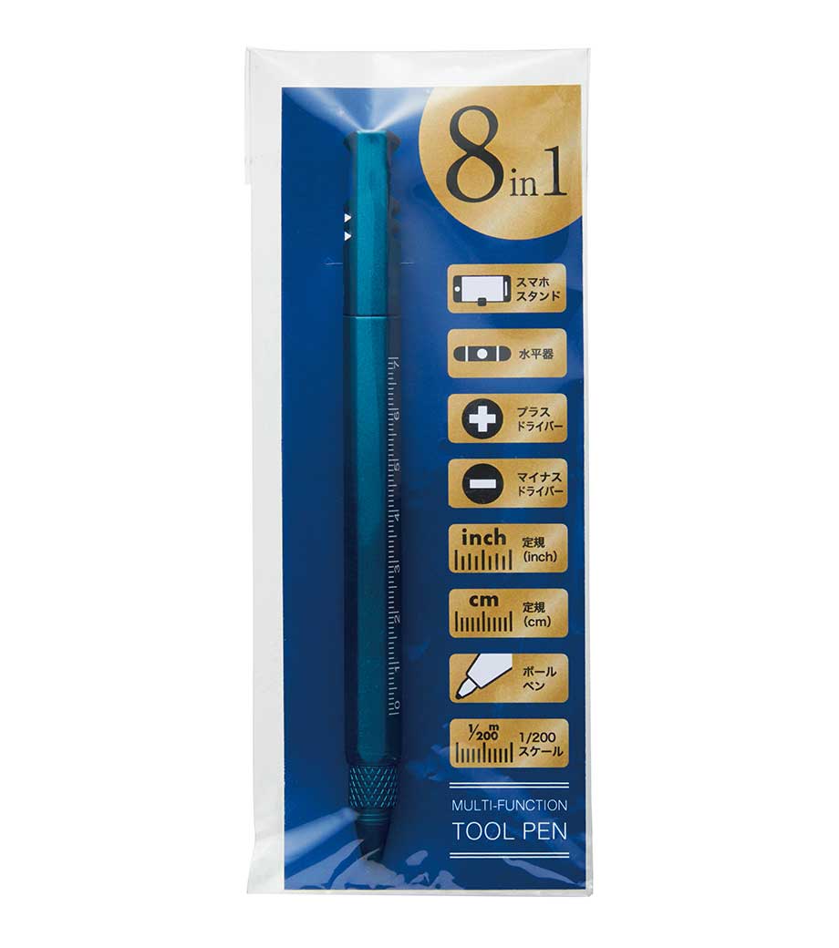 あると便利な多機能ペン。スマホスタンド、水平器、+-ドライバー、ボールペン、インチ・センチ・1/200表示の3種のスケールが一つになっています。