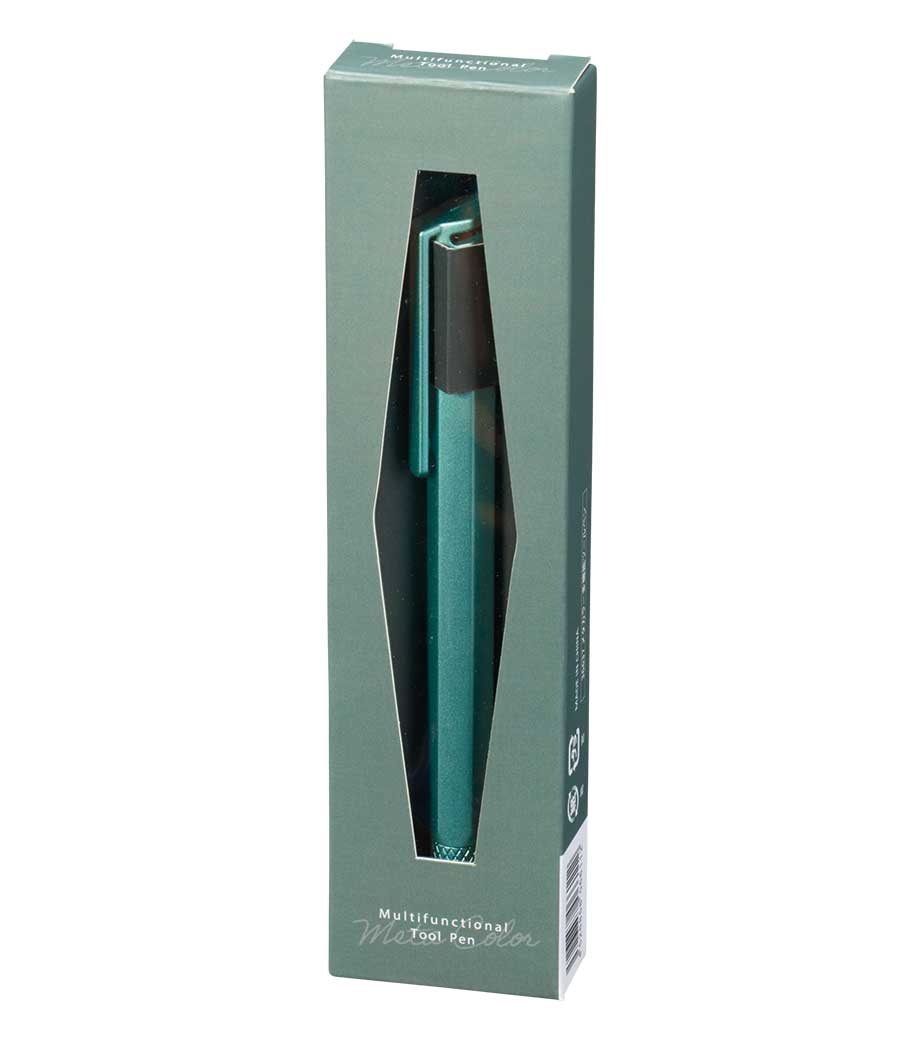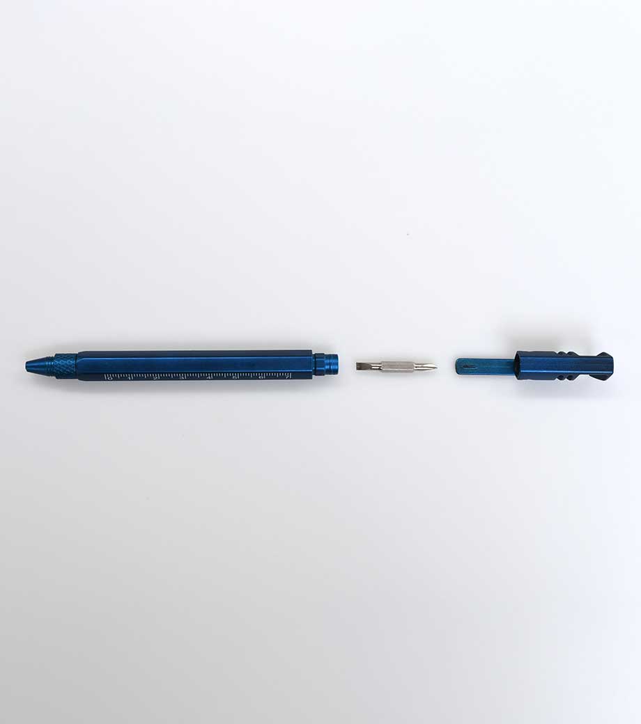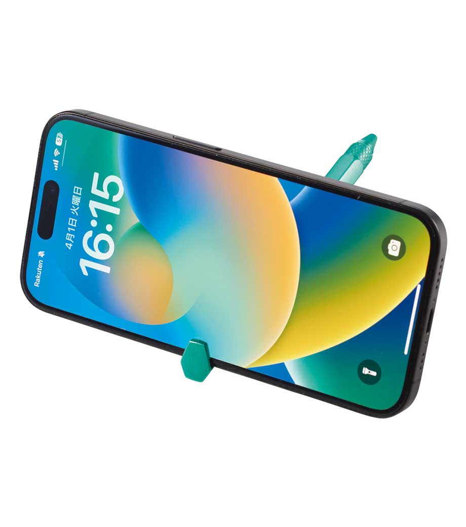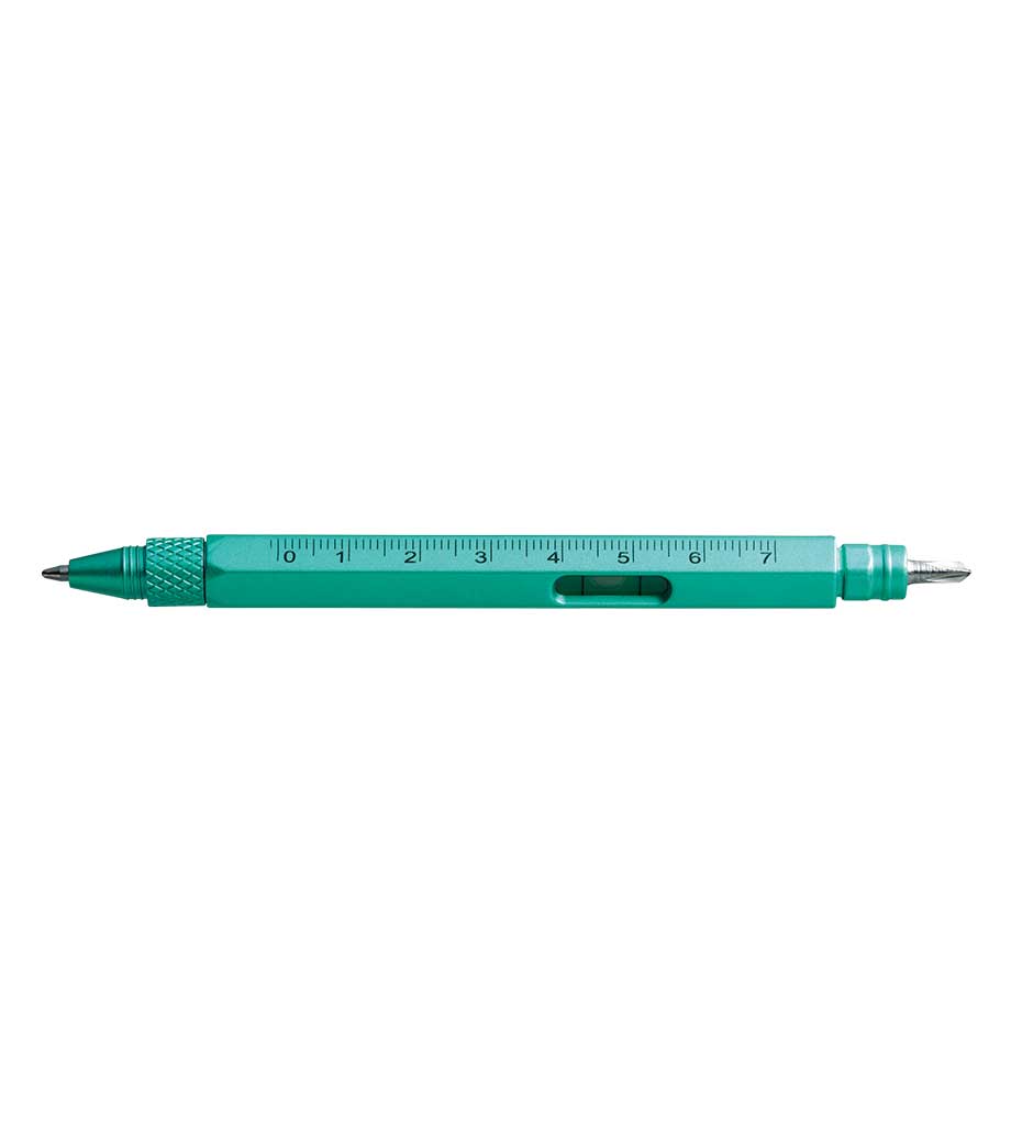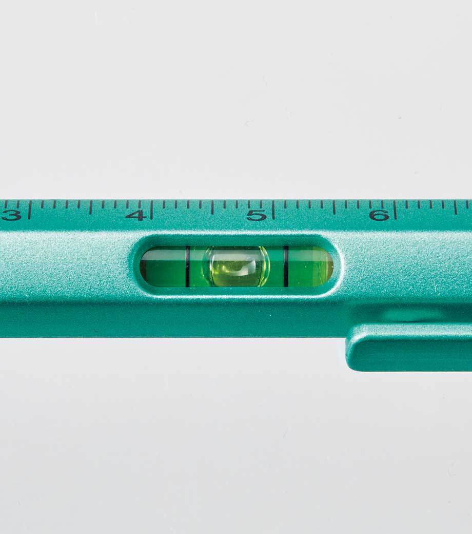 あると便利な多機能ペン。スマホスタンド、水平器、+-ドライバー、ボールペン、インチ・センチ・1/200表示の3種のスケールが一つになっています。
