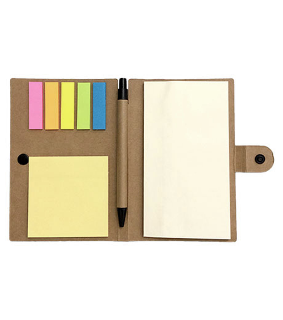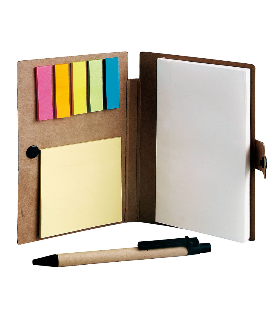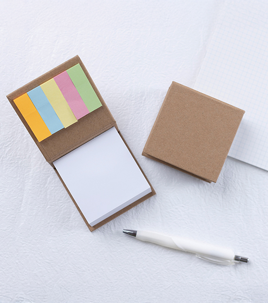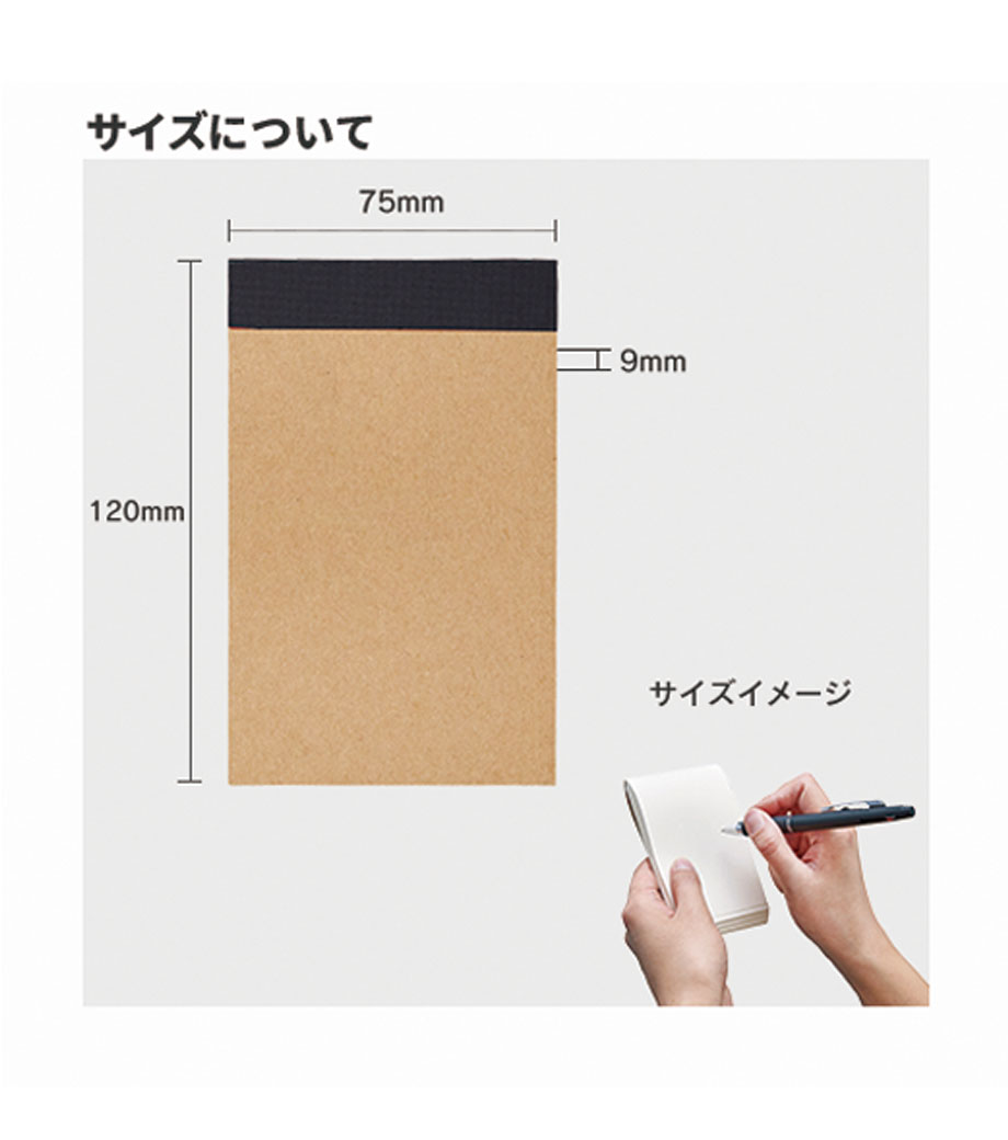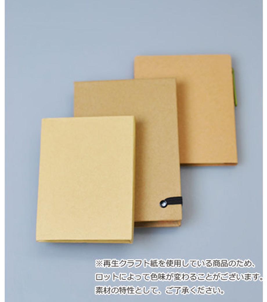 A6エコメモノートは中小2サイズの付箋が付いた再生クラフト紙表紙のノートセットです。サイズ約14cmのボールペン付きで、これ一つでメモ書きが完了!無地の再生紙メモも約50枚付いているので、会議や打ち合わせにこれ一つ持っていけばばっちりですね。