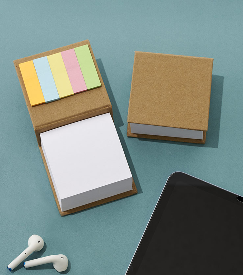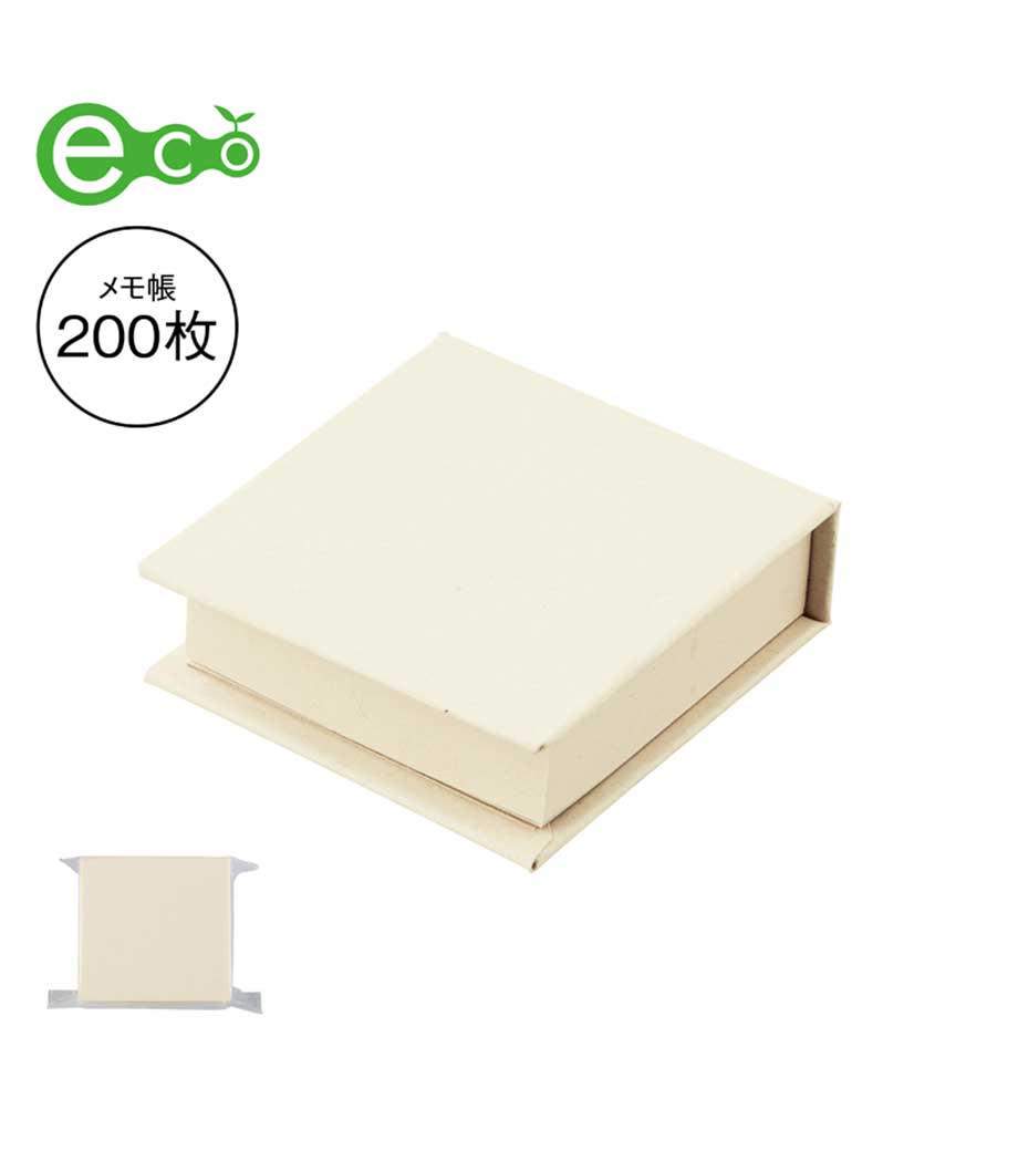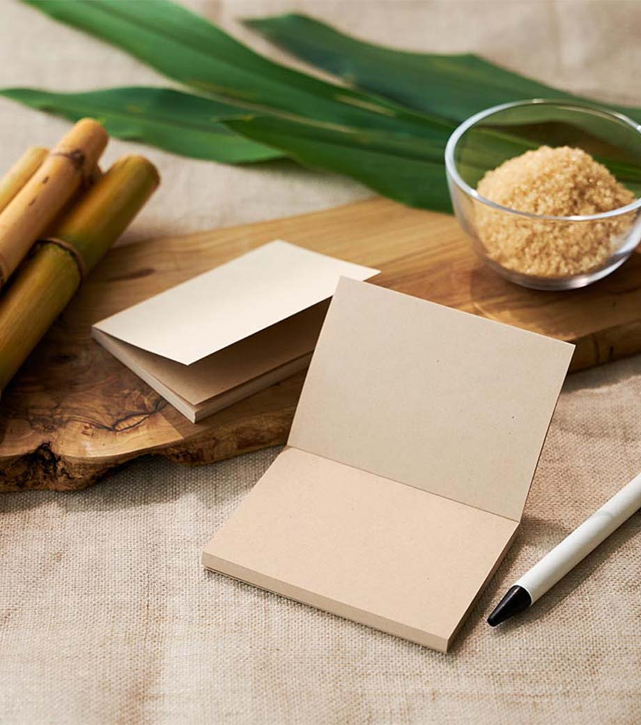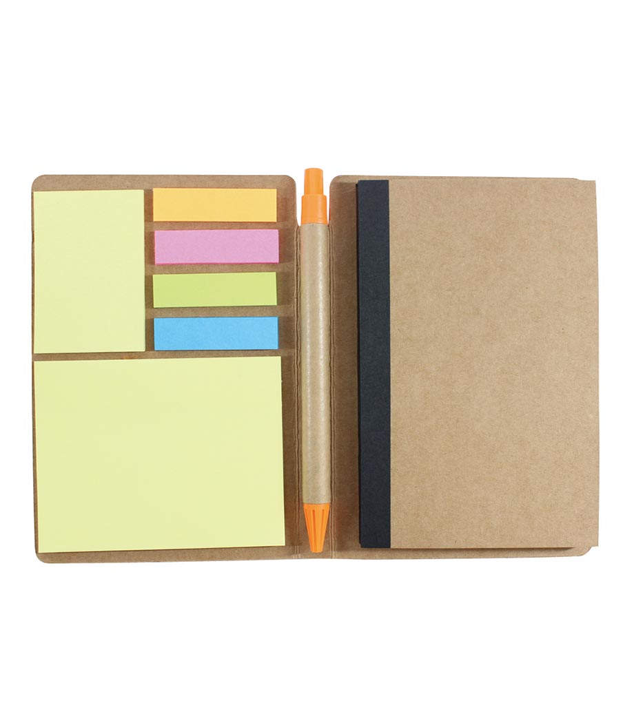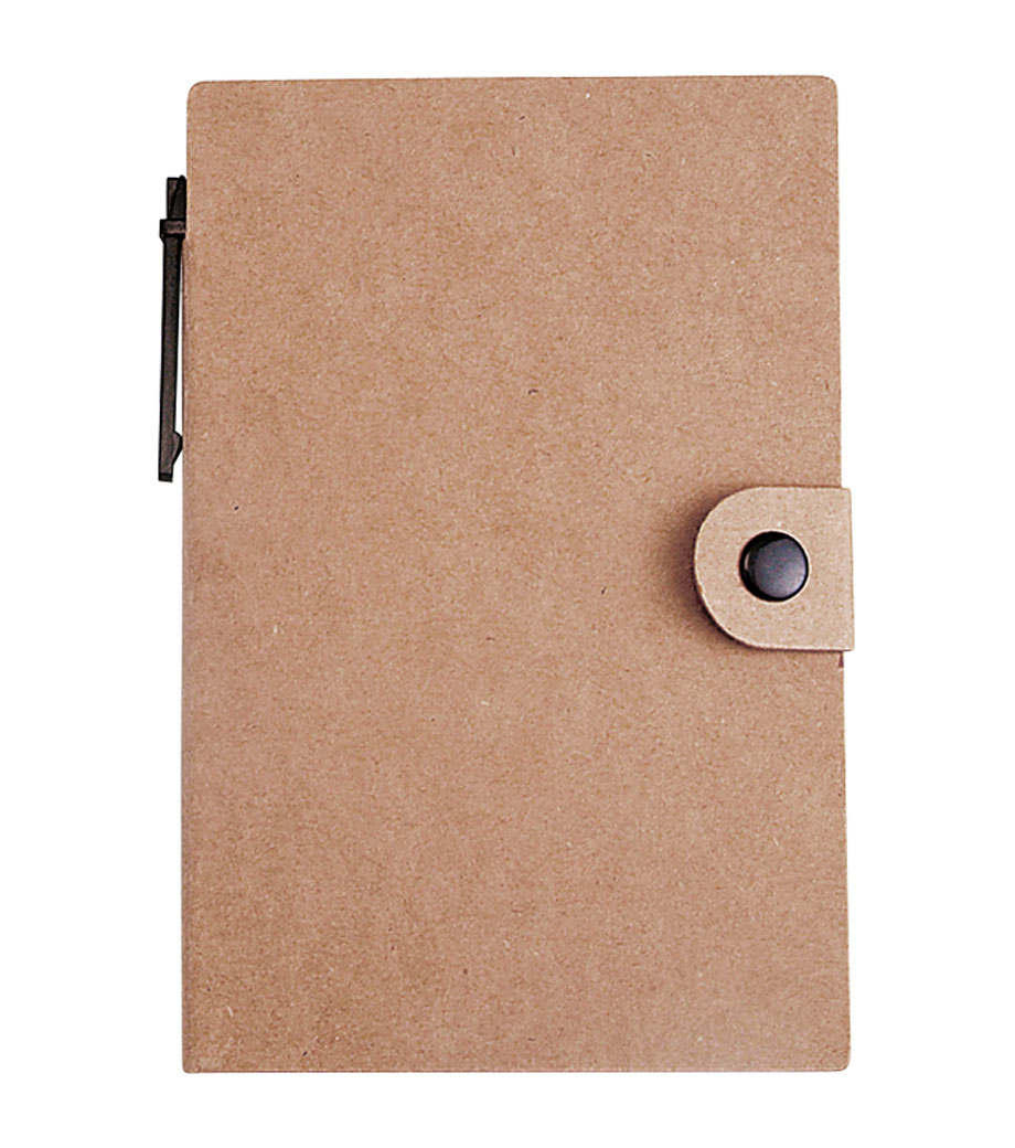 A6エコメモノートは中小2サイズの付箋が付いた再生クラフト紙表紙のノートセットです。サイズ約14cmのボールペン付きで、これ一つでメモ書きが完了!無地の再生紙メモも約50枚付いているので、会議や打ち合わせにこれ一つ持っていけばばっちりですね。