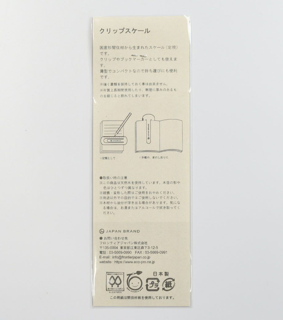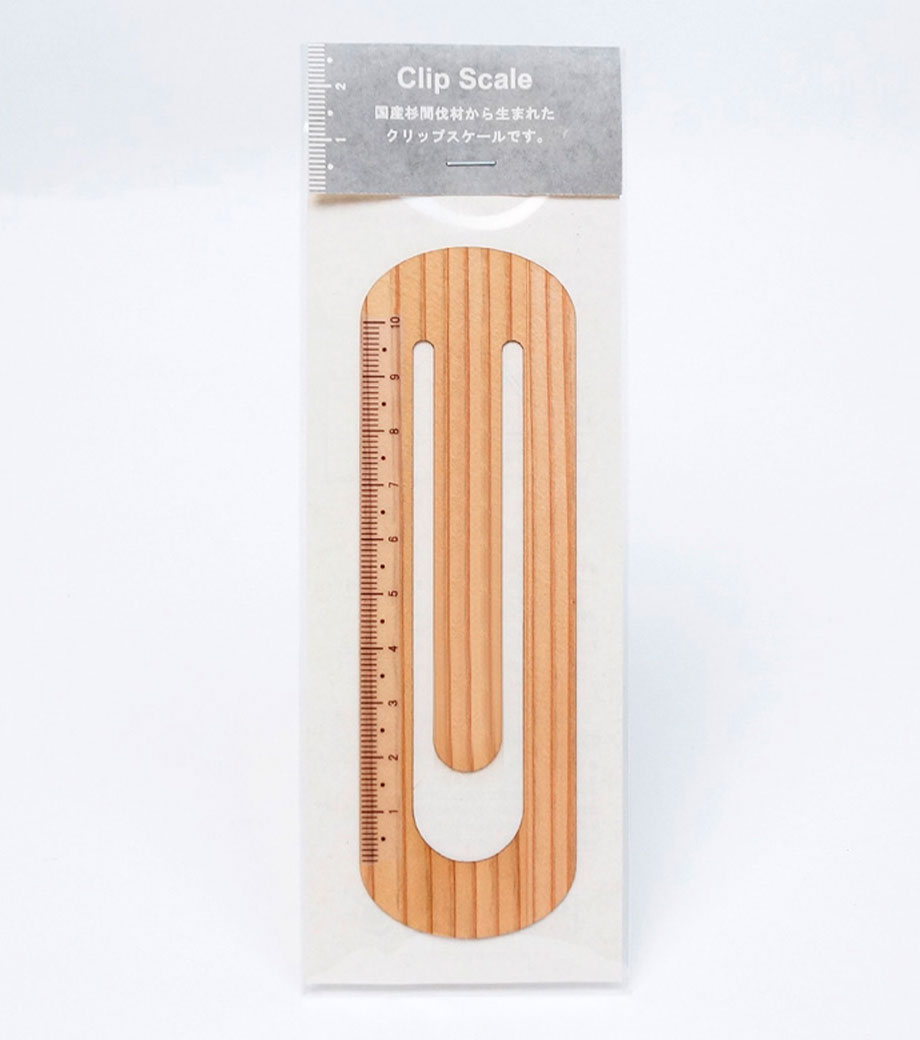 クリップスケールは国産杉の間伐材で作られた定規。軽く薄型コンパクトで持ち運びに便利です。本のしおりとしても使用できます。しなやかな本体は、ページに跡をつけません。天然樹木を使用しているので、木目や色の違いが個々に違いオリジナリティが楽しいノベルティです。
