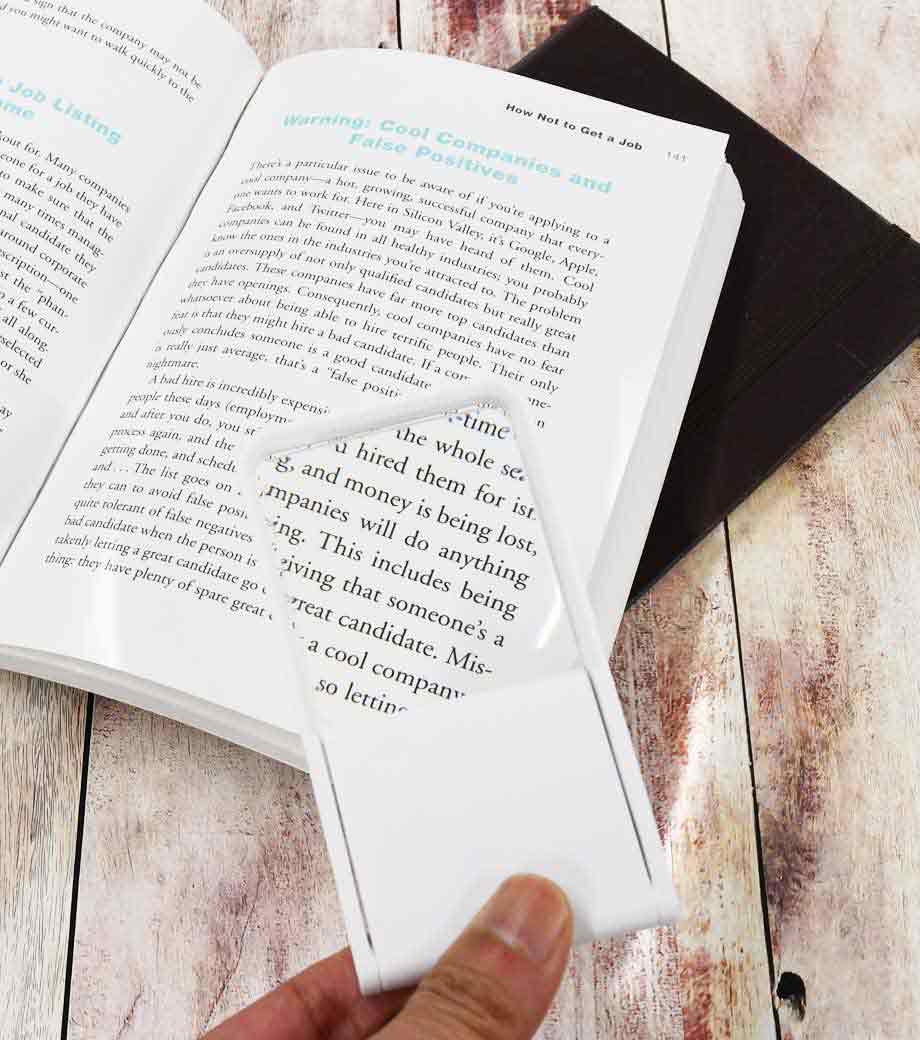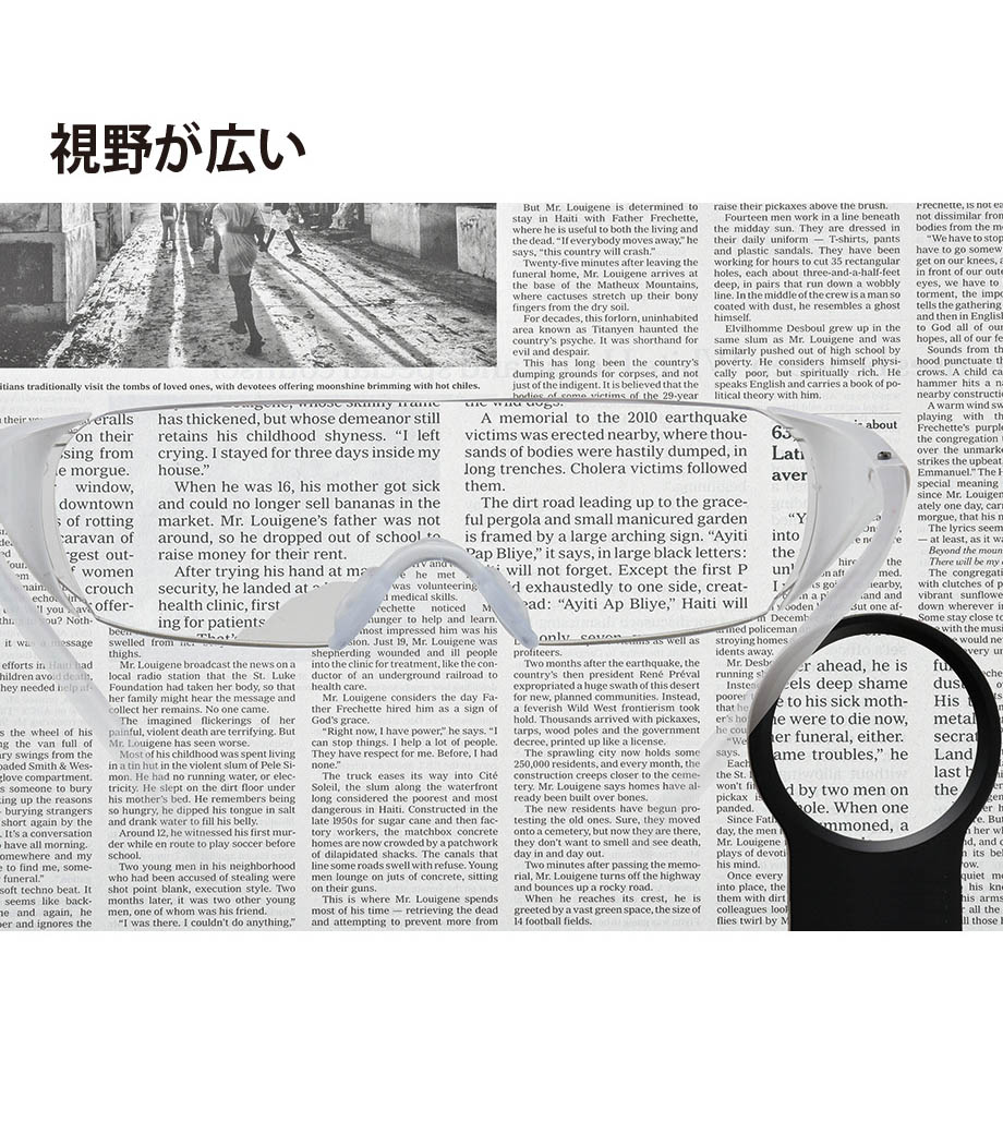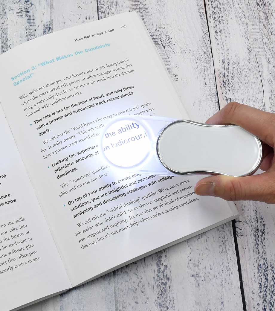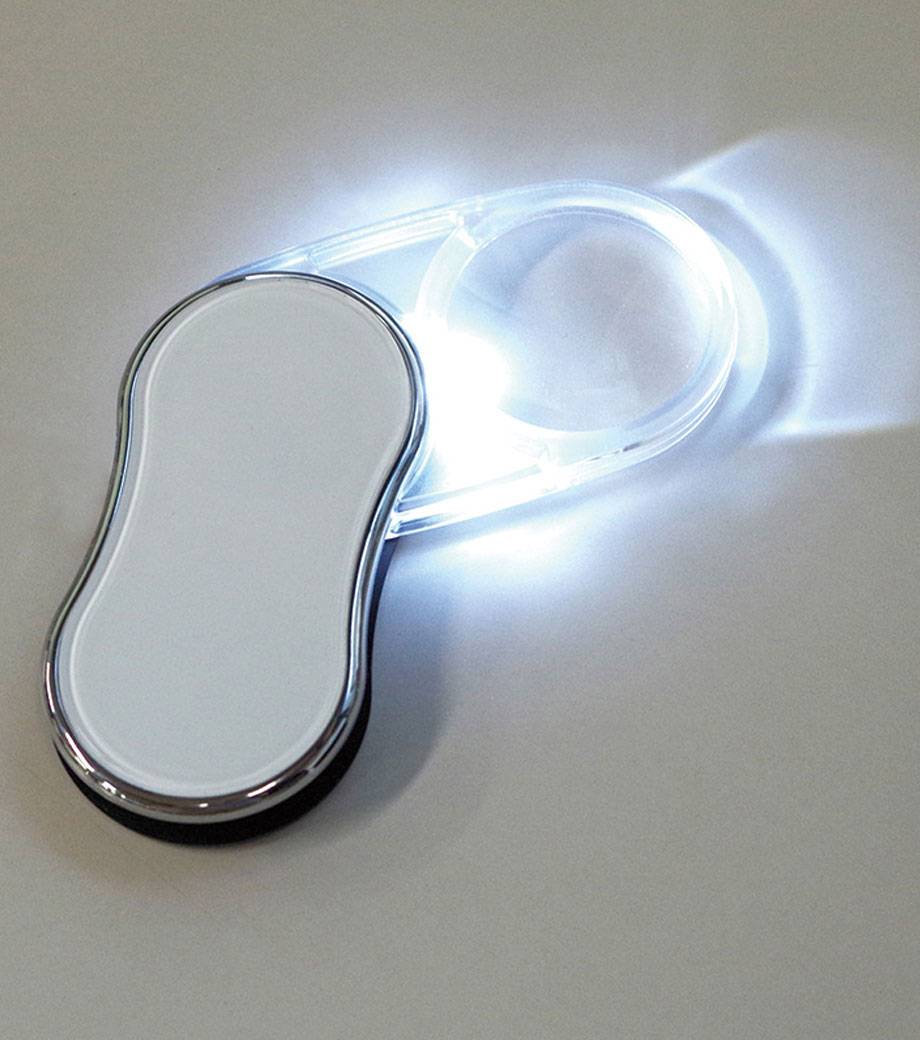 スライドルーペは、レンズをスライドさせるとライトが自動的に点灯するルーペ。夜は目の疲れで、文字がぼやけて見えにくく困ったことはありませんか?薄暗いレストランのメニューをご覧になるときや、外出先で案内板の細かい字を読むとき、就寝前ベットの中でメールを読むときなどに重宝する便利なルーペです。コンパクトなので、洋服のポケットに入れておけば使いたいときにさっと取り出して、小さな文字を楽に見ることができますよ。