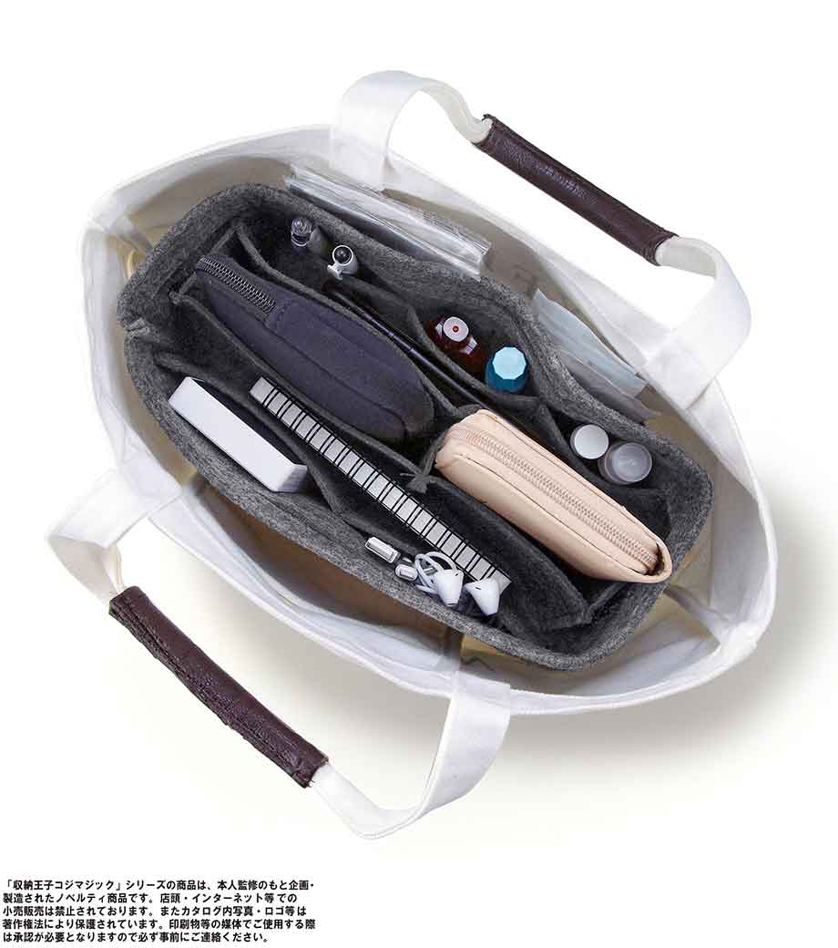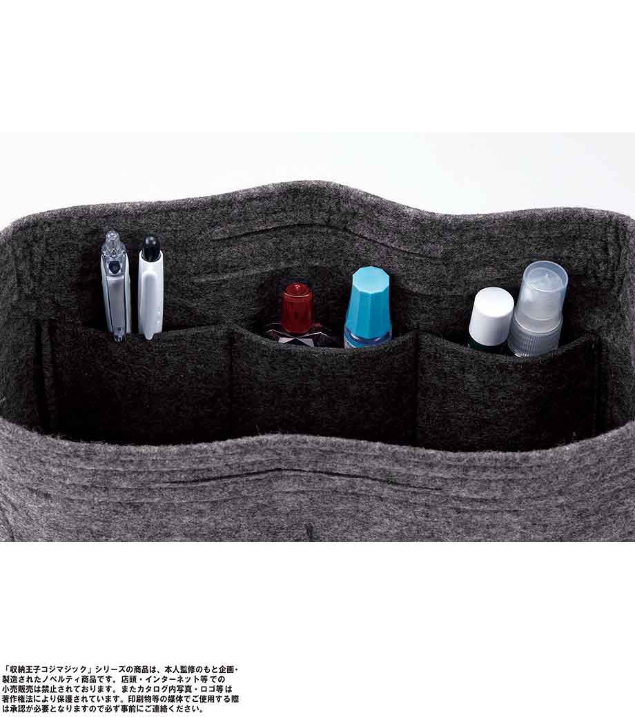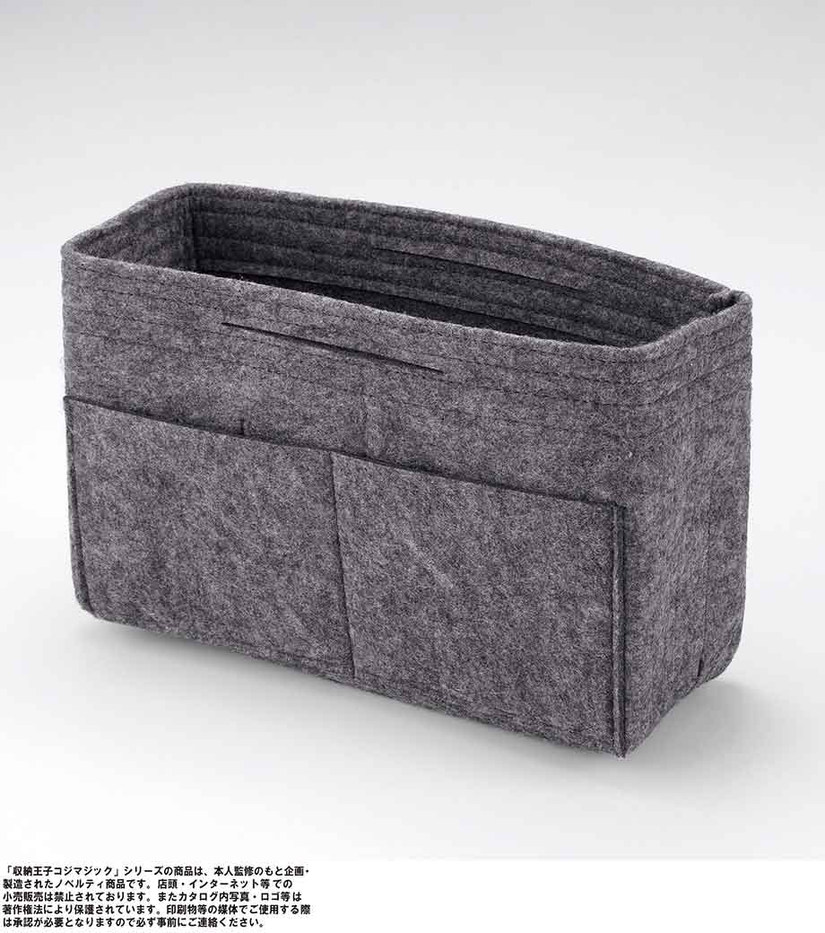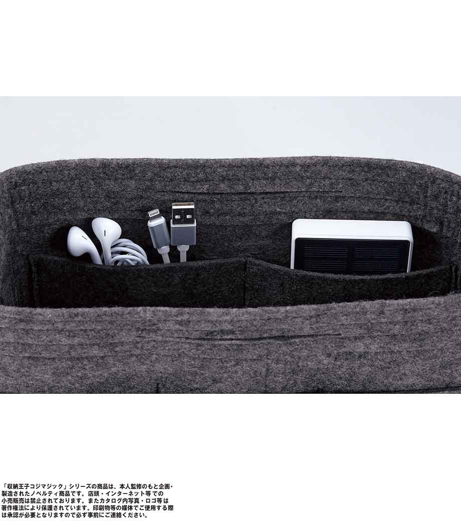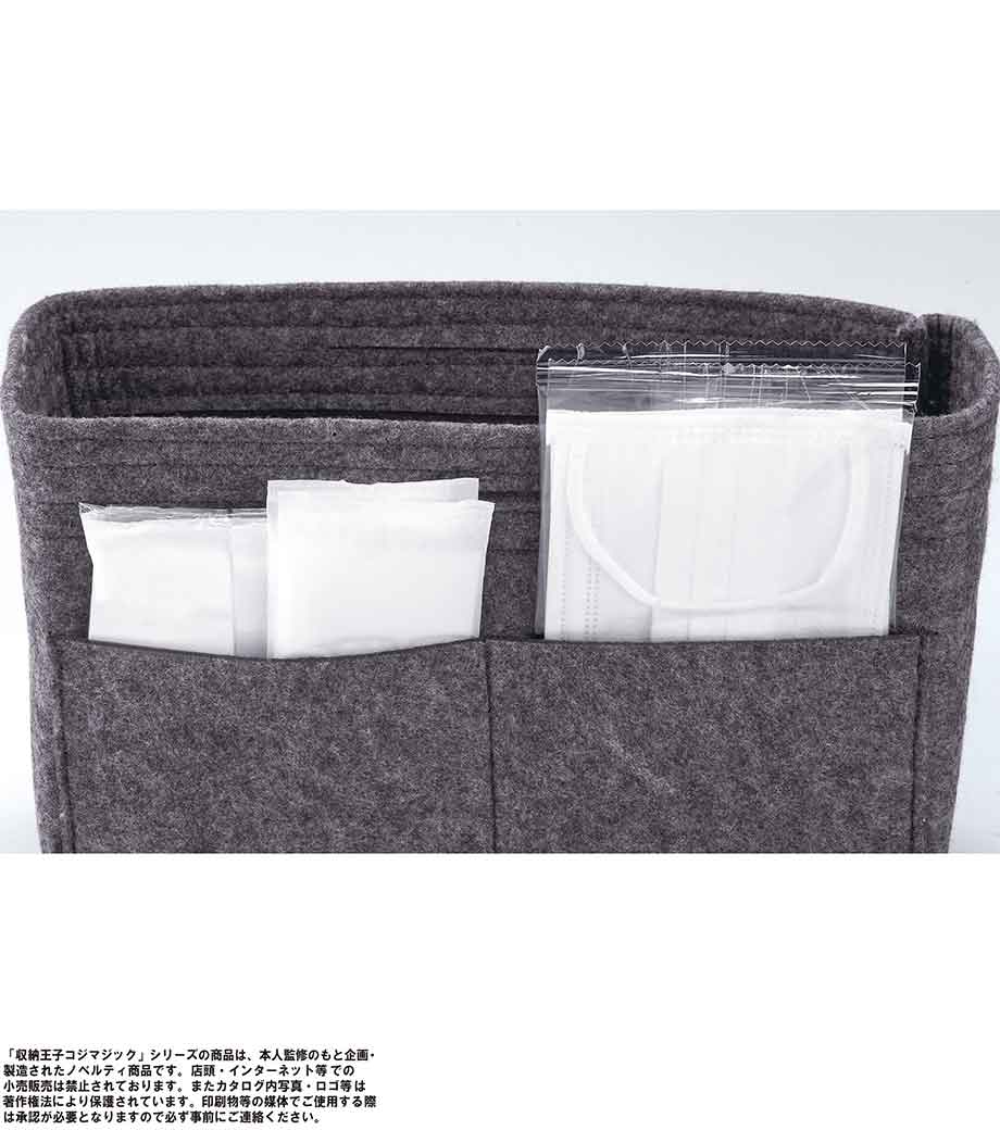 収納王子コジマジック・スマートバッグインバッグは、中身が一目でわかる分別力が魅力のバッグです。内側は取り外し可能な仕切りで3分割されているので、アイテムサイズに合わせて調整でき、収納力抜群。7つのポケットにはスマホや鍵・マスクなどが小分けに入れられます。フェルト生地で重さはわずか約120g。自立するので家のリビング収納やメイク道具の整頓にも使えます。