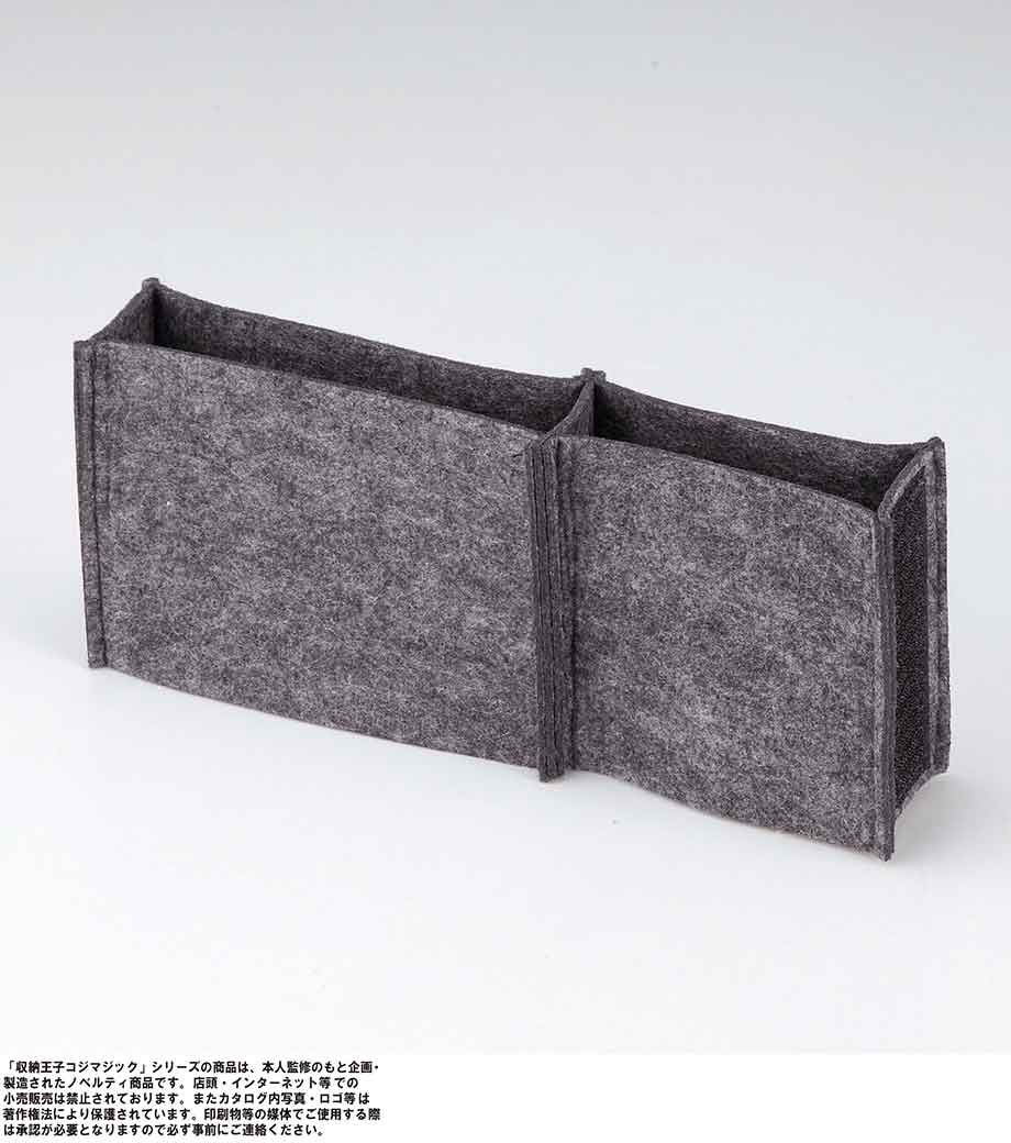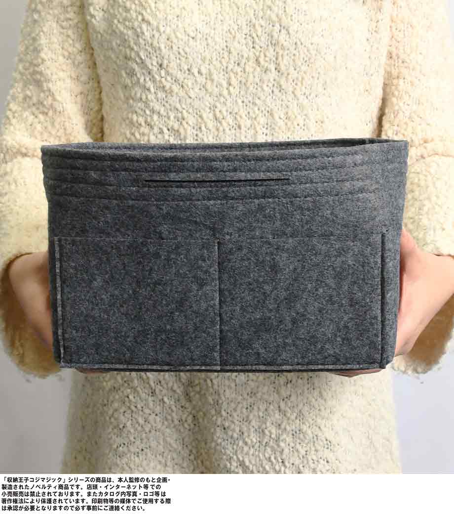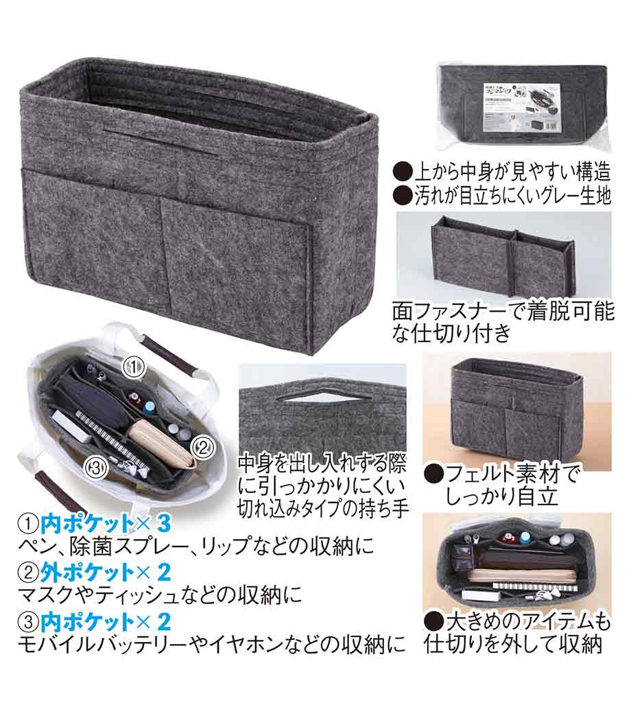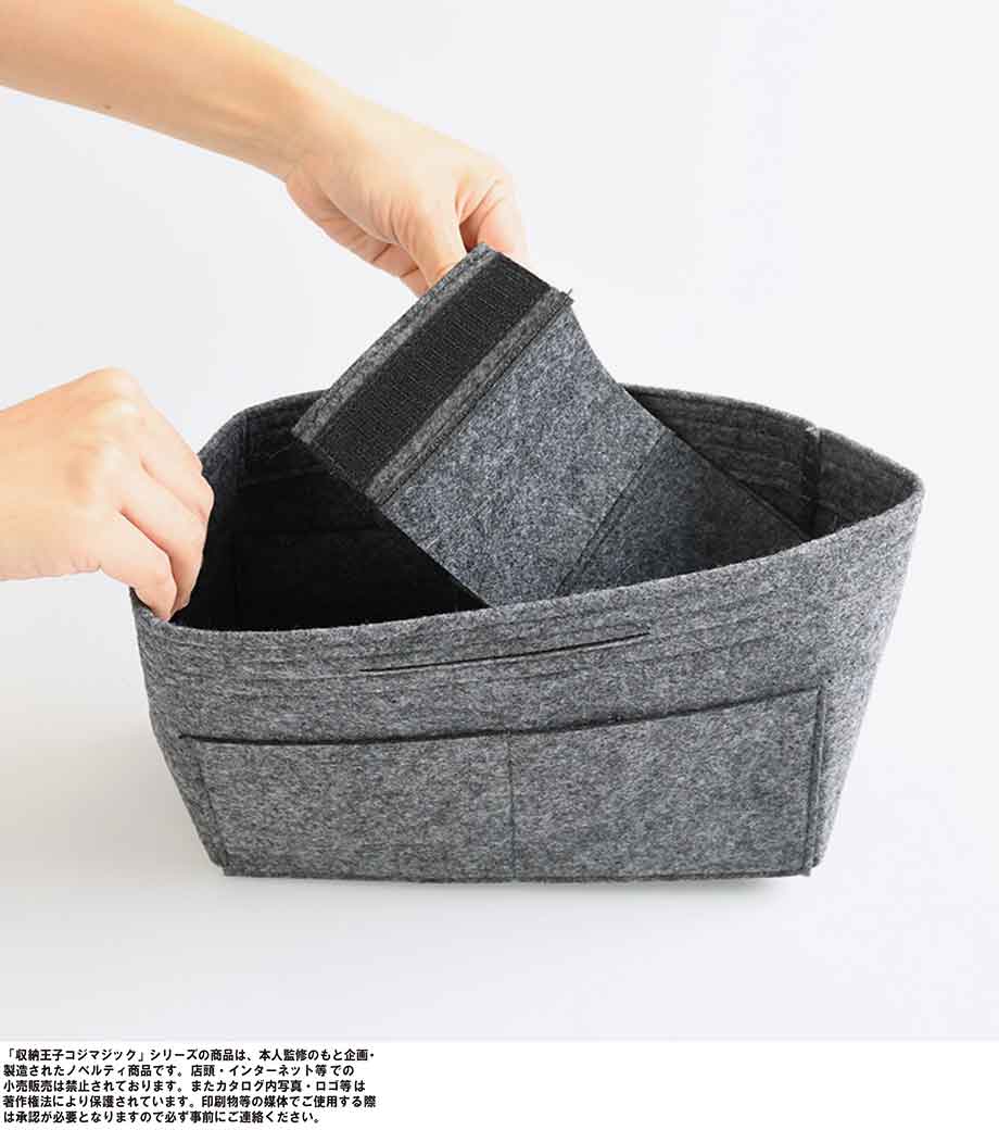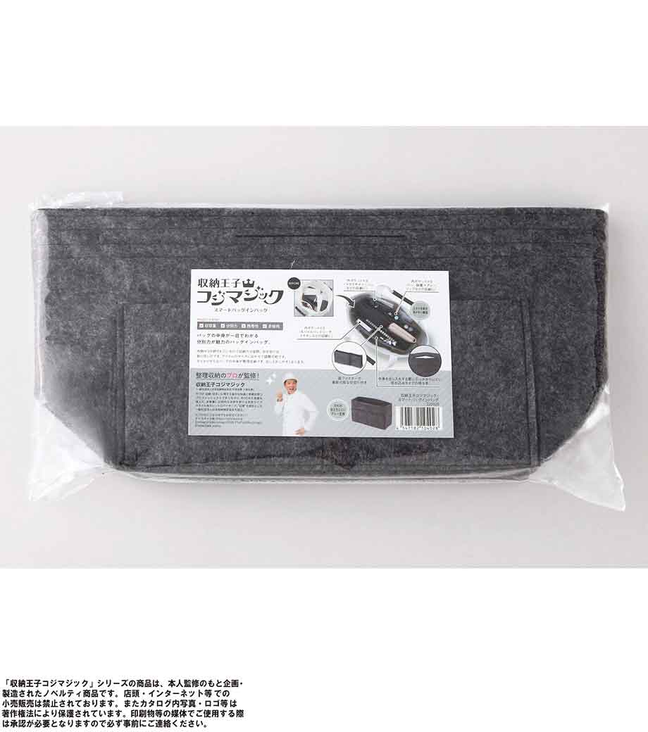 収納王子コジマジック・スマートバッグインバッグは、中身が一目でわかる分別力が魅力のバッグです。内側は取り外し可能な仕切りで3分割されているので、アイテムサイズに合わせて調整でき、収納力抜群。7つのポケットにはスマホや鍵・マスクなどが小分けに入れられます。フェルト生地で重さはわずか約120g。自立するので家のリビング収納やメイク道具の整頓にも使えます。