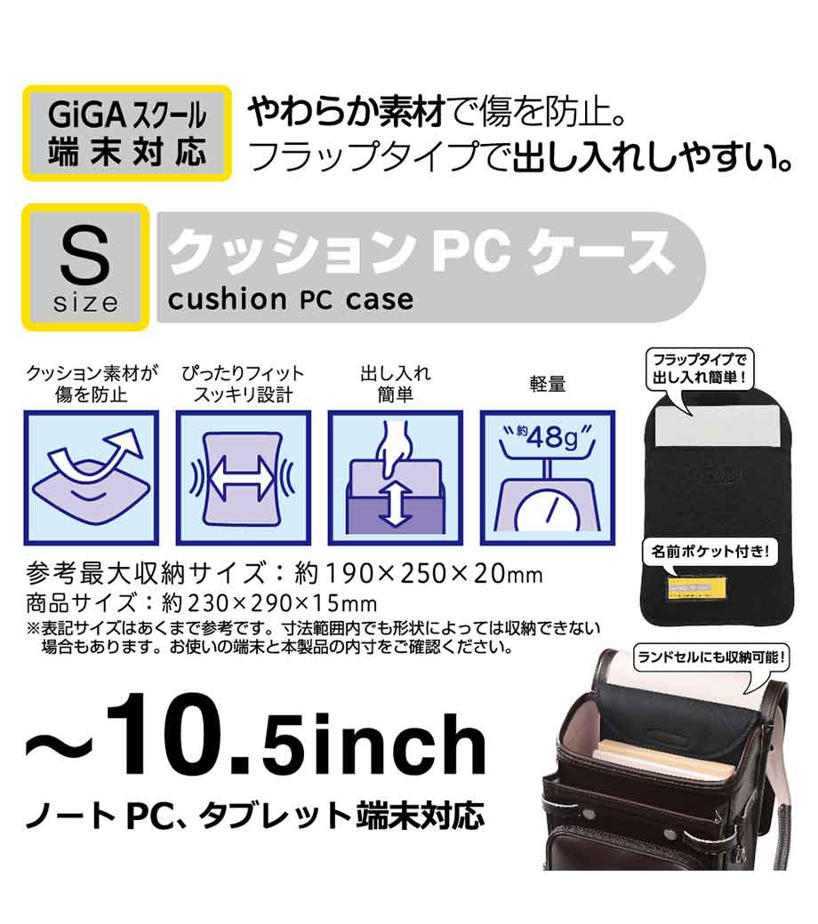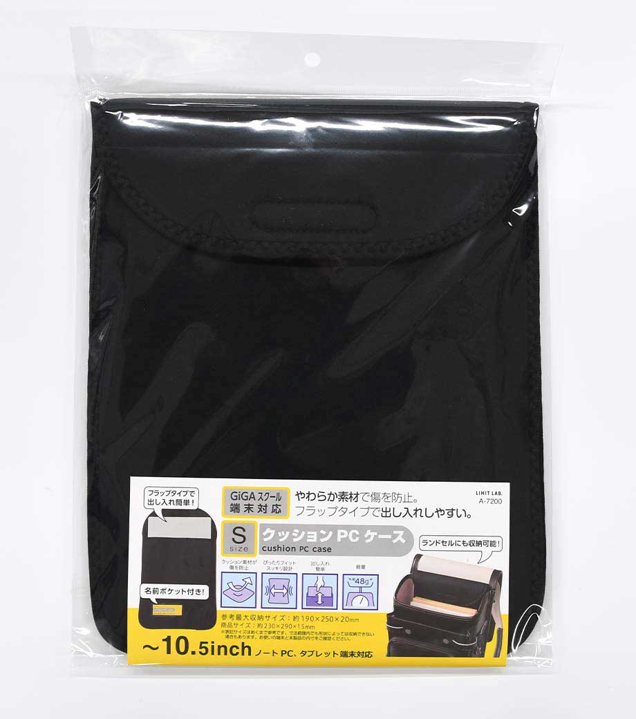 クッションPCケース(Sサイズ)は、10.5インチまでのノートPC・タブレット端末を収納できるケースです。柔らかく弾力のあるウレタン素材で、クッション性抜群。卵1個よりも軽い約48g!毎日の持ち運びが楽々ですね。縦型収納はランドセルへの出し入れもしやすく、かさばらないフラットタイプ。開け閉めも簡単な面ファスナーで厚みやサイズによって調整可能です。
