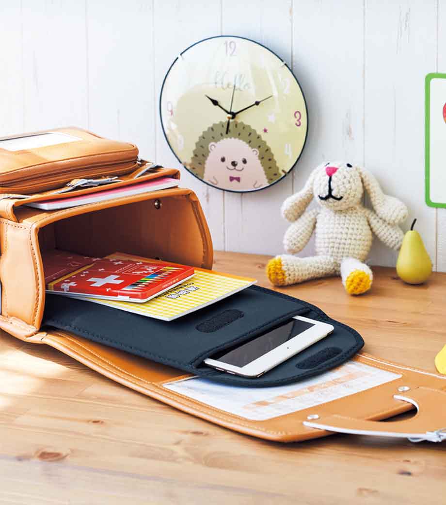 13インチまでのノートパソコンやタブレットを収納できるモバイルバッグ。内側にはタブレット用の大きなポケットのほか、メモやケーブルを整理できるメッシュポケットと、A4サイズの資料が入る大きめポケット付きです。ランドセルにも入るスリム設計で、小学生のお子さまの通学にも便利。持ち手付きで持ち運びも快適です。