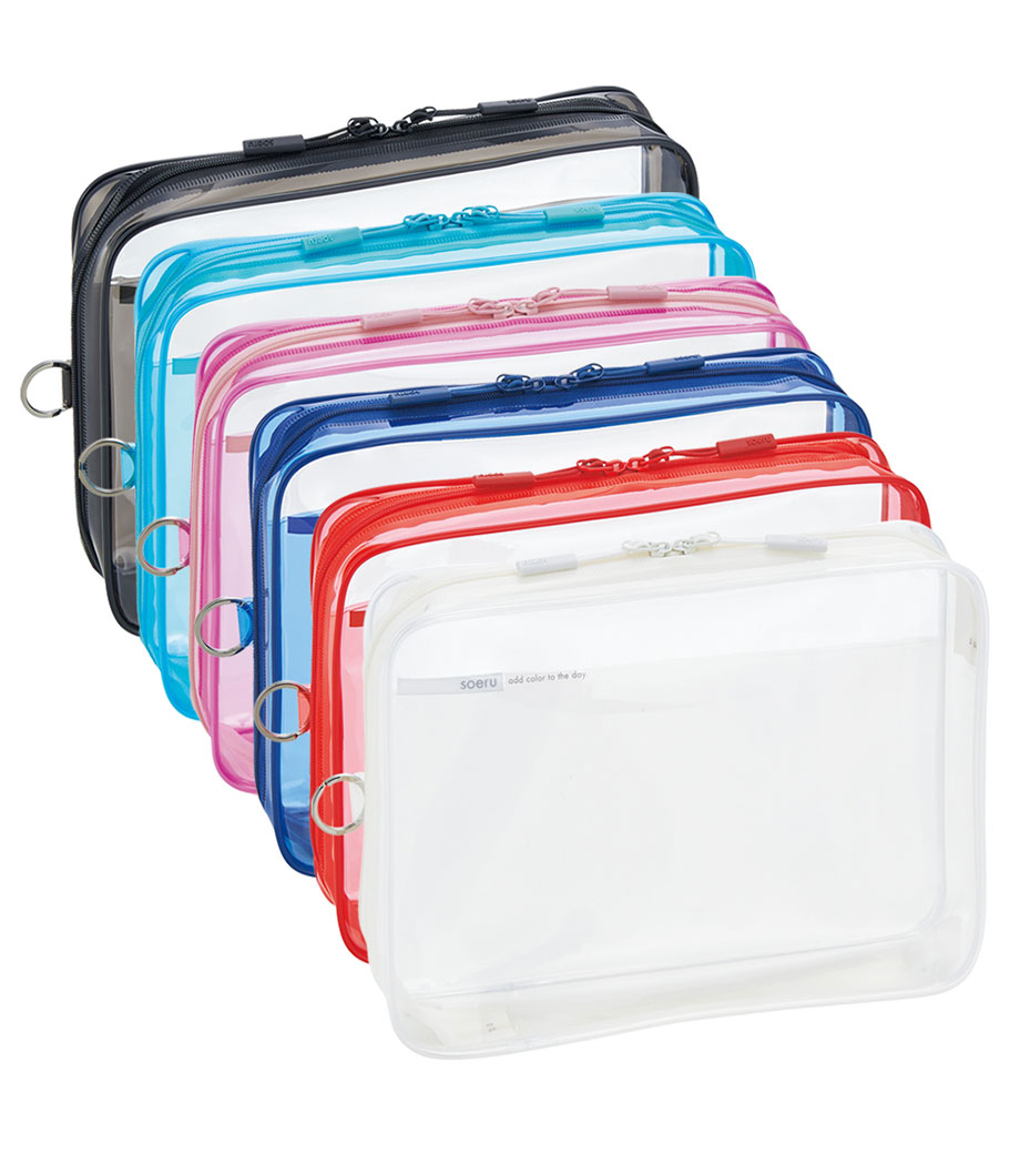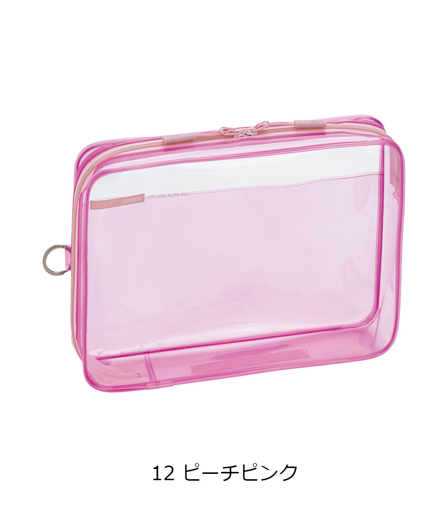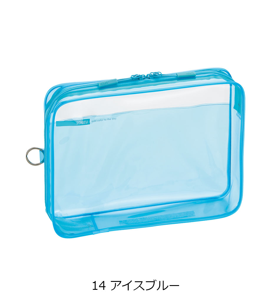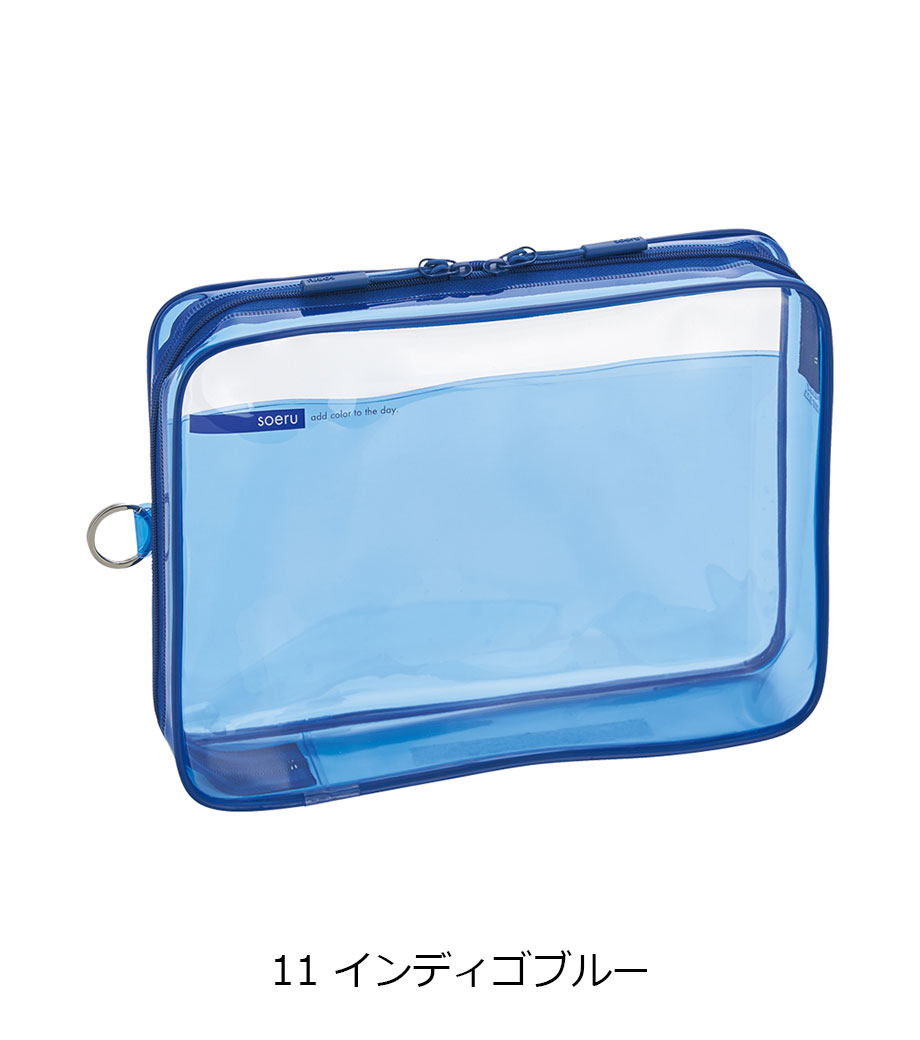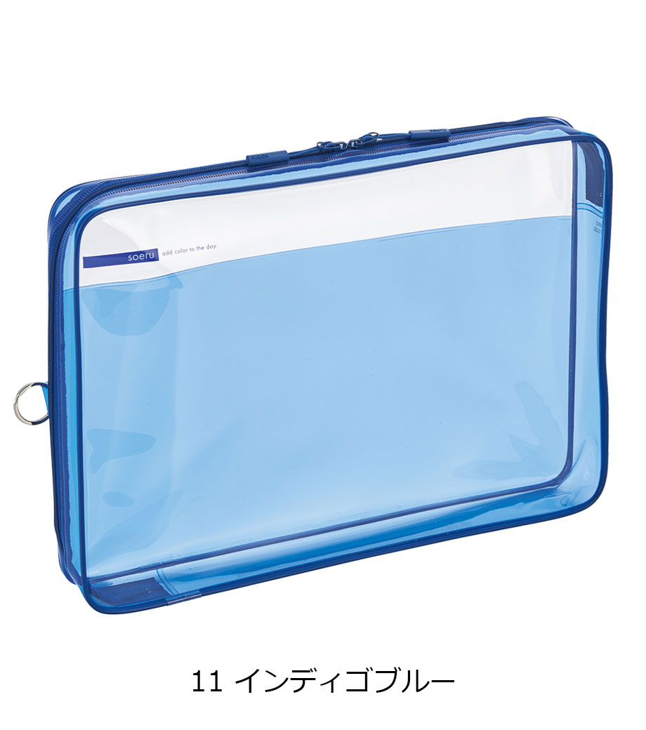 リヒトラブ soeru クリヤーボックスケース A5は、L字に大きく開いて出し入れしやすいケースです。開閉に便利なダブルファスナーで縦にも横にも使えます。ファスナーと同色の内ポケットがおしゃれなカラーリング。暮らしに彩りを“そえる”文具メーカーLIHIT LAB.(リヒトラブ)の商品です。側面のリングは、吊り下げたりキーホルダーを付けることができます。耐久性があり軽量なPVC素材を使用。A5ノートや手帳、小型タブレットの収納はもちろん、水着ポーチや旅行時のアメニティ入れとしても使えます。